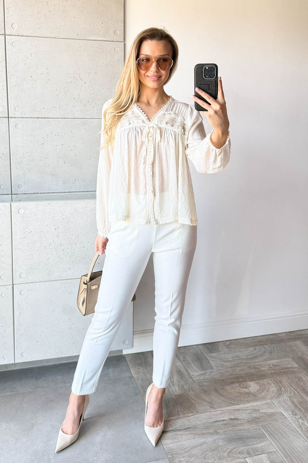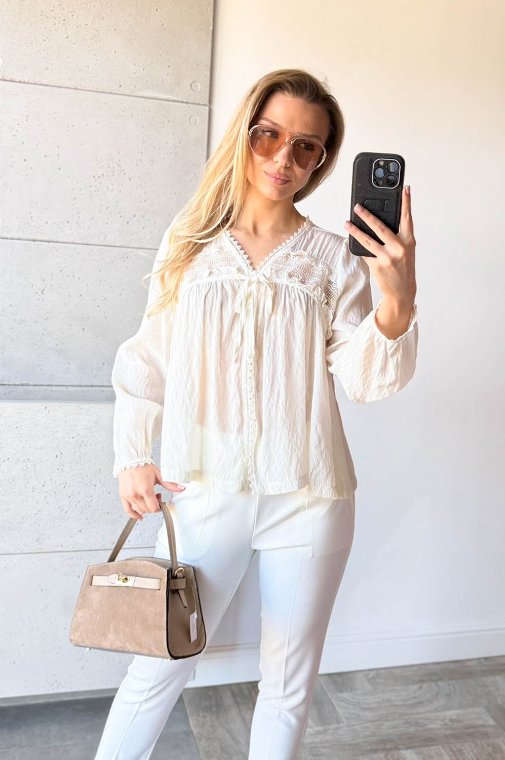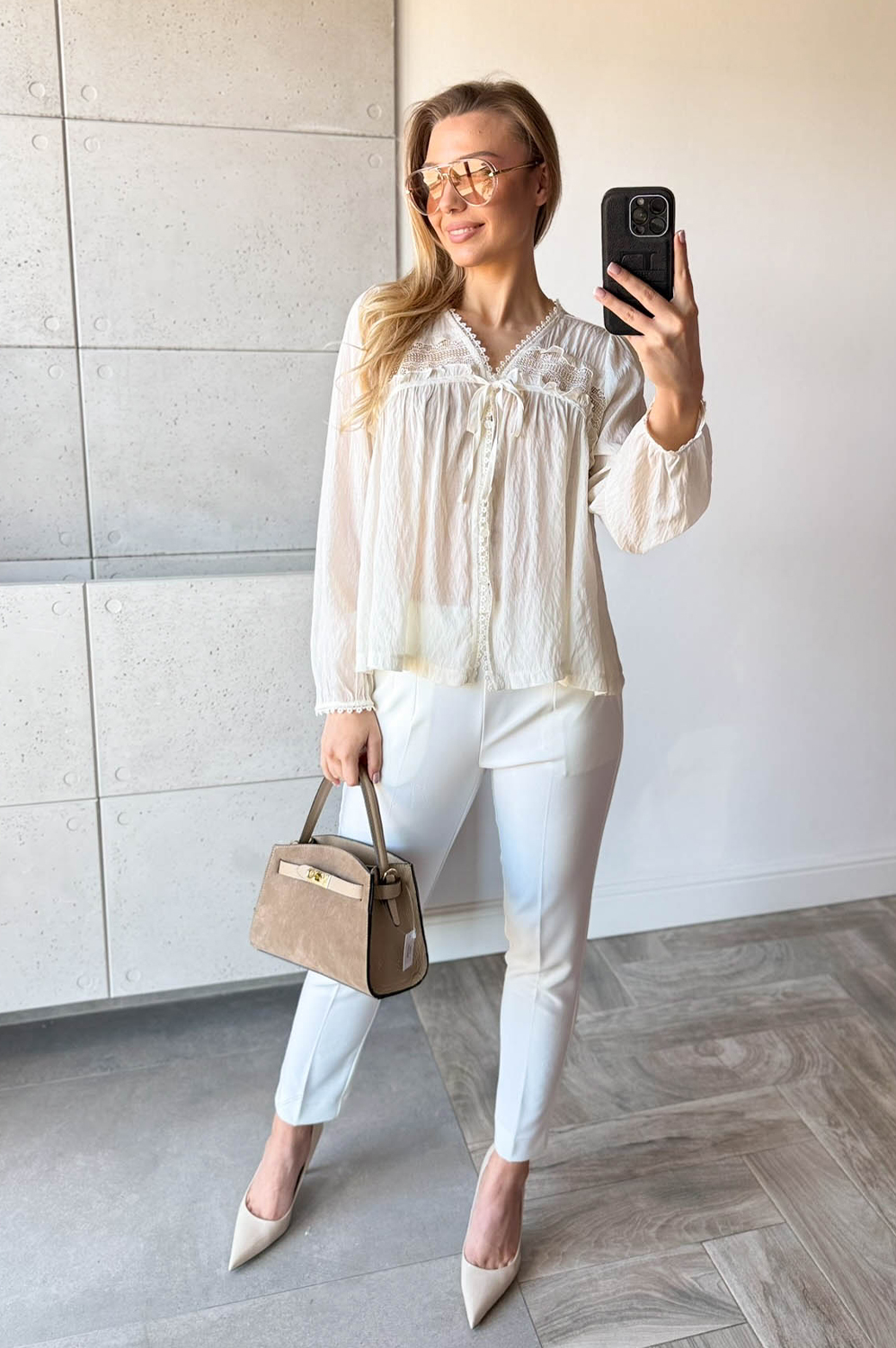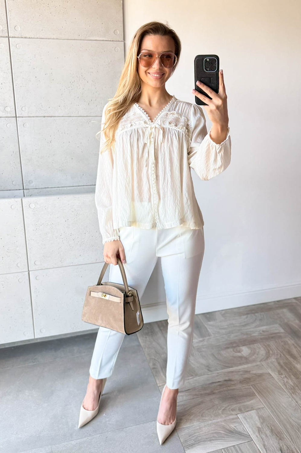Bluzka koszulowa DELIKATNA MGIEŁKA NA GUZICZKI budyń149.00 zł Najniższa cena towaru, która obowiązywała w okresie 30 dni przed zastosowaniem obniżki: 149.00 zł Opis Bluzka wiskozowa z ażurowymi wstawkamy zapinana na guziczki. WYMIARY: Rozmiar uniwersalny. Pasuje na rozmiary XS S M L