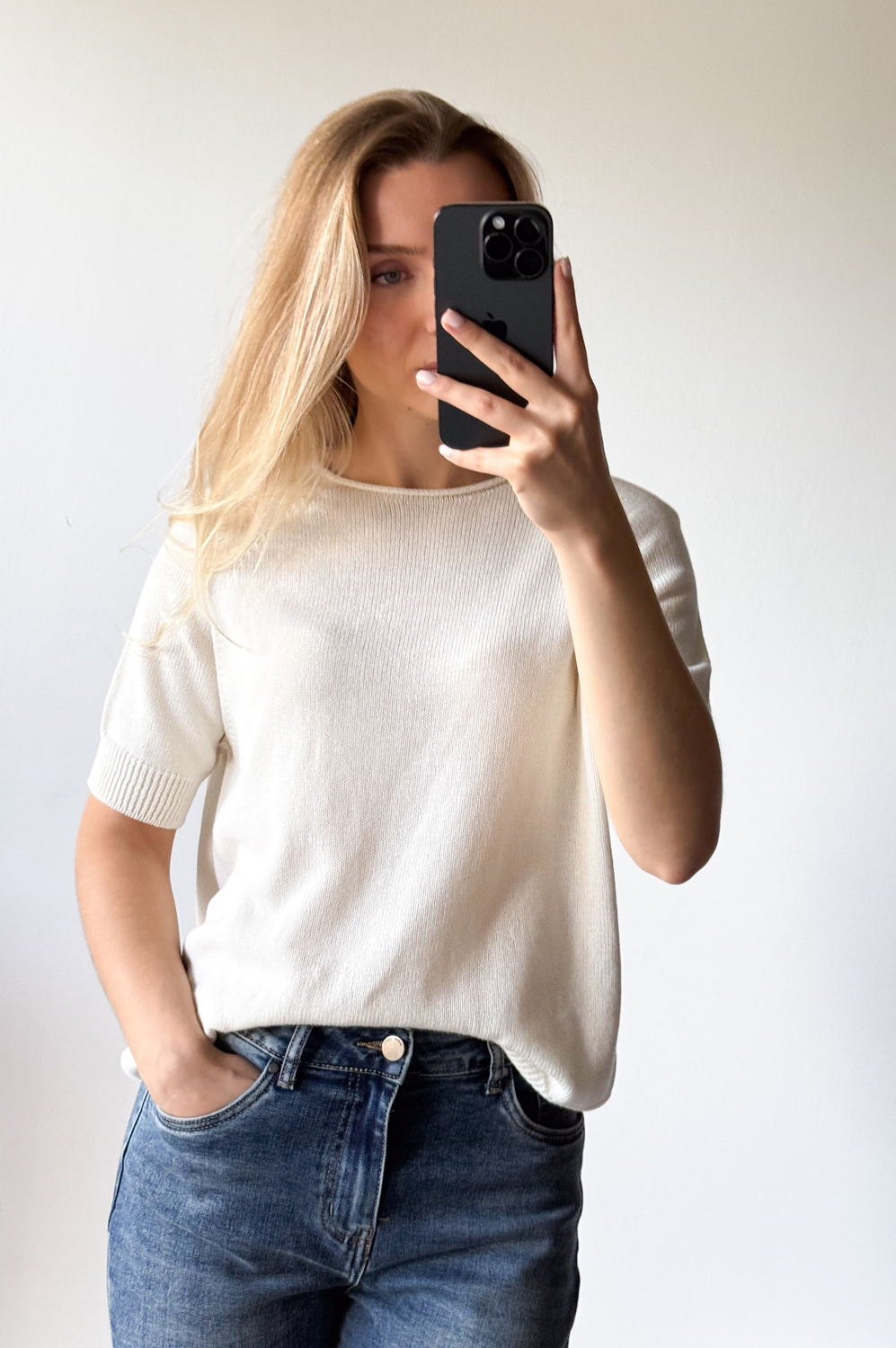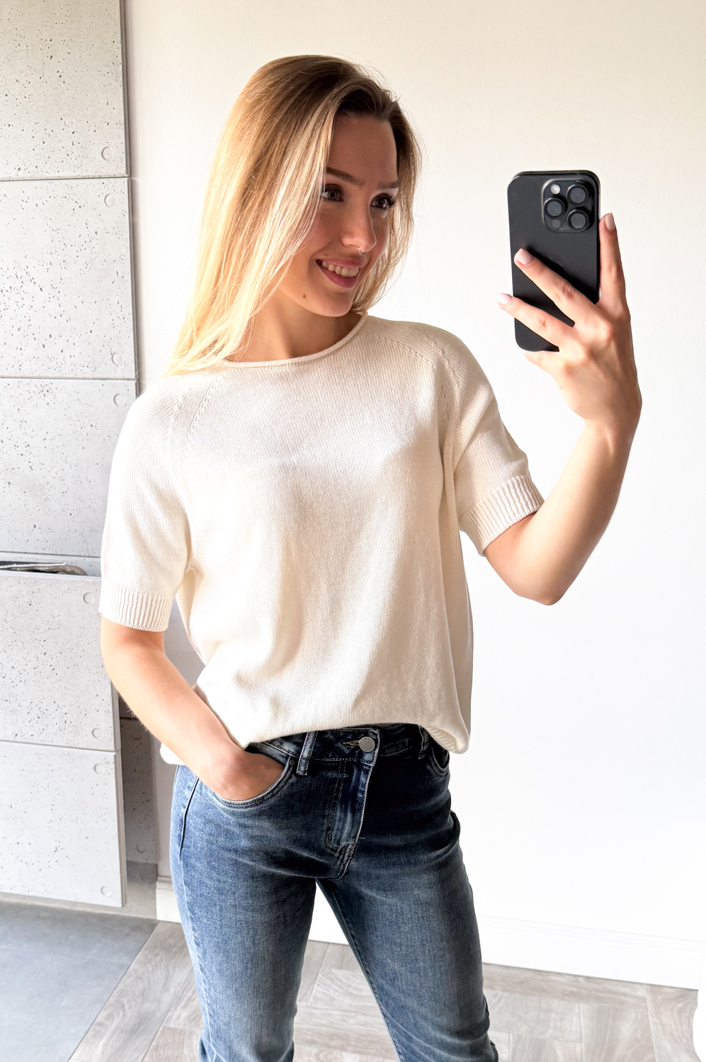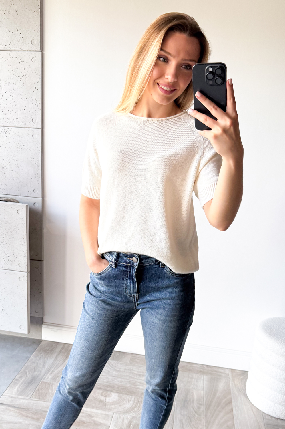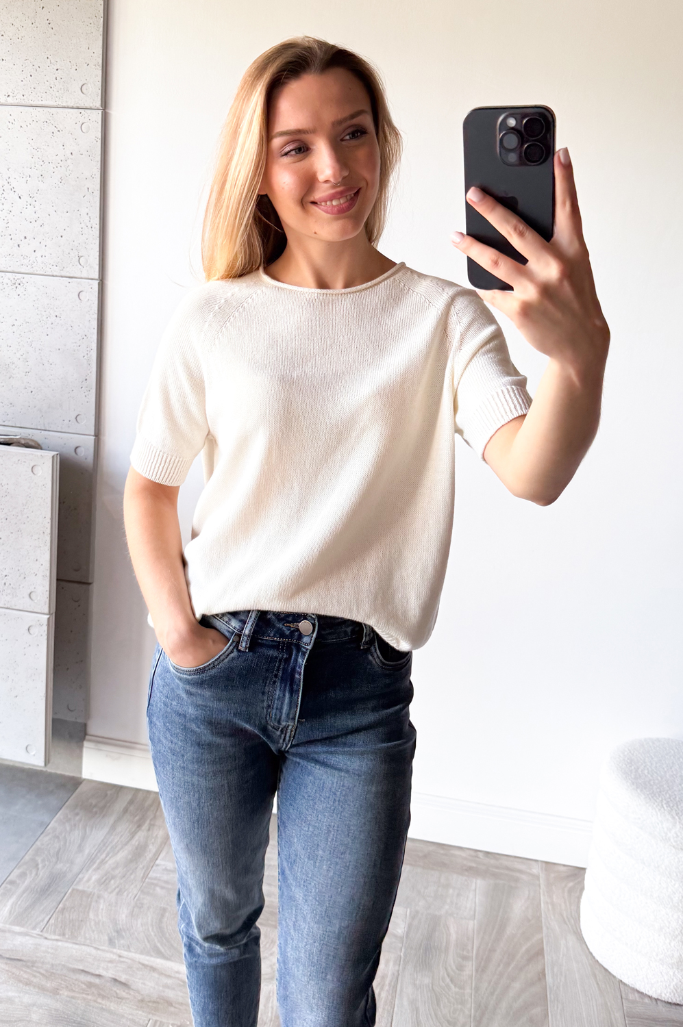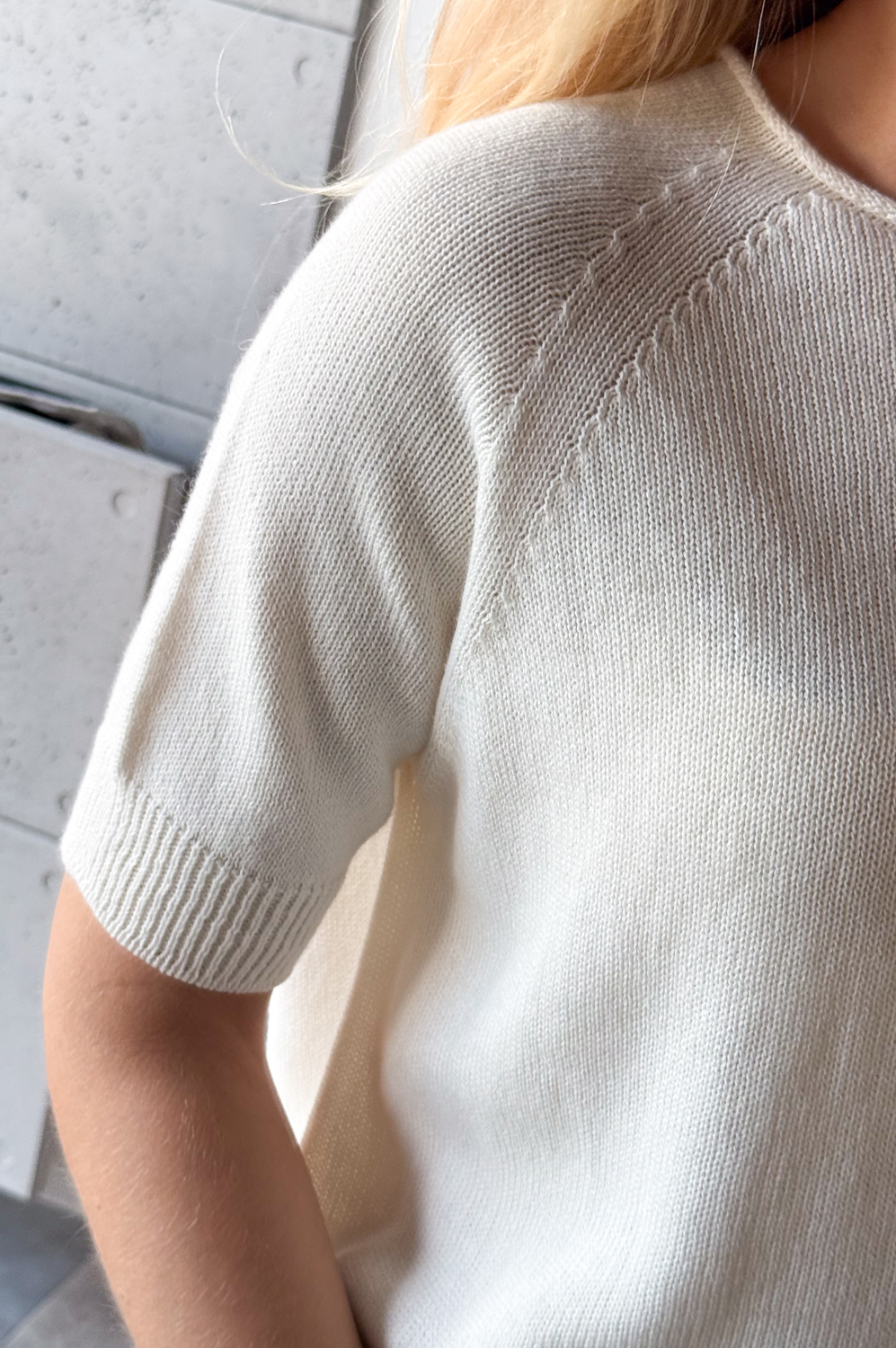 Sweterek raglanowy z krótkim rękawkiem i owalnym dekoltem.