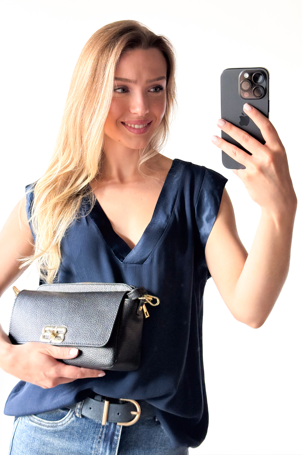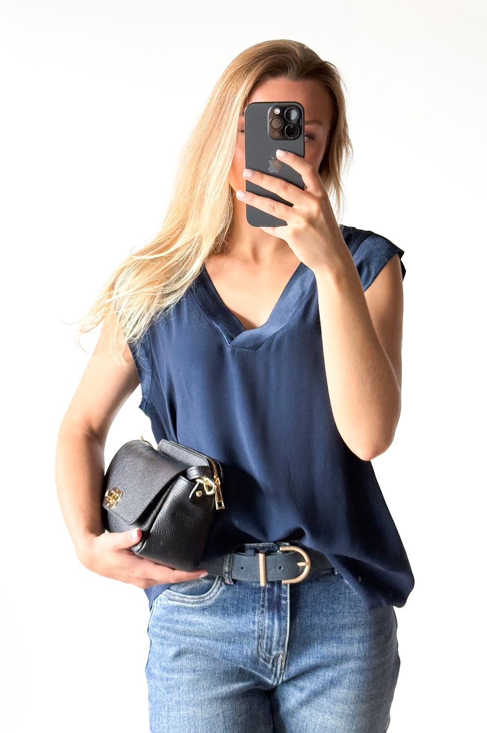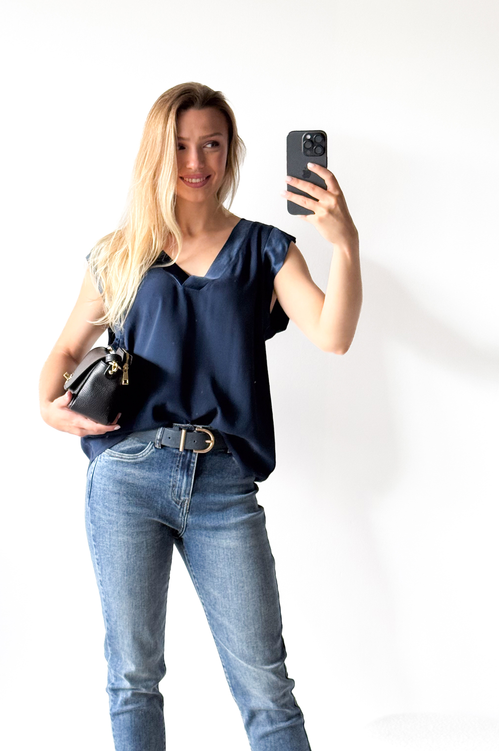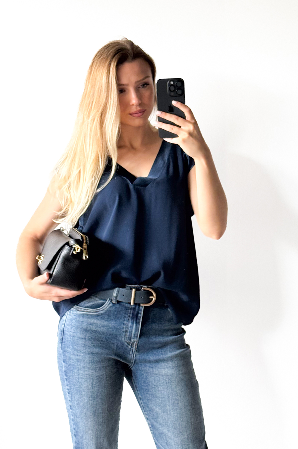 Bluzka V ATŁAS granatowy109.00 zł Najniższa cena towaru, która obowiązywała w okresie 30 dni przed zastosowaniem obniżki: 109.00 zł Opis Świetna bluzka lekko rozkloszowana, z atłasowym dekoltem V, oraz zakładką na wysokości biustu, świetnie nadaje się pod marynarki. WYMIARY: Długość od ramienia: 65 cm, Szerokość na płasko: 108-112 cm.