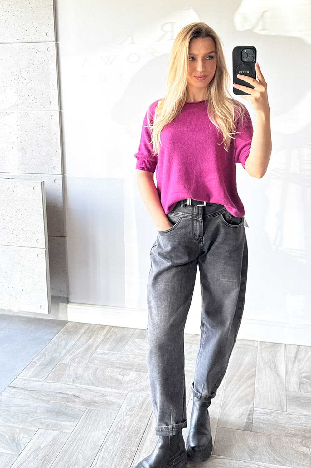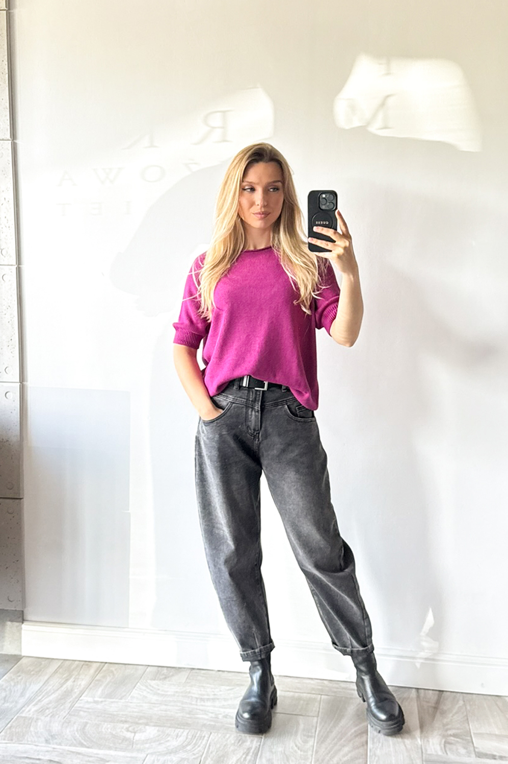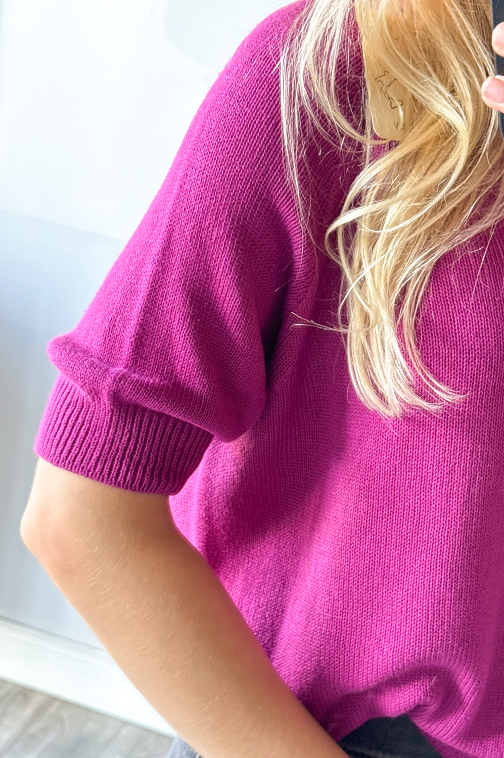 Sweterek RAGLAN COTTON fuksja119.00 zł Najniższa cena towaru, która obowiązywała w okresie 30 dni przed zastosowaniem obniżki: 119.00 zł Opis Sweterek raglanowy z krótkim rękawkiem i owalnym dekoltem. WYMIARY: długość: 62 cm, szerokość: 100-106 cm