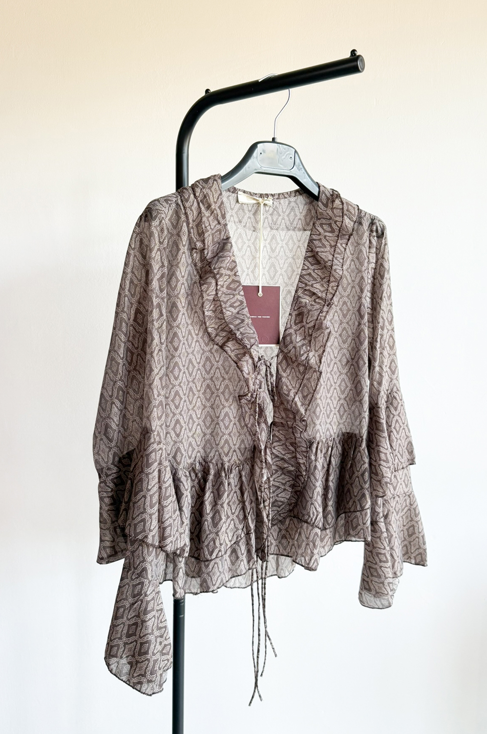 Bluzka z falbankami, taliowana, z przodu wiązana na znureczki. Koszula jest wykonana z cieniutkiej tkaniny.