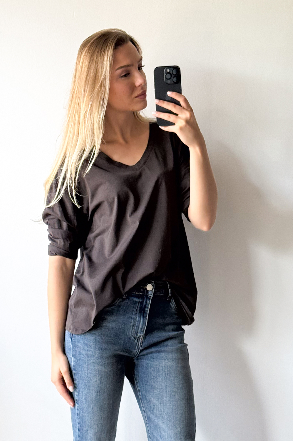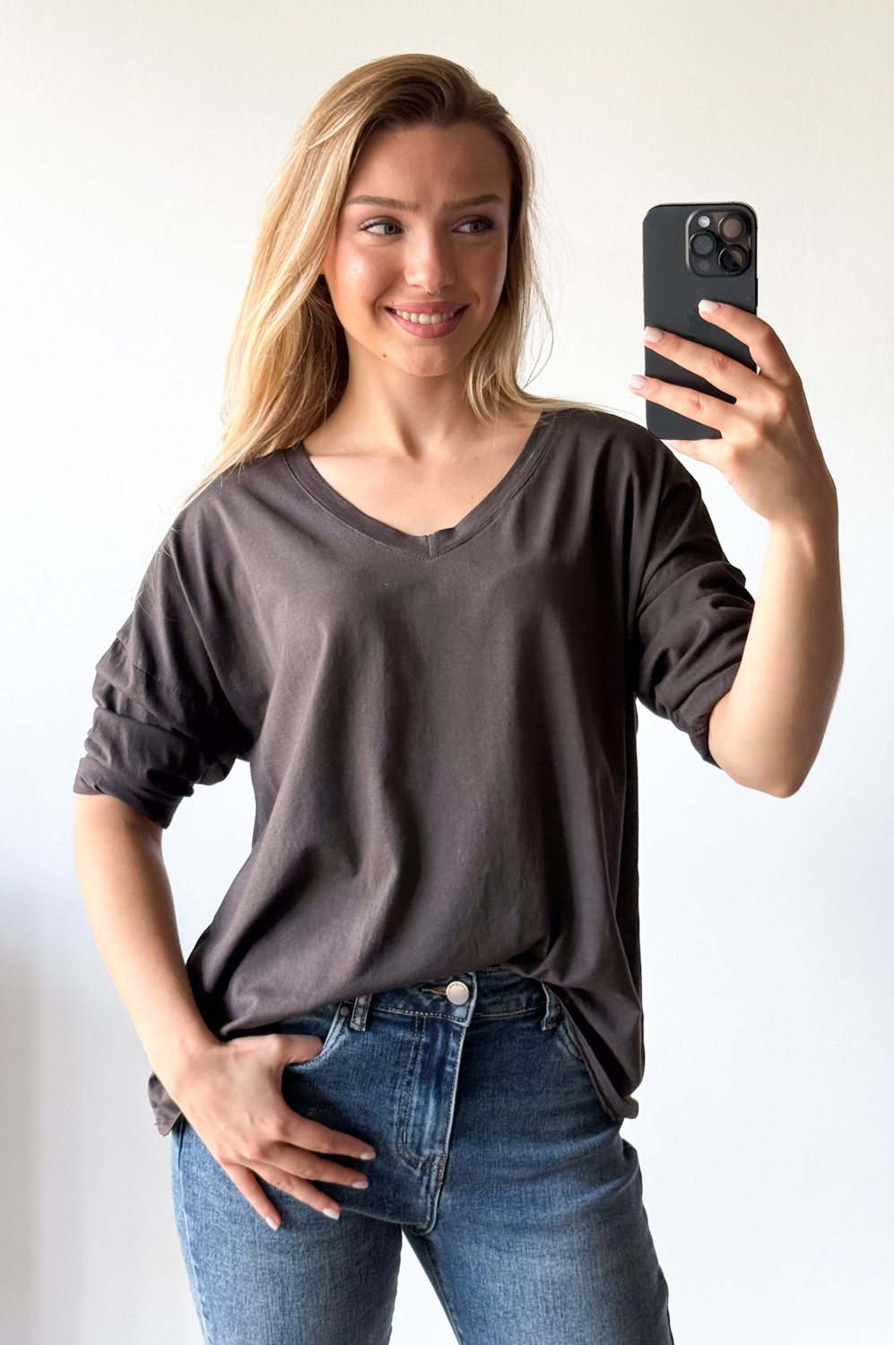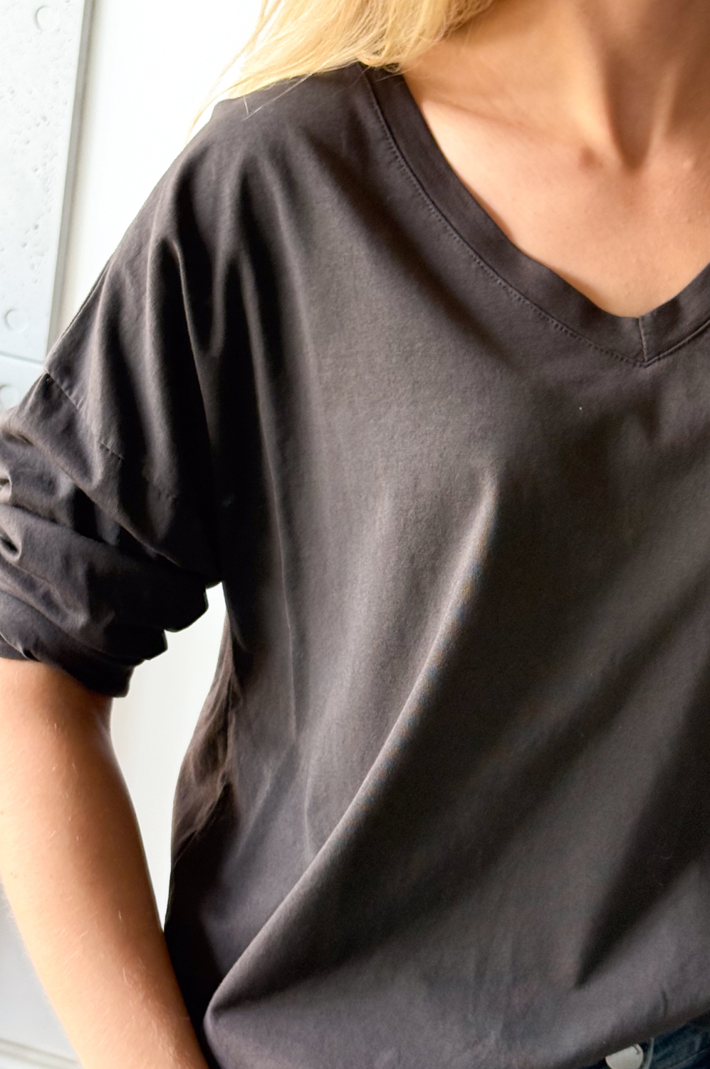 Bluza DELIKATNA BAWEŁNIANA :) gorzka czekolada119.00 zł Najniższa cena towaru, która obowiązywała w okresie 30 dni przed zastosowaniem obniżki: 119.00 zł Opis Klasyczna bluza w szpic. WYMIARY: długość: 62 cm, szerokość: do 140 cm