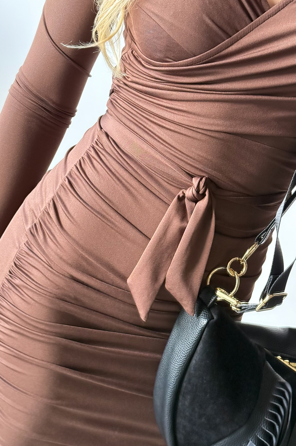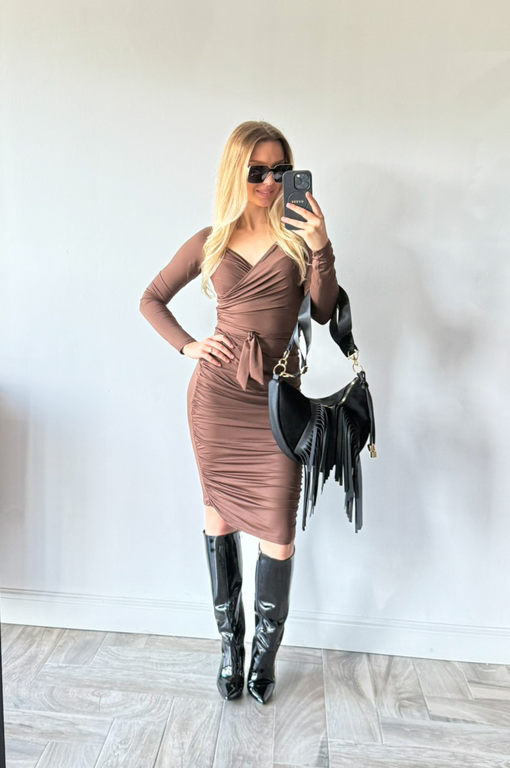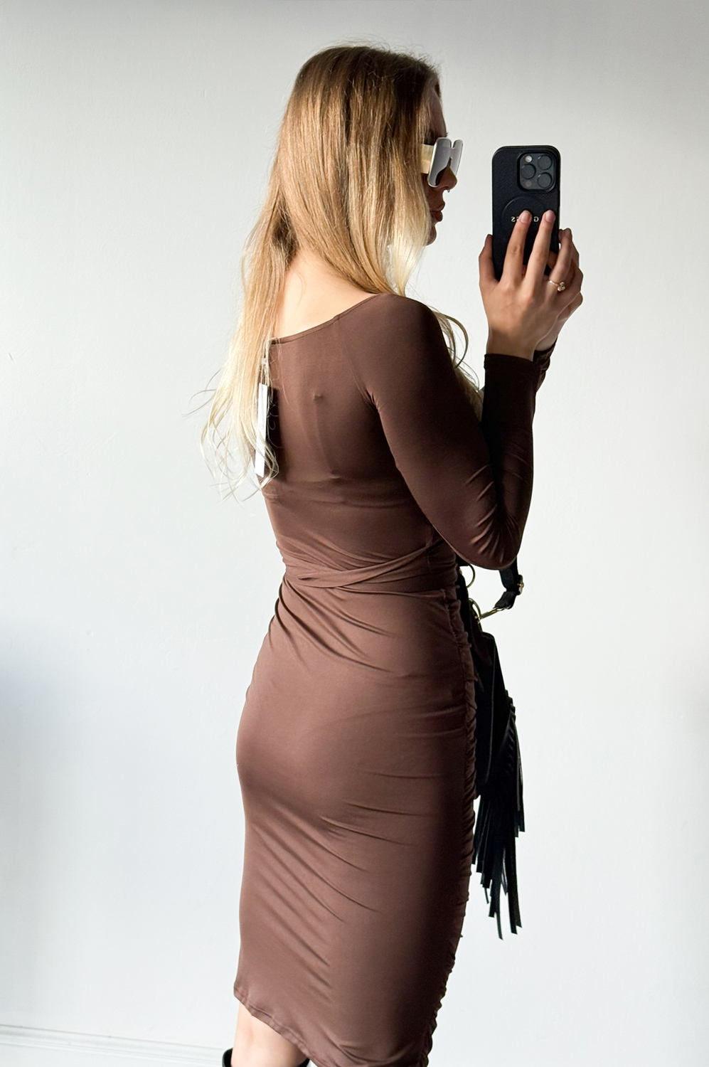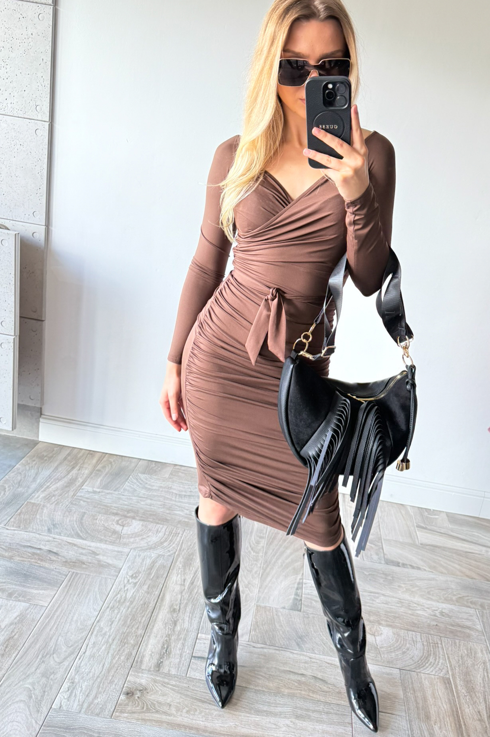 Sukienka ZAKŁADANA VENEZIA czekolada179.00 zł Najniższa cena towaru, która obowiązywała w okresie 30 dni przed zastosowaniem obniżki: 179.00 zł Opis Piękna sukienka zakładana z marszczeniem w przedniej części idealnie tuszująca brzuszek,materiał elastyczny i miekki. WYMIARY:
