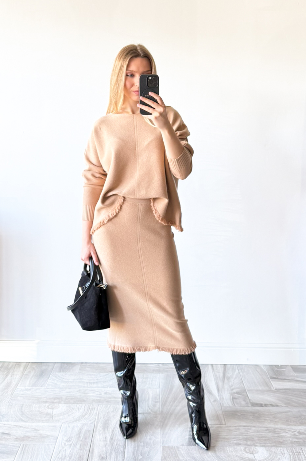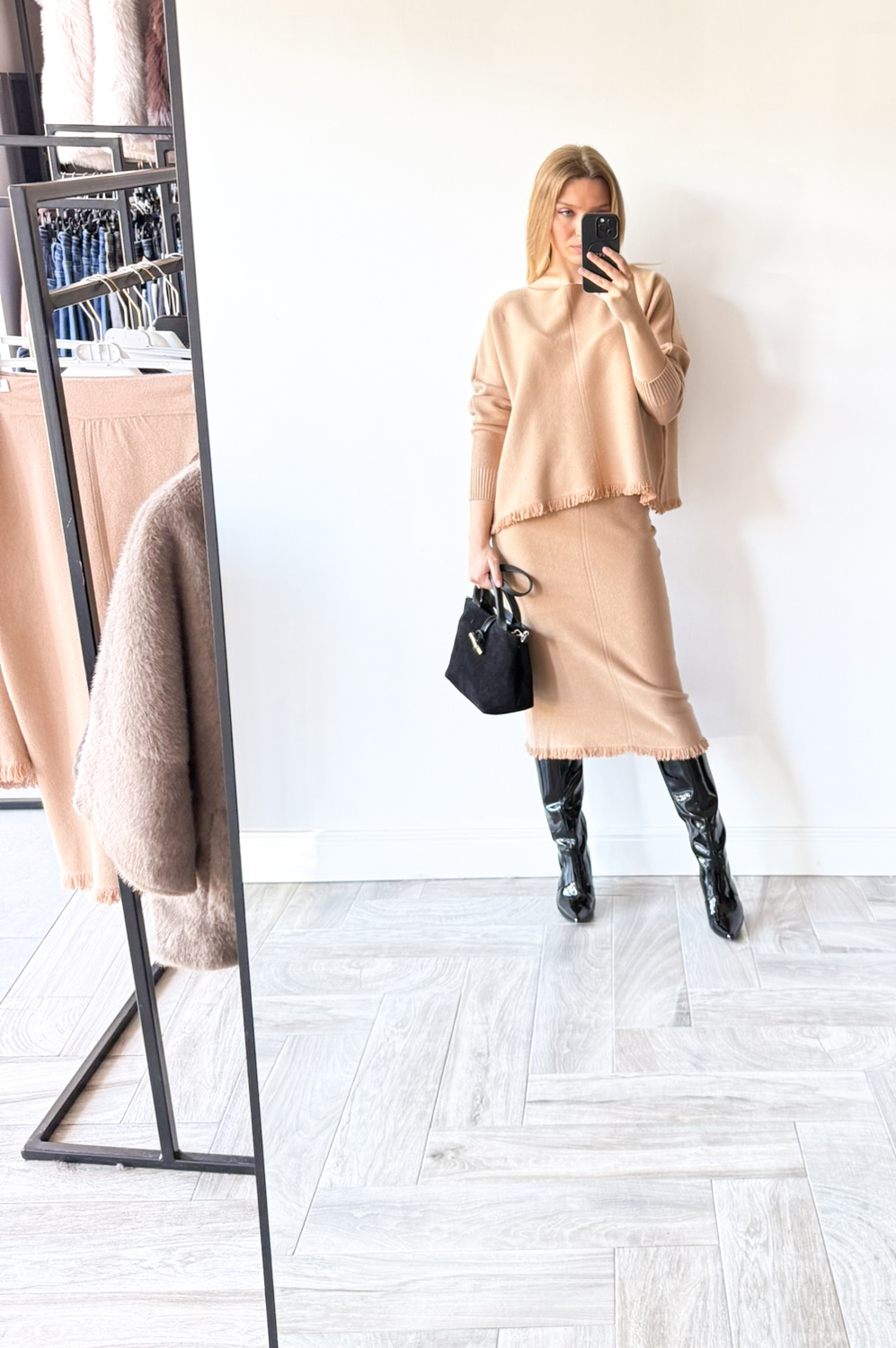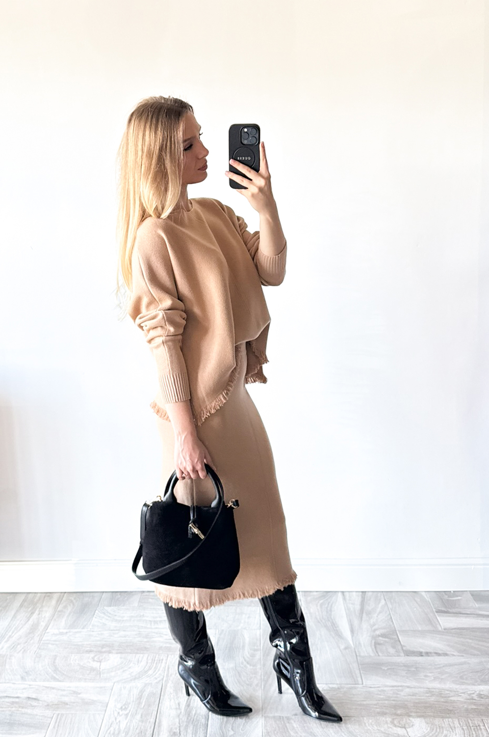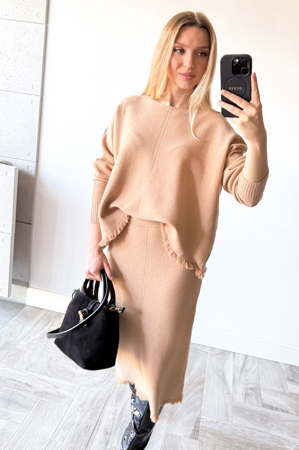 Komplet 2-częściowy KORI camel199.00 zł Najniższa cena towaru, która obowiązywała w okresie 30 dni przed zastosowaniem obniżki: 129.00 zł Opis Piękny komplet dwuczęściowy dzianinowy,miękki w dotyku i idealnie dopasowuje się do figury.Spódnica posiada w pasie gumę,dół ozdobne strzępienia,bluzka kimonowa z dekoltem owalnym. WYMIARY: