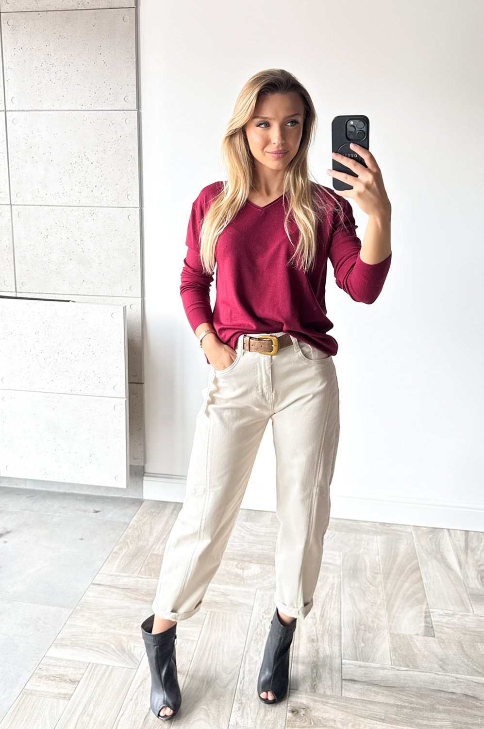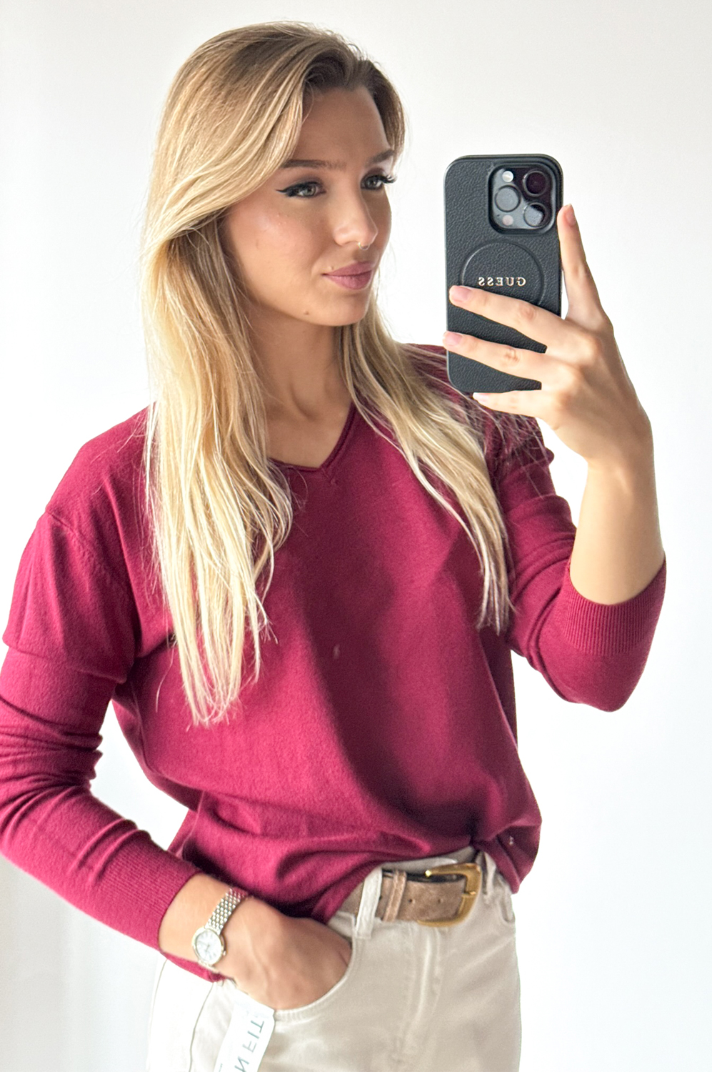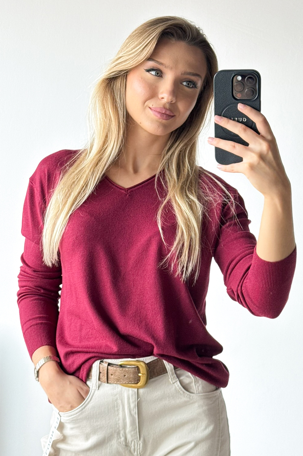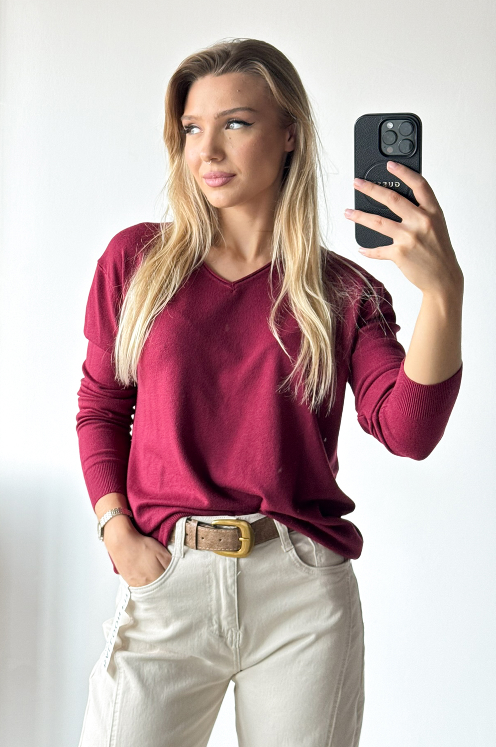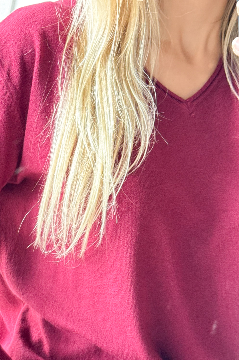 Sweterek BASIC MAŁY SZPIC czerwone wino139.00 zł Najniższa cena towaru, która obowiązywała w okresie 30 dni przed zastosowaniem obniżki: 139.00 zł Opis Sweterek o klasycznym kroju z małym wycięciem szpic i długim rękawem WYMIARY: długość: 63 cm, szerokość: 100-106 cm