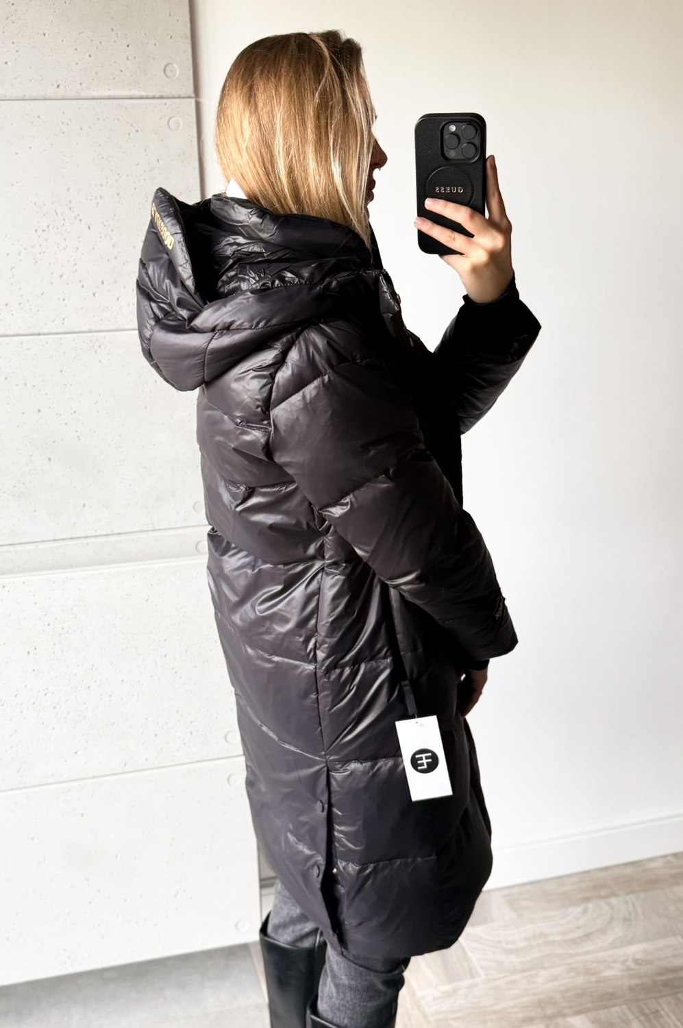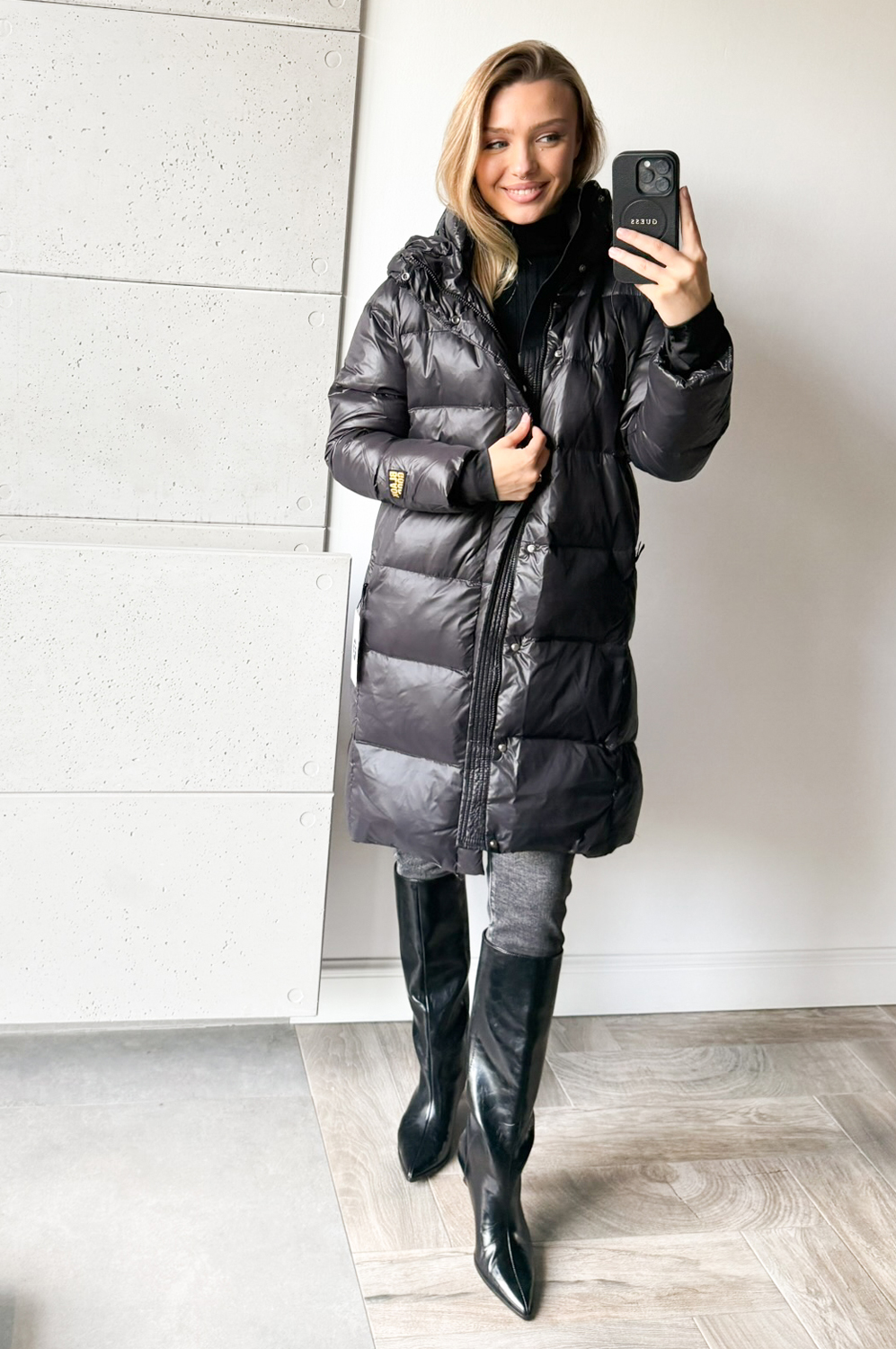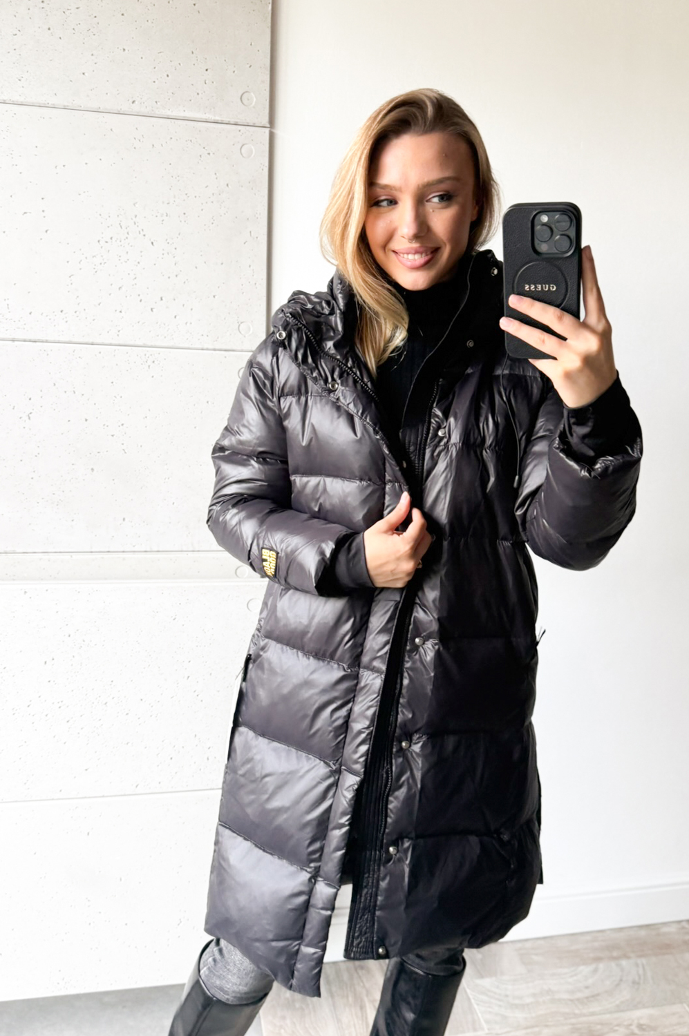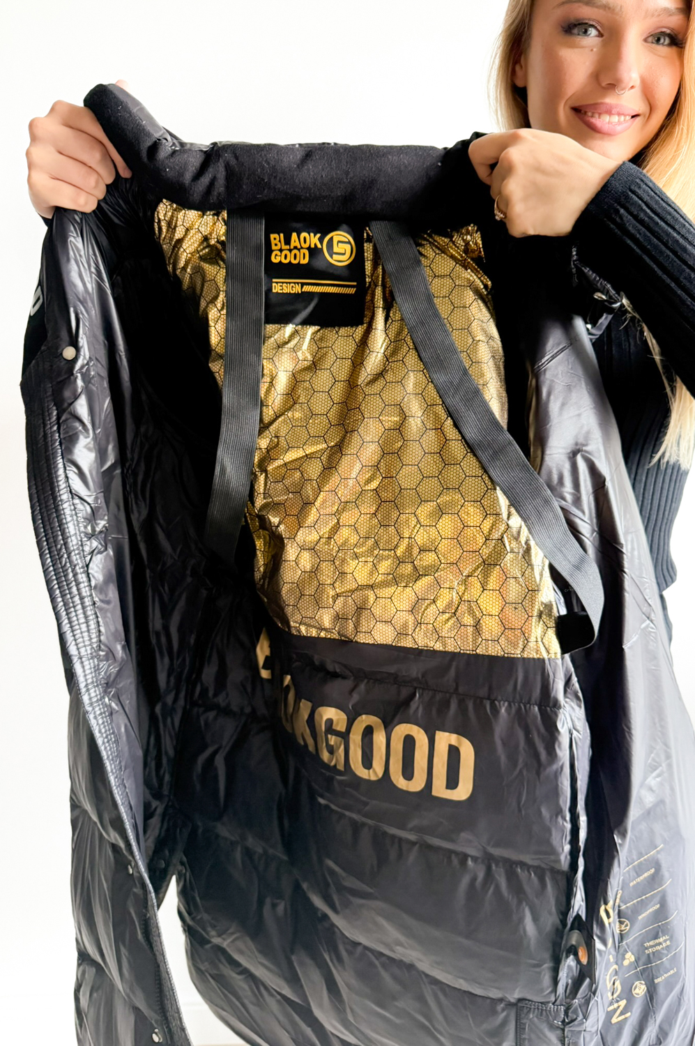 Płaszcz PUCHOWY GOLD NA SZELKACH czarny499.00 zł Najniższa cena towaru, która obowiązywała w okresie 30 dni przed zastosowaniem obniżki: 499.00 zł Opis Długa kurtka z kapturem i szelkami w podszewce. Wypełnienie puchem kaczym, posiada zamek. Złote elamenty w podszewce. ZASADY KONSERWACJI : PRANIE W 30 STOPNIACH.