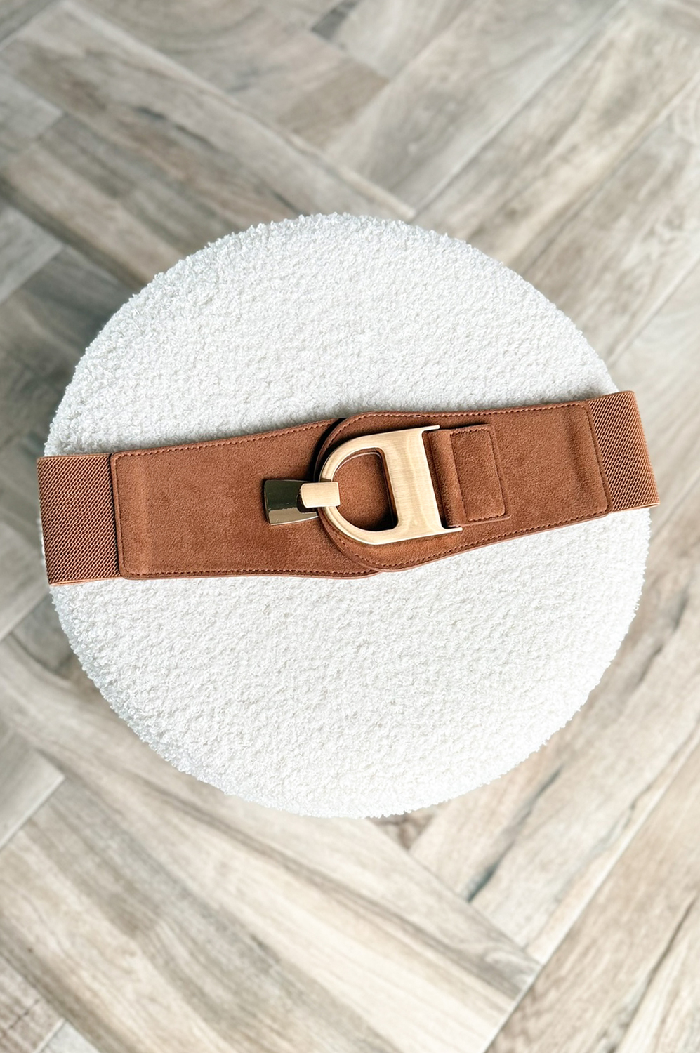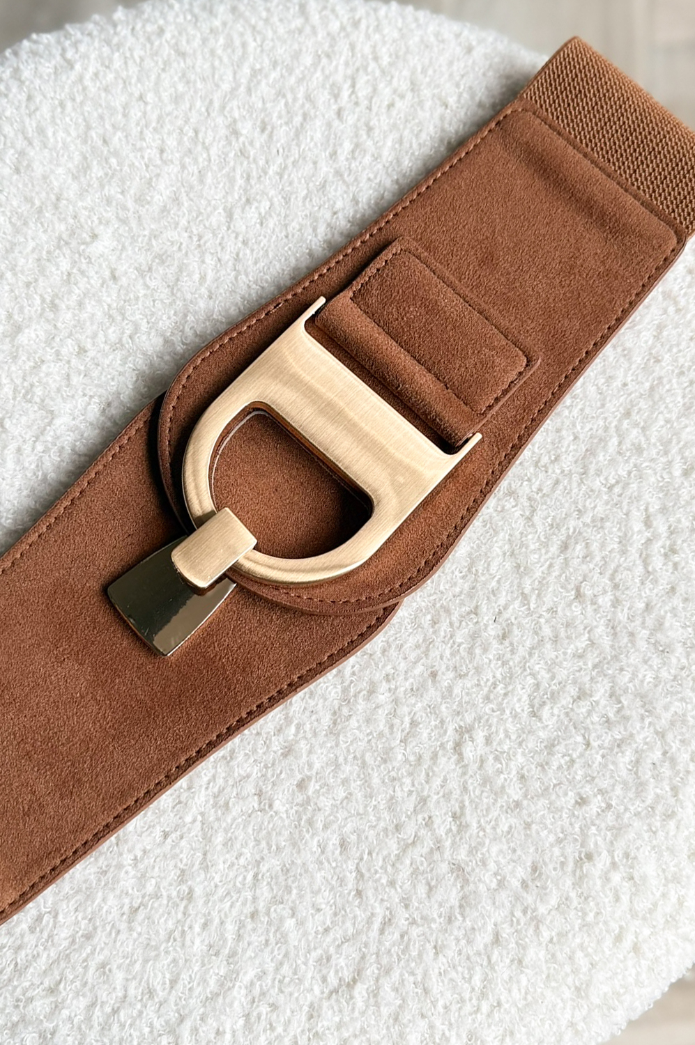 Pasek zamszowy z gumą, uniwerslny rozmiar. Zapinany na złotą klamrę w kształcie litery D.
