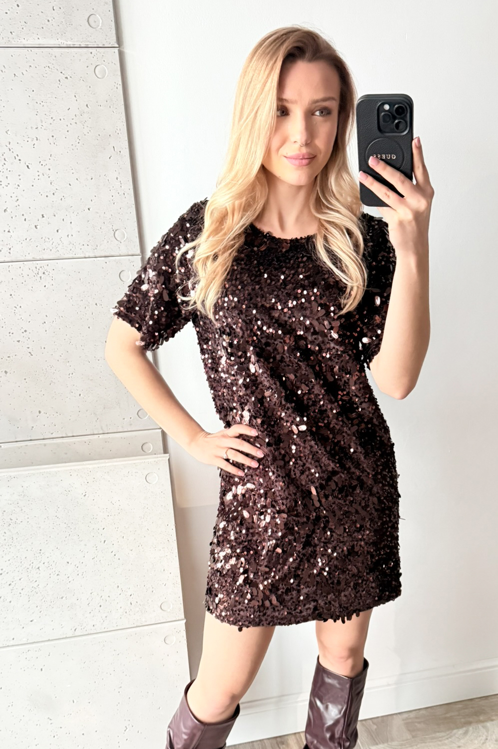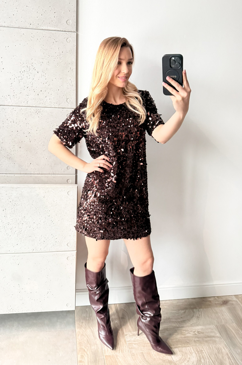 Sukienka SUKIENKA CEKIN czekolada99.00 zł Najniższa cena towaru, która obowiązywała w okresie 30 dni przed zastosowaniem obniżki: 229.00 zł Opis Zwrot ZWROTY