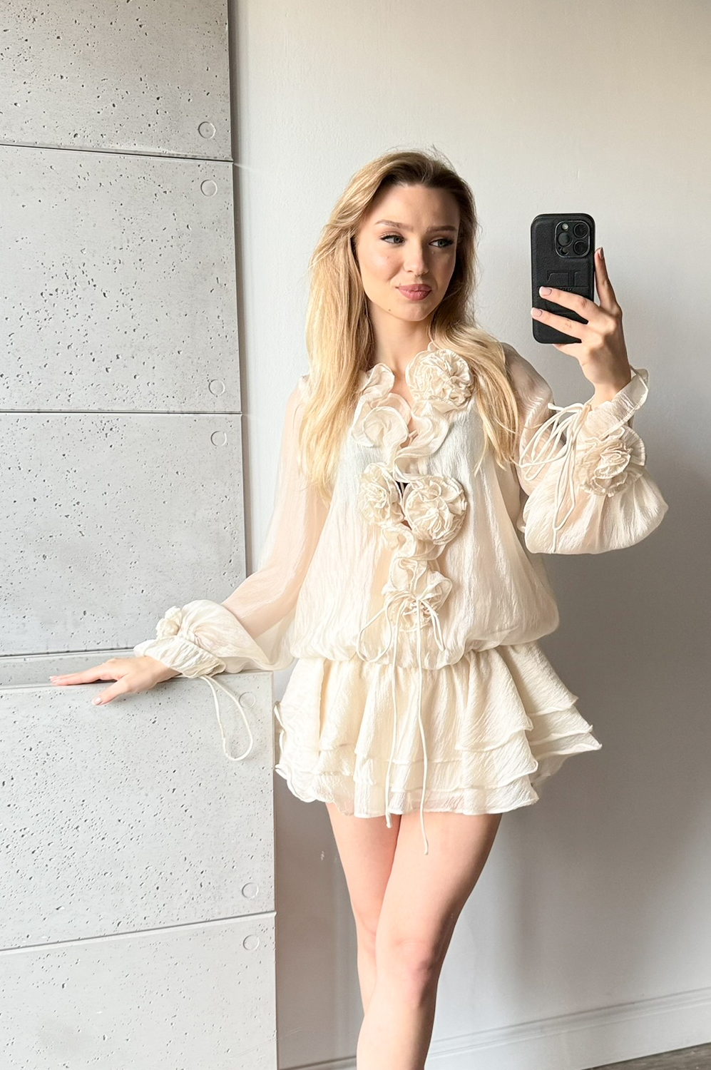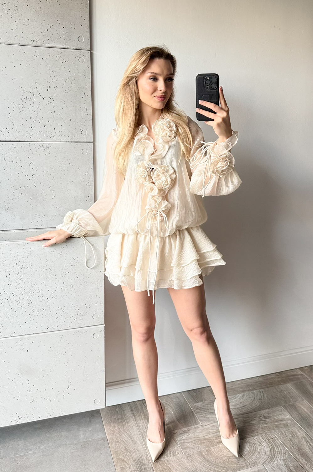 Sukienka RÓŻANA BEZA budyń waniliowy319.00 zł Najniższa cena towaru, która obowiązywała w okresie 30 dni przed zastosowaniem obniżki: 319.00 zł Opis Sukienka krótka ze sznurowanym dekoltem z różami. Sukienka ma oddzielne spodenki z tego samego materiału, na podszewce. Gumka wypada na biodrach wtedy długość sukienki jest za pośladki i przykrywa spodenki. Sukienka założona z gumką w pasie może być noszona jako bluzka lub tunika do spodni lub spódniczki.