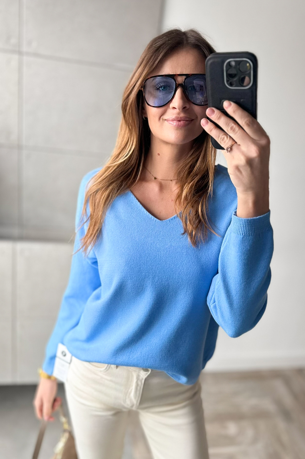 Sweterek BASIC SZPIC blue139.00 zł Najniższa cena towaru, która obowiązywała w okresie 30 dni przed zastosowaniem obniżki: 139.00 zł Opis Bluzka-sweterek z długim rękawem i dekoltem w szpic. Milutka dla ciała, wyglądająco zjawiskowo i elegancko.