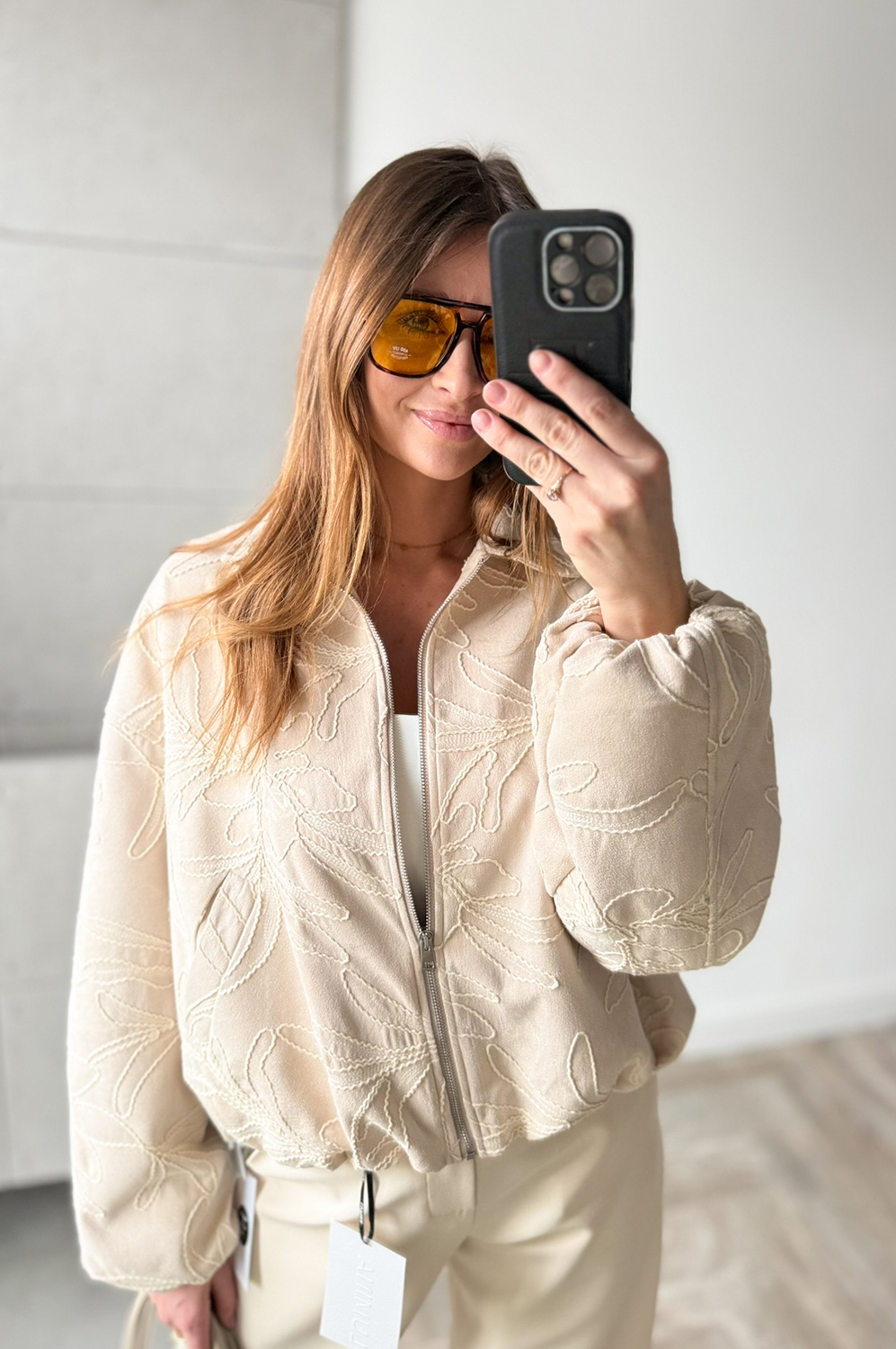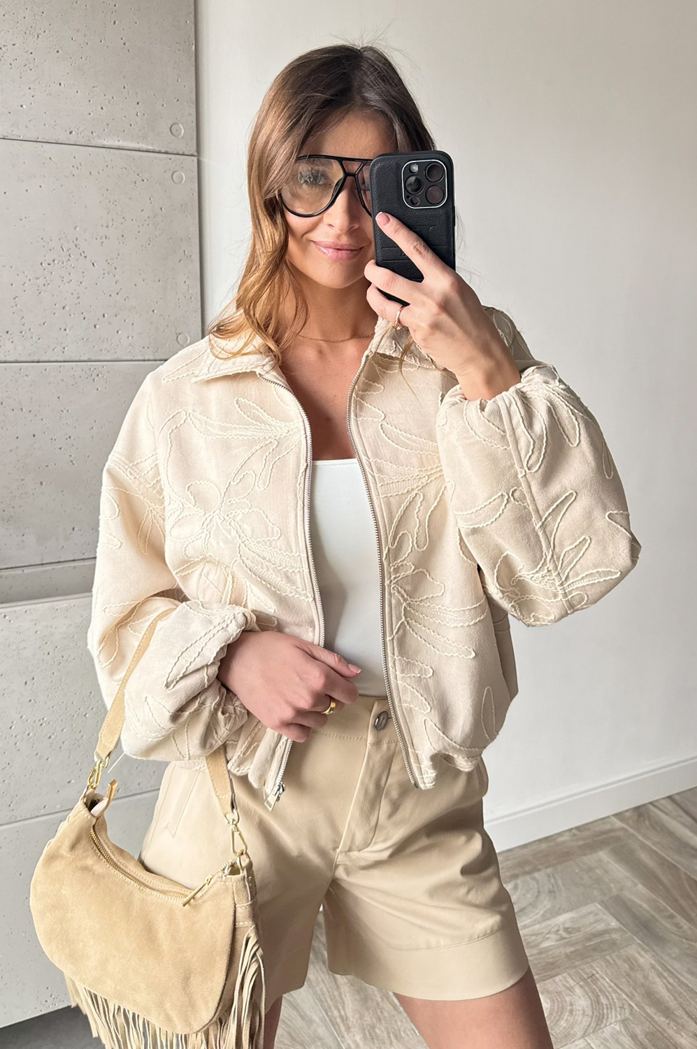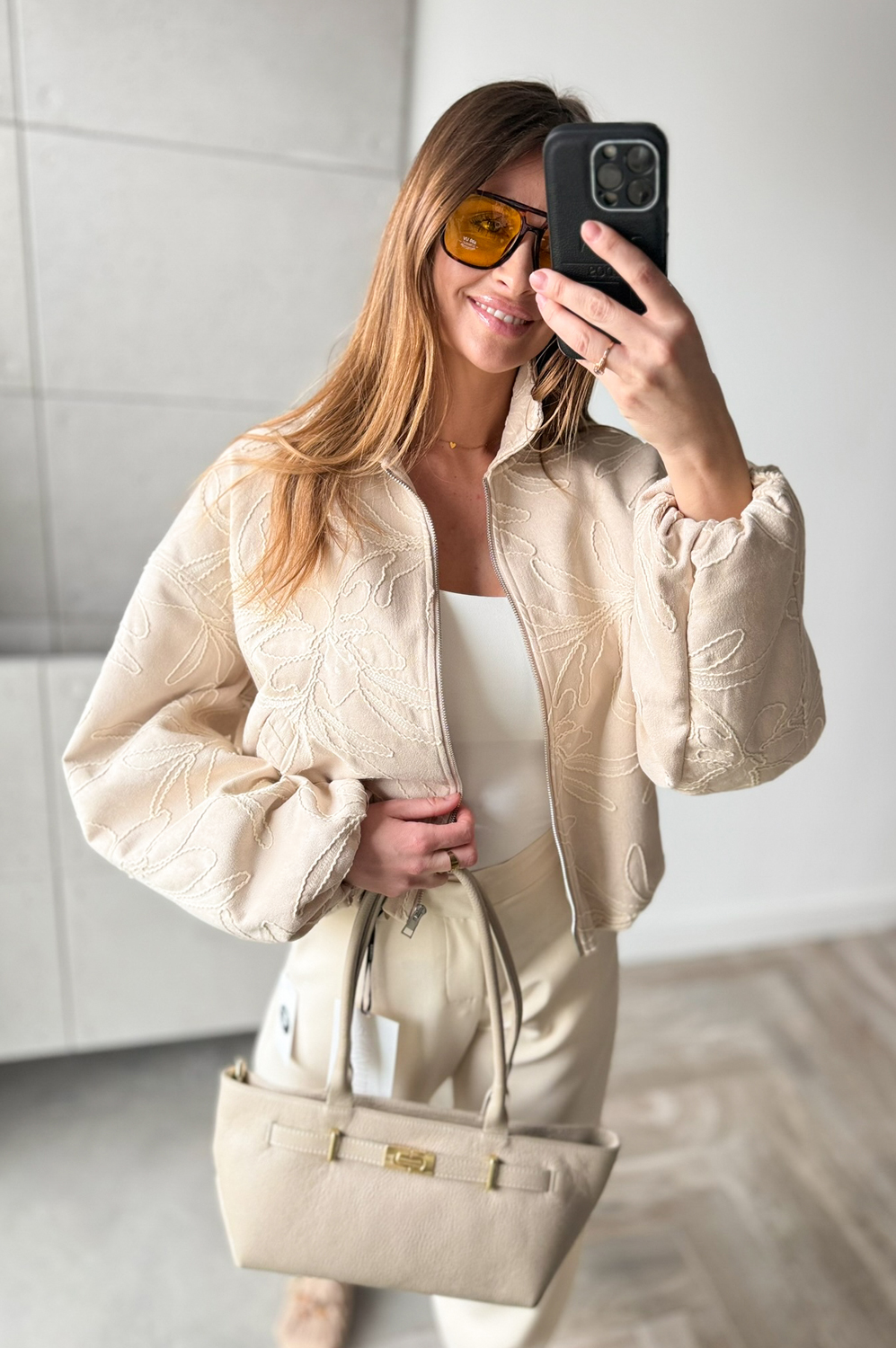 Kurtka BOMBERKA HAFTOWANY ZAMSZ beż191.20 zł Najniższa cena towaru, która obowiązywała w okresie 30 dni przed zastosowaniem obniżki: 239.00 zł Opis Kurtka bomberka o nowoczesnym kroju, zapinana na zamek. Uszyta na podszewce. Tkanina posiada haftowane wzory. Na dole ściągnięta delikatną gumką. WYMIARY: