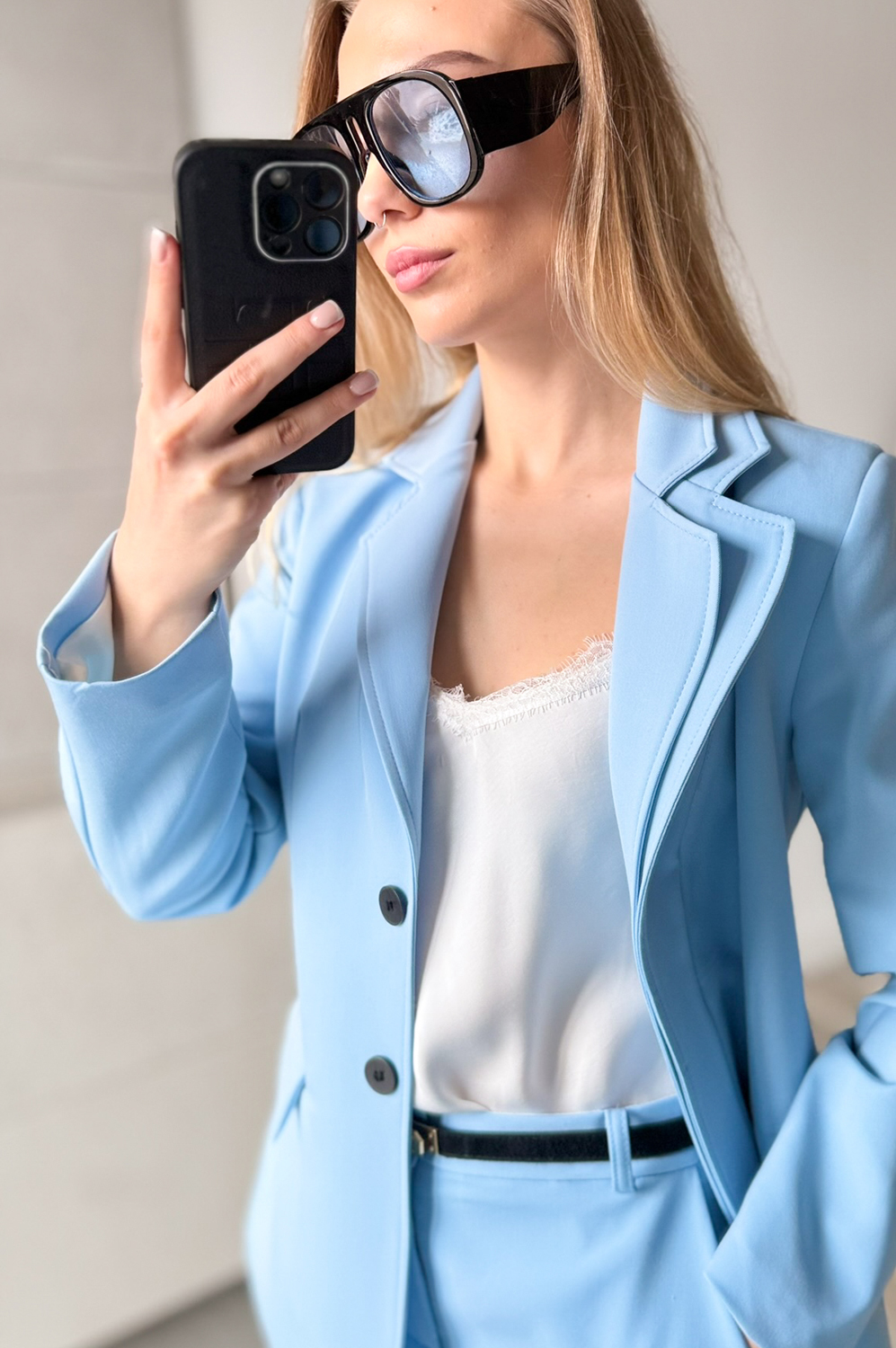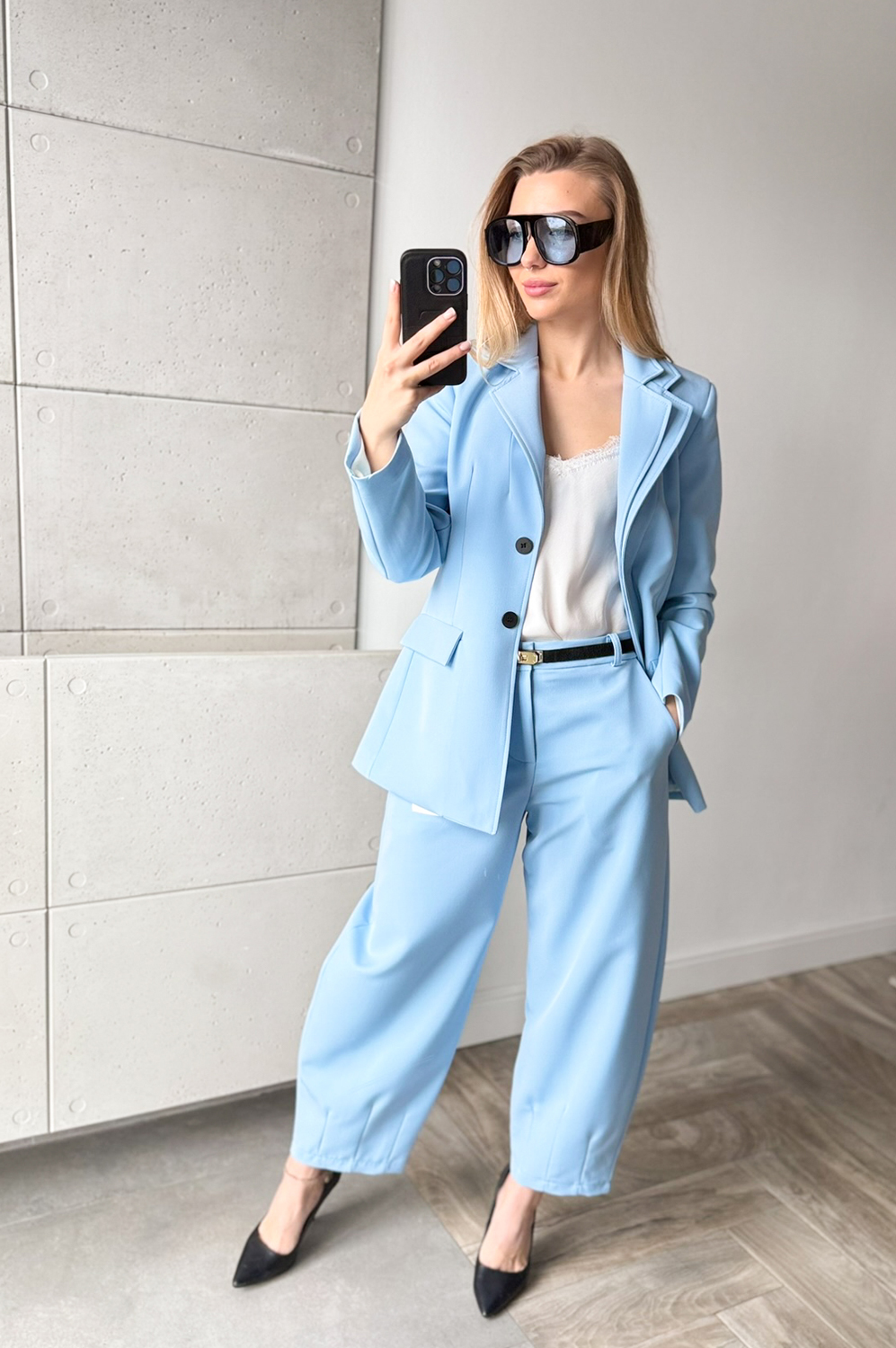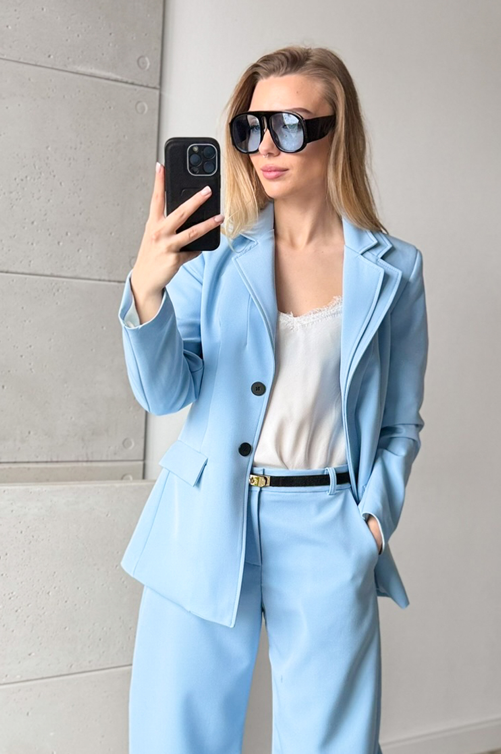 Marynarka LUMINA DOUBLE błękit329.00 zł Najniższa cena towaru, która obowiązywała w okresie 30 dni przed zastosowaniem obniżki: 329.00 zł Opis Elegancka marynarka na podszewce, zapinana na guziczki, posiada kieszenie i ozdobne podwójne obłożenie. WYMIARY: