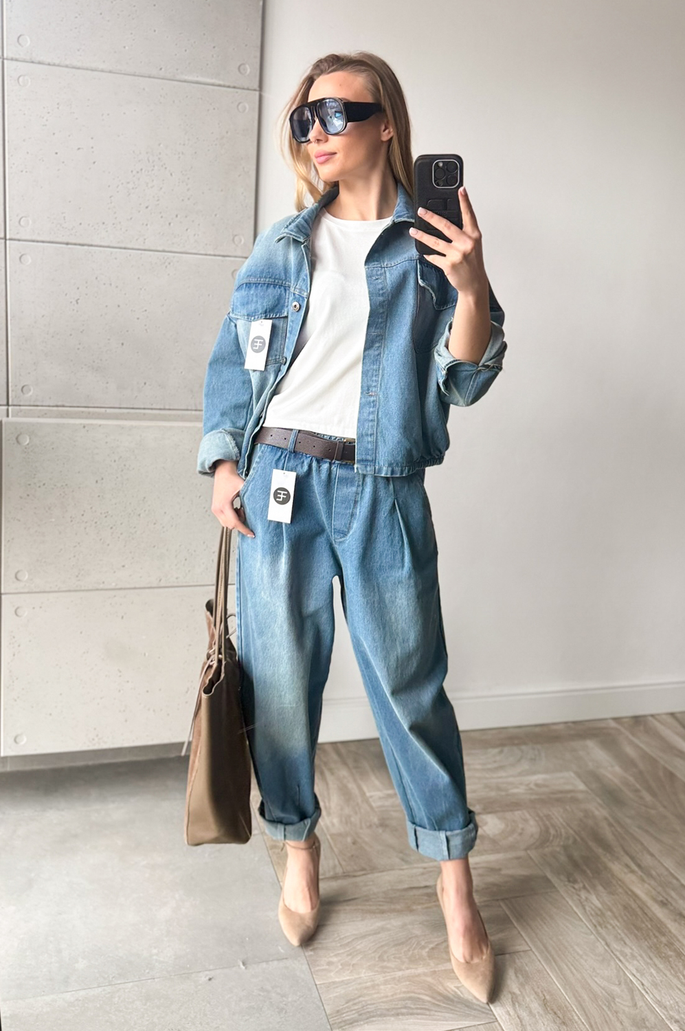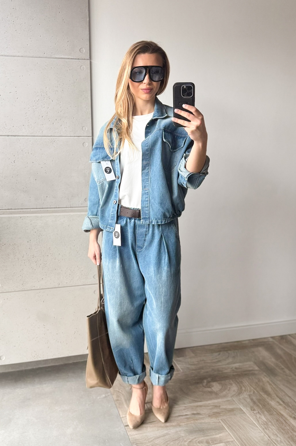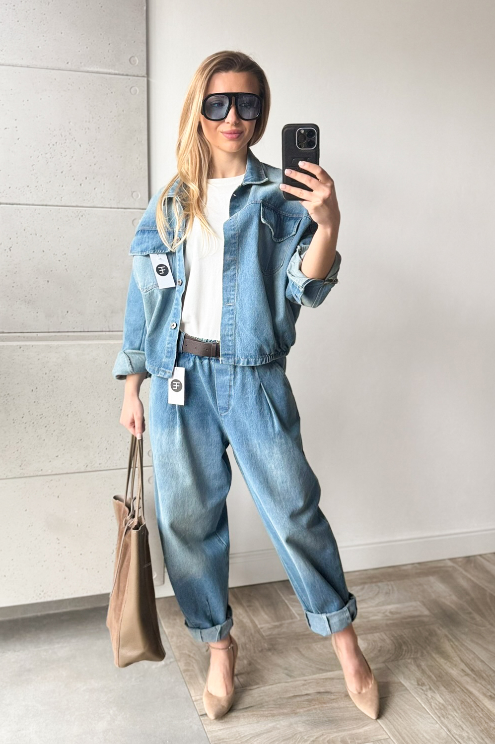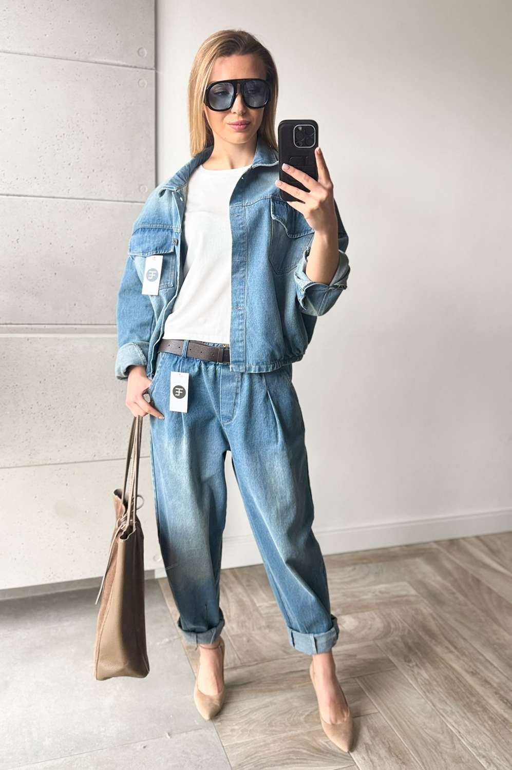 Komplet 2-częściowy JEANS DUO jasnoniebieski399.00 zł Najniższa cena towaru, która obowiązywała w okresie 30 dni przed zastosowaniem obniżki: 399.00 zł Opis Komplet - kurtka ovesize i spodnie. WYMIARY: Pasuje na XS S M I małe L