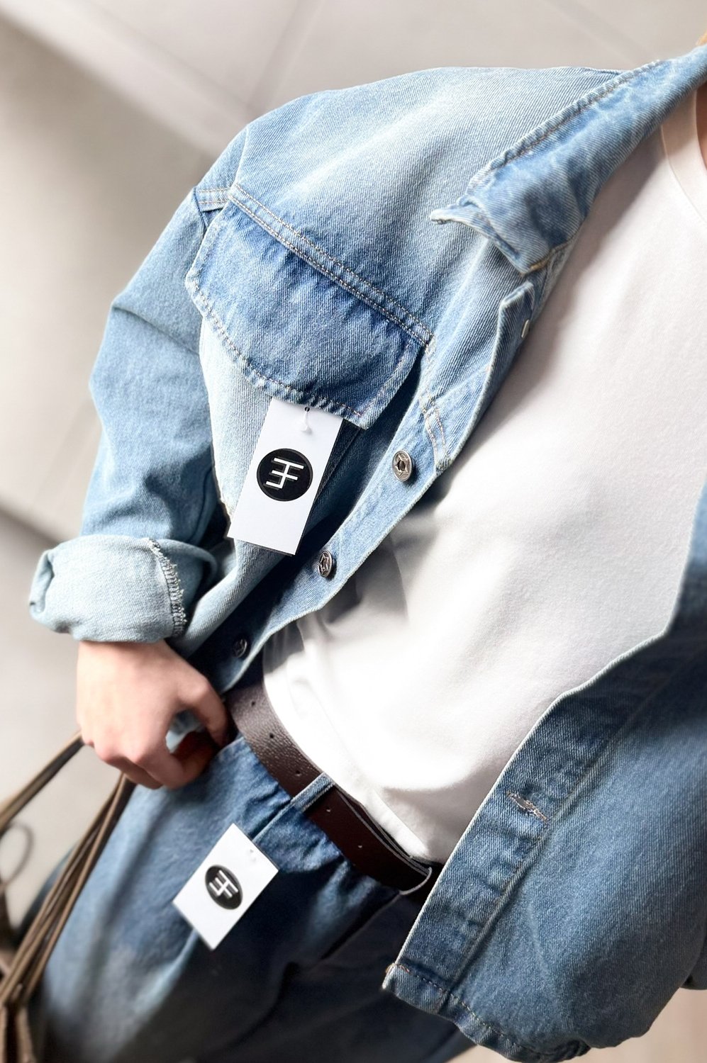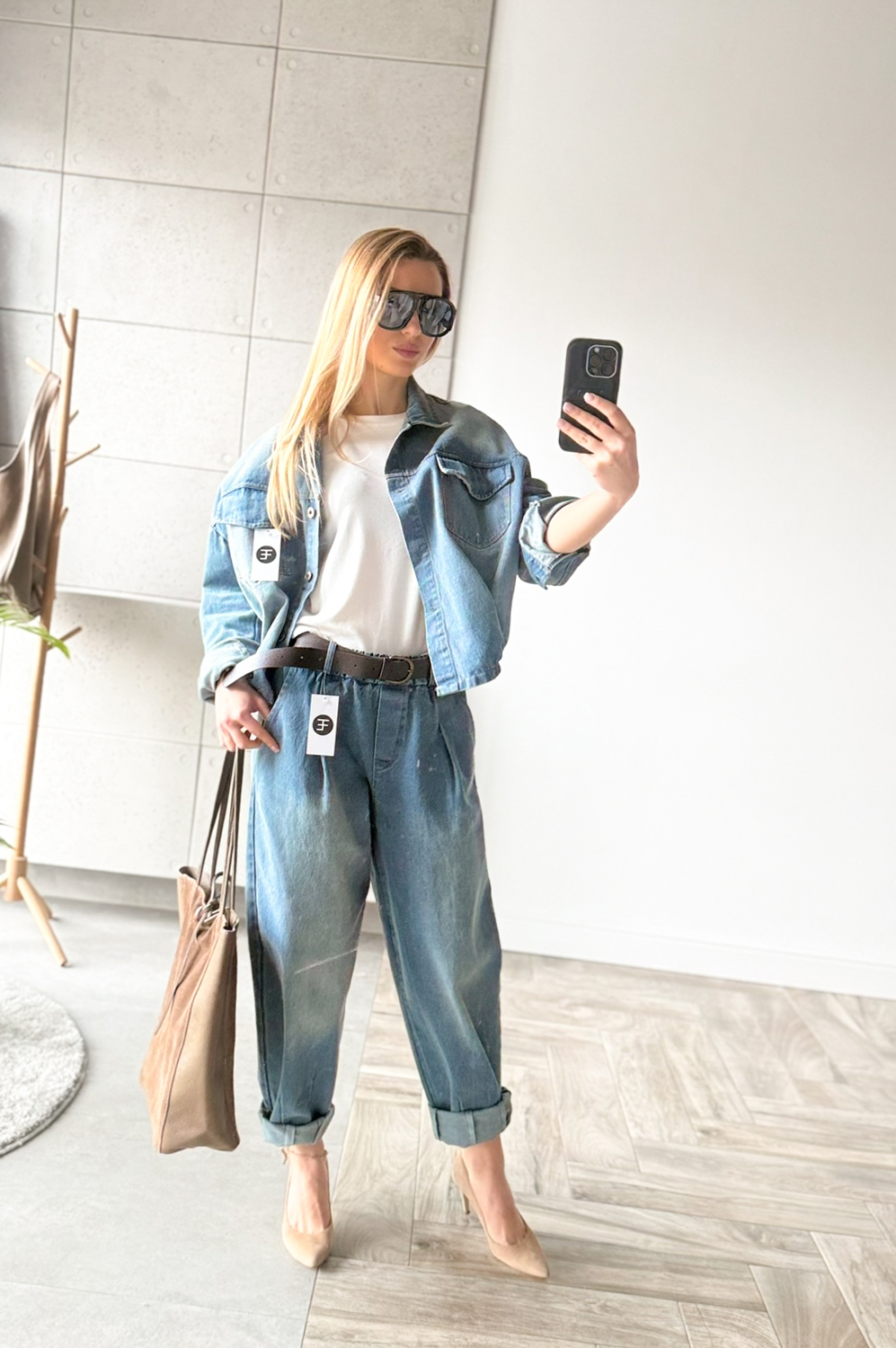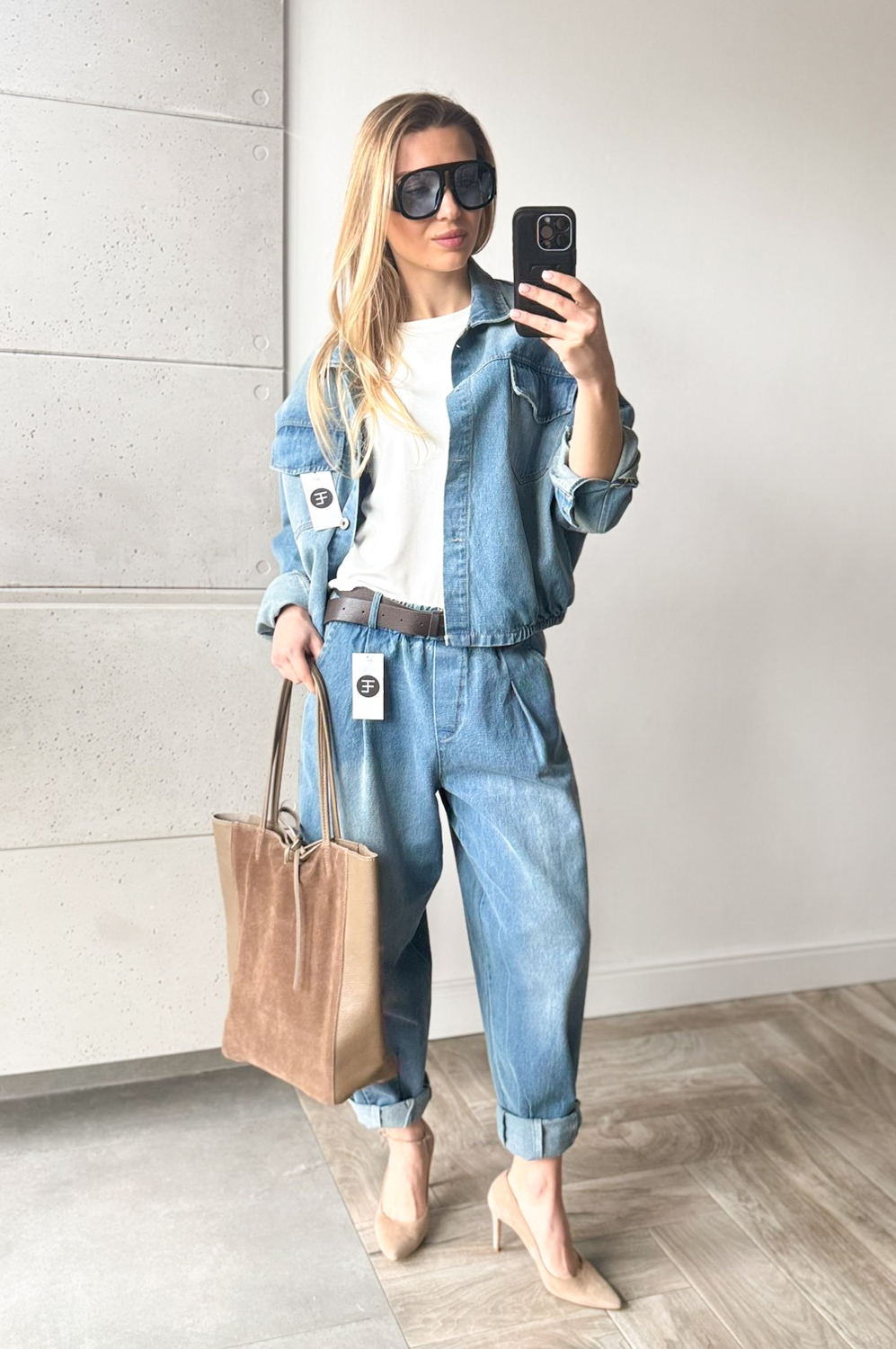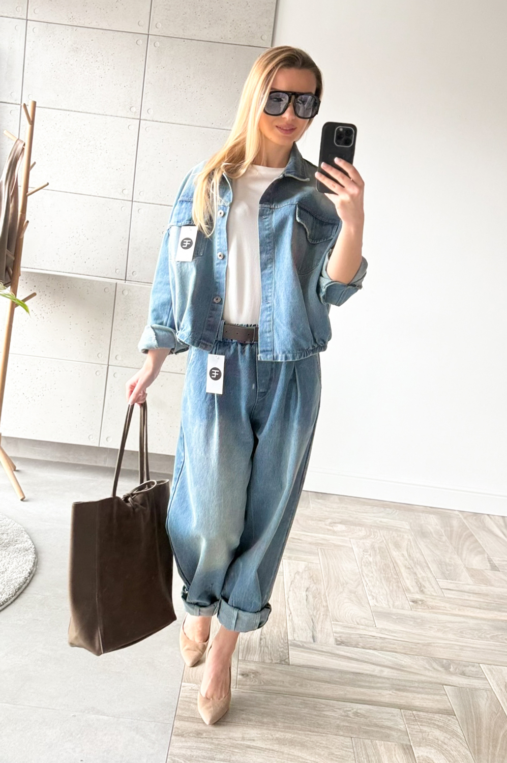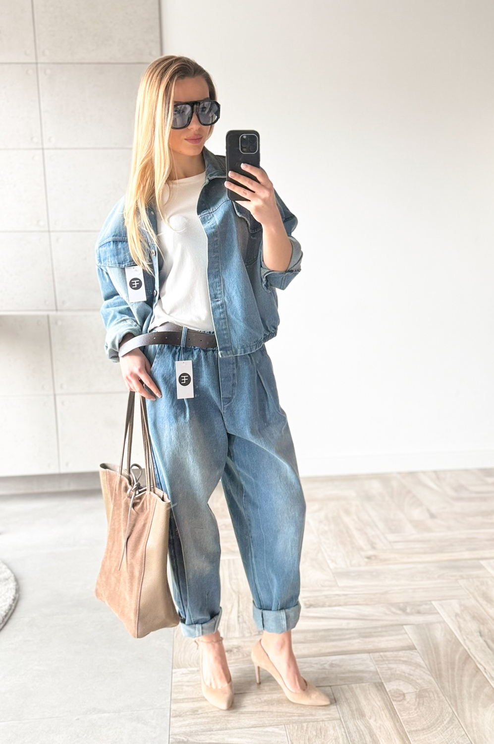 Komplet 2-częściowy JEANS DUO jasnoniebieski399.00 zł Najniższa cena towaru, która obowiązywała w okresie 30 dni przed zastosowaniem obniżki: 399.00 zł Opis Komplet - kurtka ovesize i spodnie. WYMIARY: Pasuje na XS S M I małe L