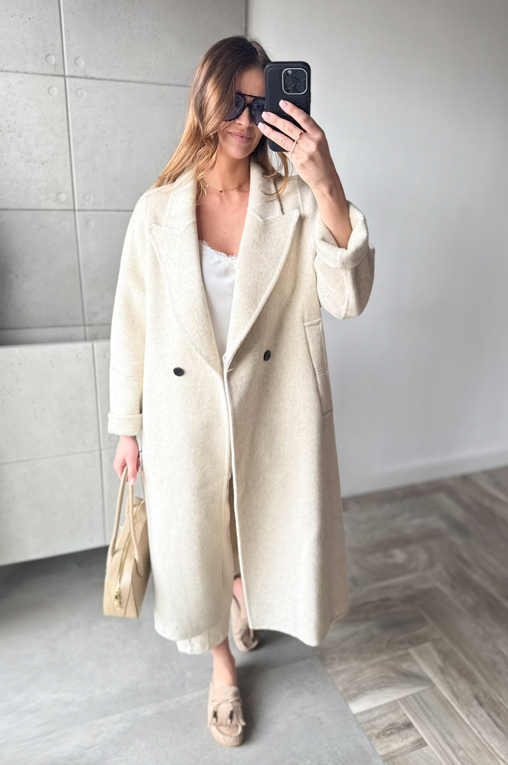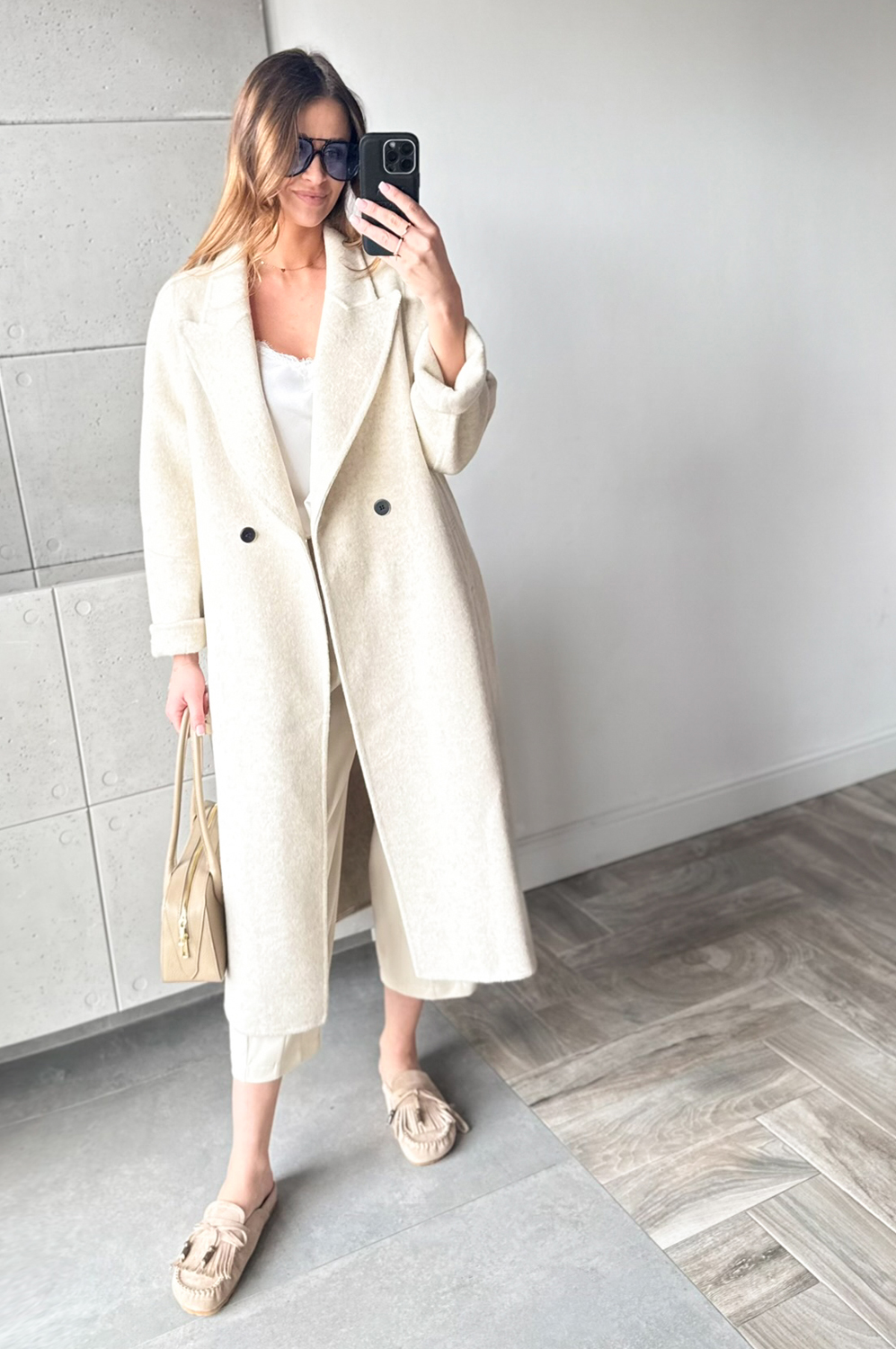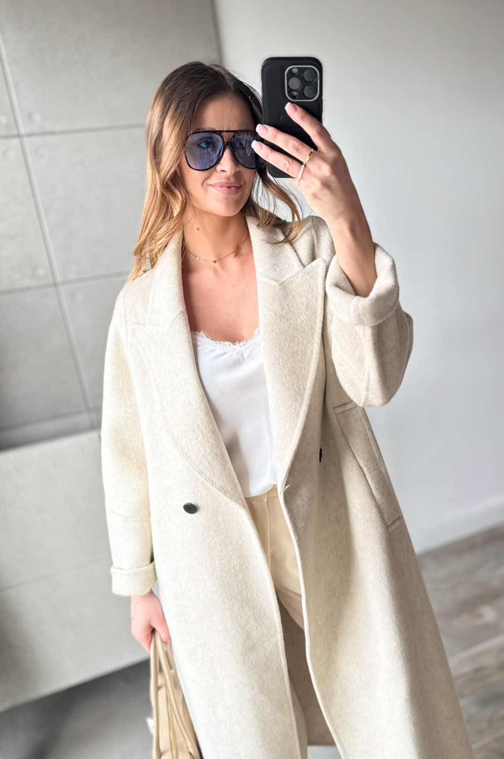 Płaszcz WOOL 73% LONG beż499.00 zł Najniższa cena towaru, która obowiązywała w okresie 30 dni przed zastosowaniem obniżki: 499.00 zł Opis Wełniany elegancki płaszcz świetnej jakości, doskonale wykonany. Jakość PREMIUM. Płaszcz jest bez podszewki.