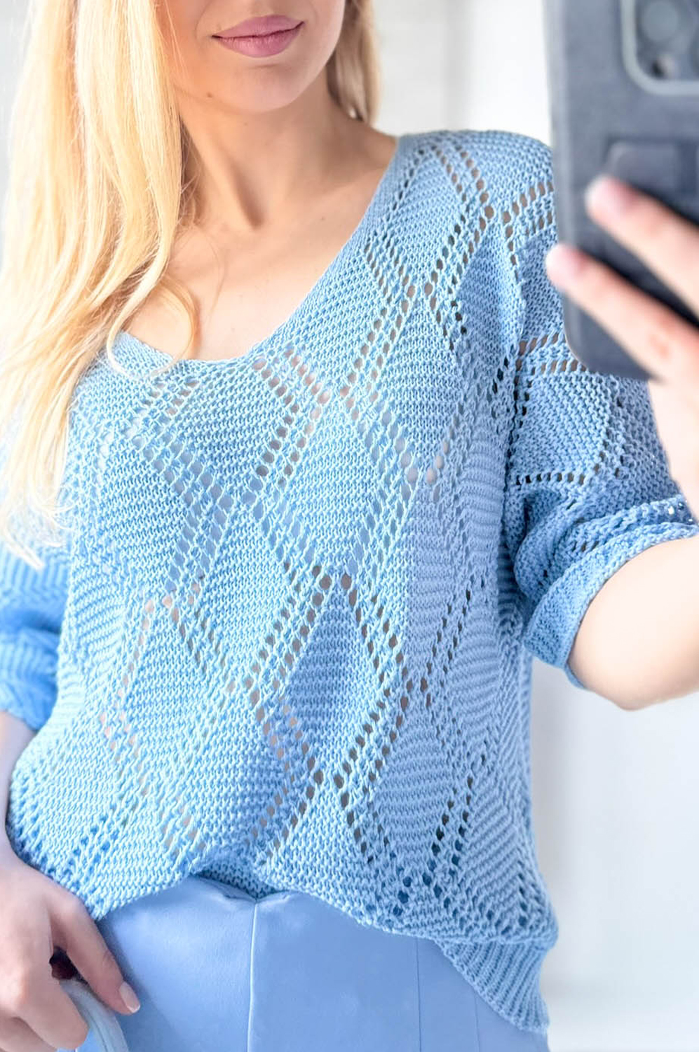Sweterek ROMBY niebieski119.00 zł Najniższa cena towaru, która obowiązywała w okresie 30 dni przed zastosowaniem obniżki: 119.00 zł Opis Sweterek z krótkim rękawkiem i dekoltem w szpic. Sweterek jest miękki i przyjemny w dotyku. Przewiewny i wykonany z bawełny. WYMIARY: długość: 62 cm, szerokość: 100-106 cm