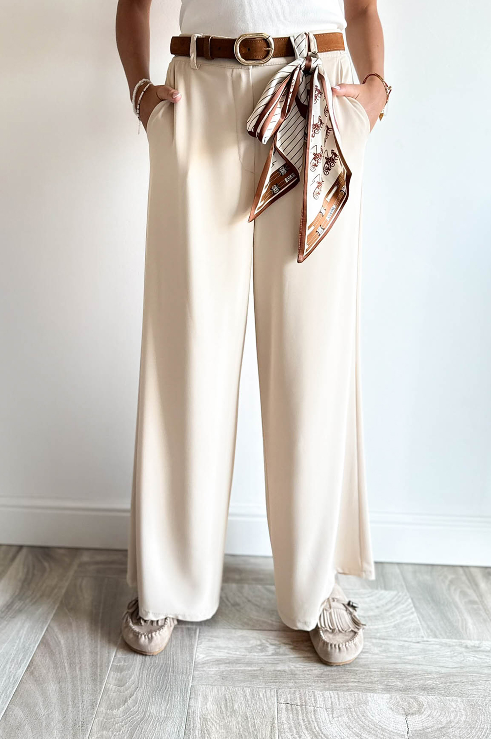 Spodnie LEJĄCE - BEŻ179.00 zł Najniższa cena towaru, która obowiązywała w okresie 30 dni przed zastosowaniem obniżki: 179.00 zł Opis Lejące spodnie z szeroką nogawką i z kieszeniami, zapinane na zamek i guzik. Z tyłu wszyta guma. SKŁAD : 95% poliester 5% elastan