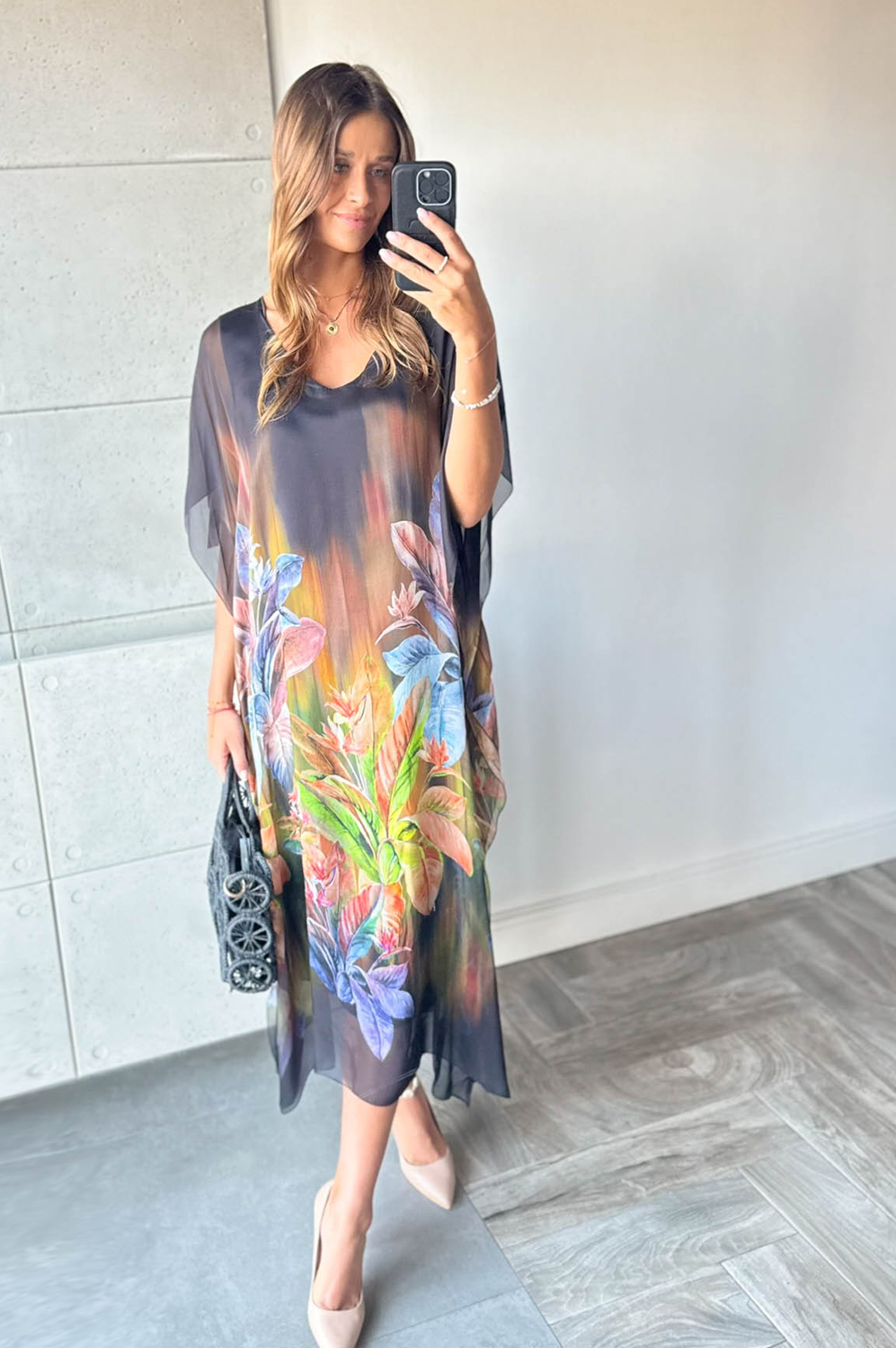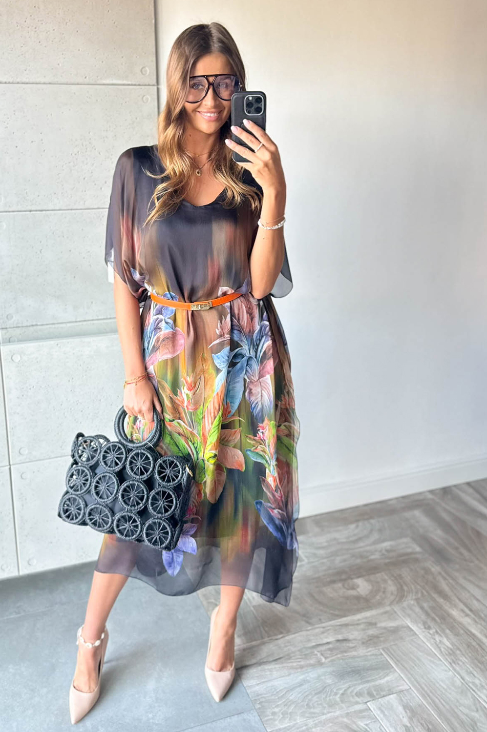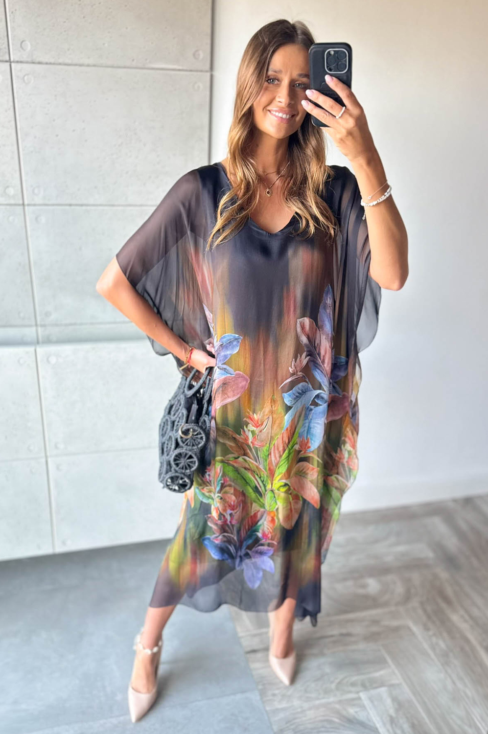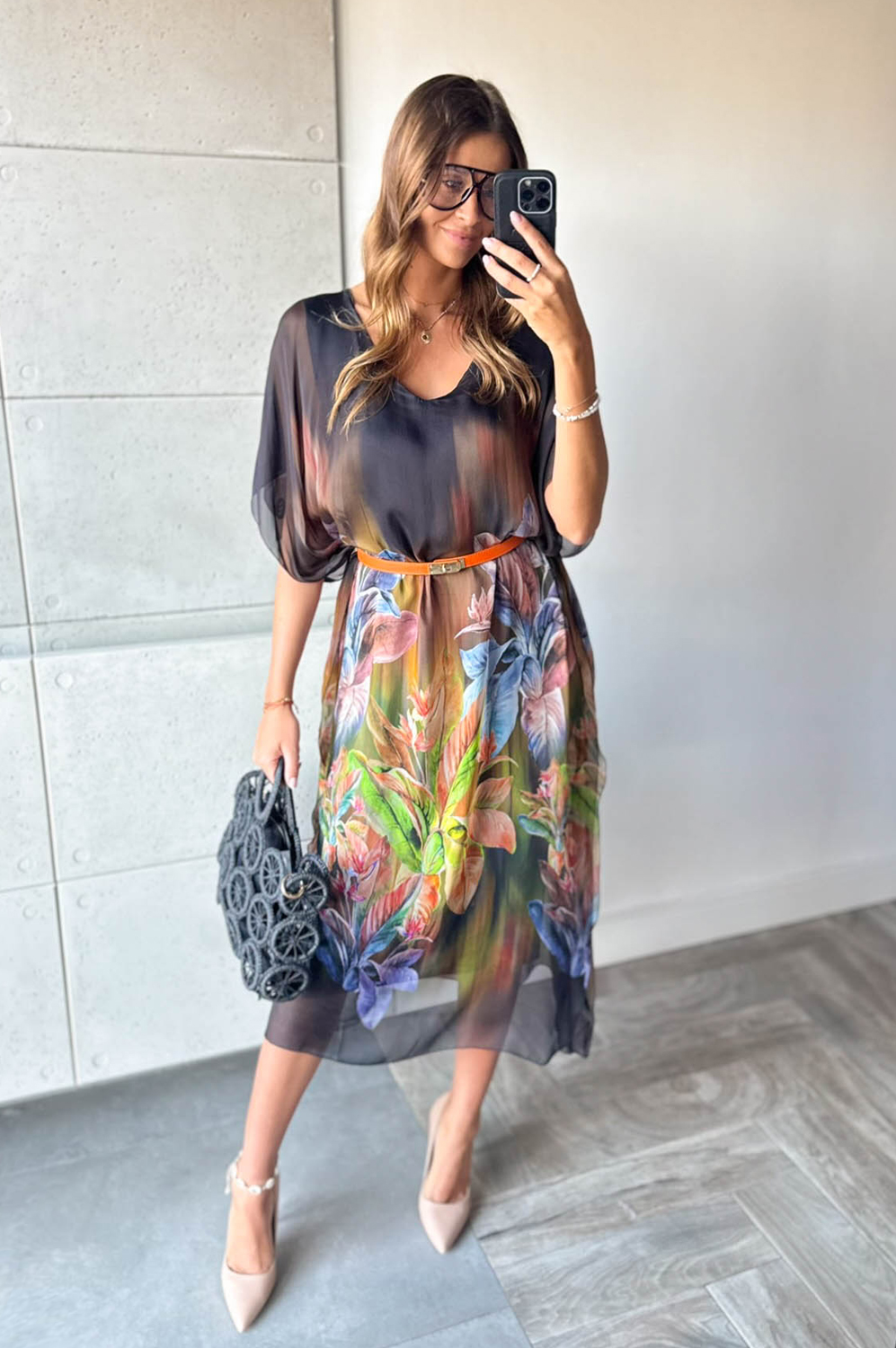 WYMIARY: Sukienka ma luźny fason. Pasuje od XS do L SKŁAD: 70% wiskoza, 30 % silk (jedwab)