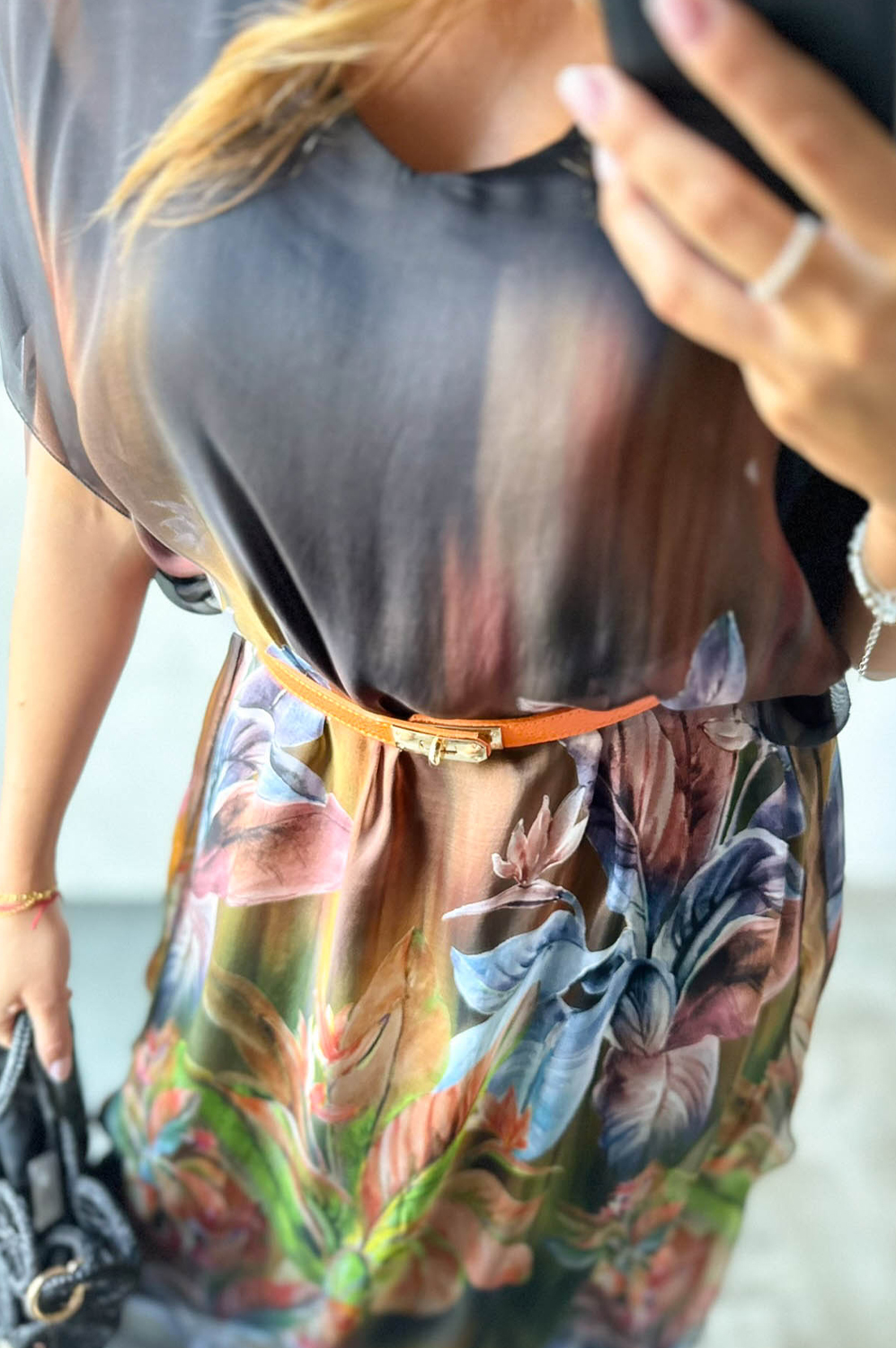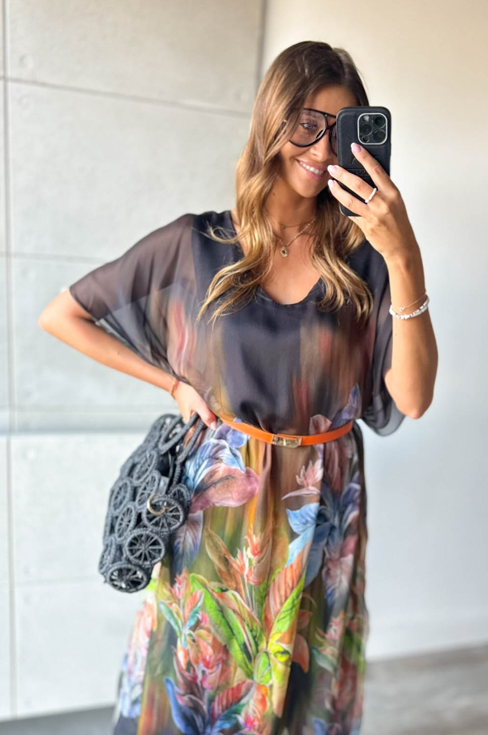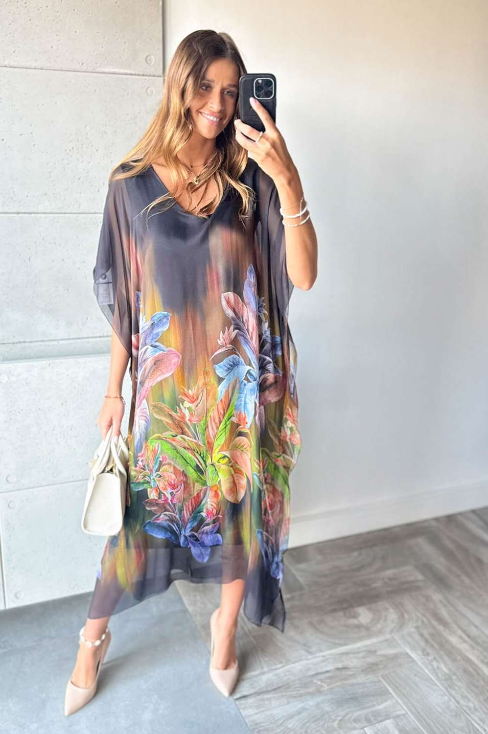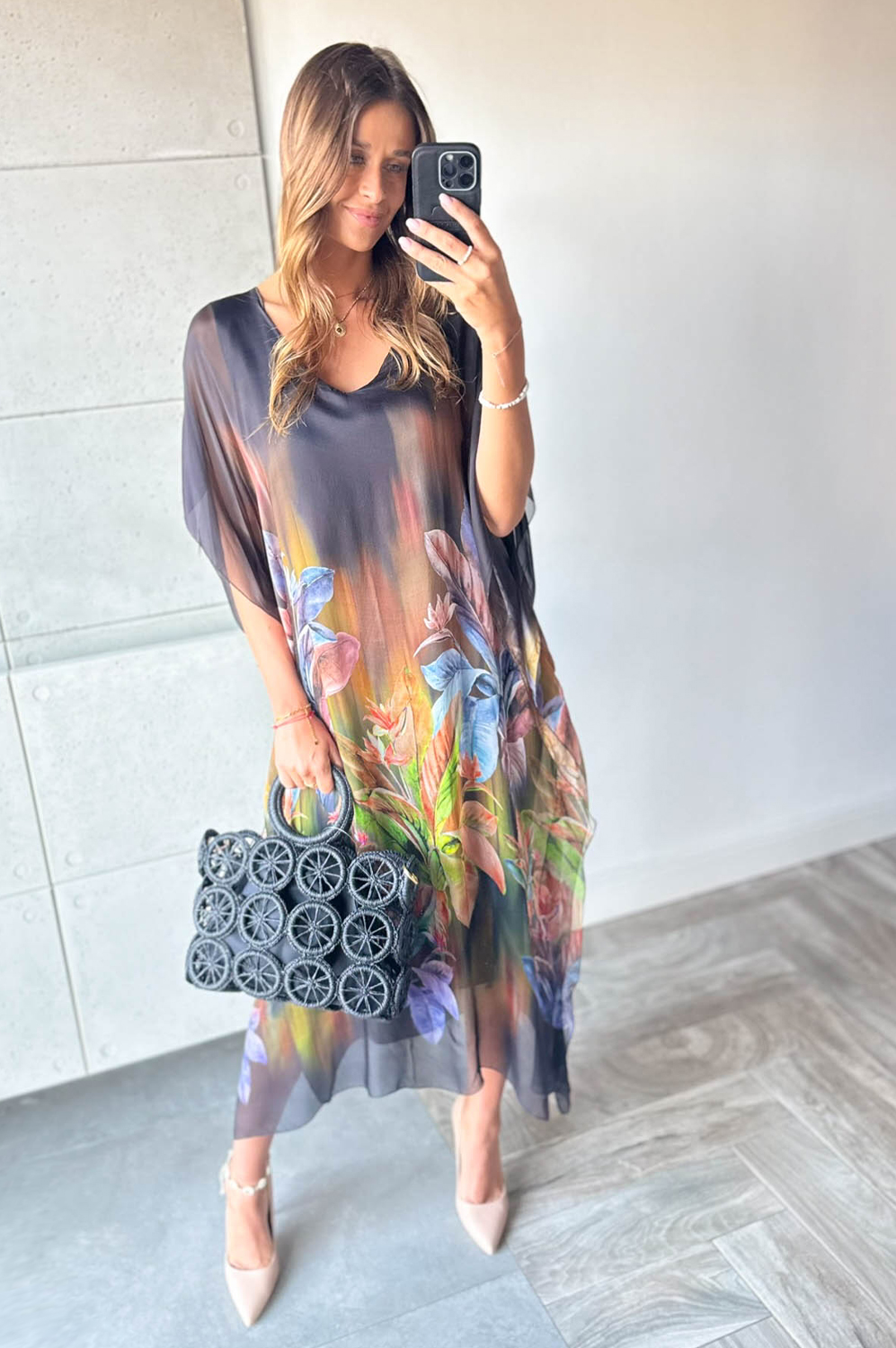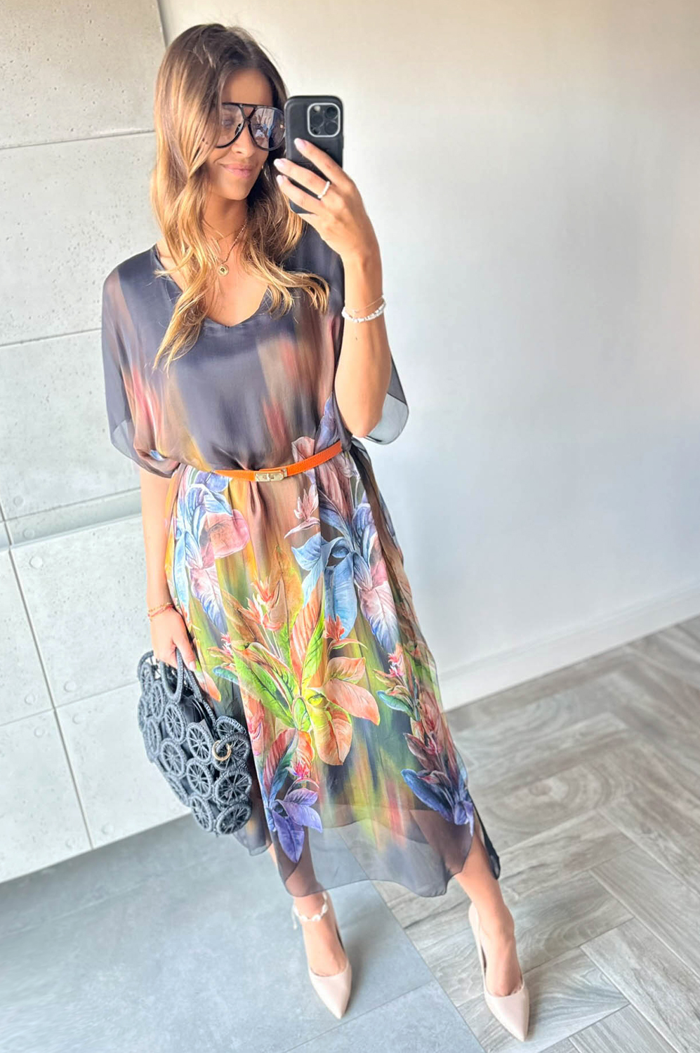 WYMIARY: Sukienka ma luźny fason. Pasuje od XS do L SKŁAD: 70% wiskoza, 30 % silk (jedwab)