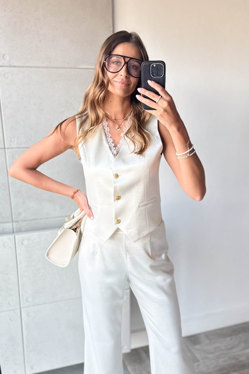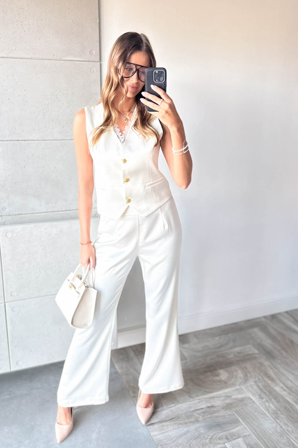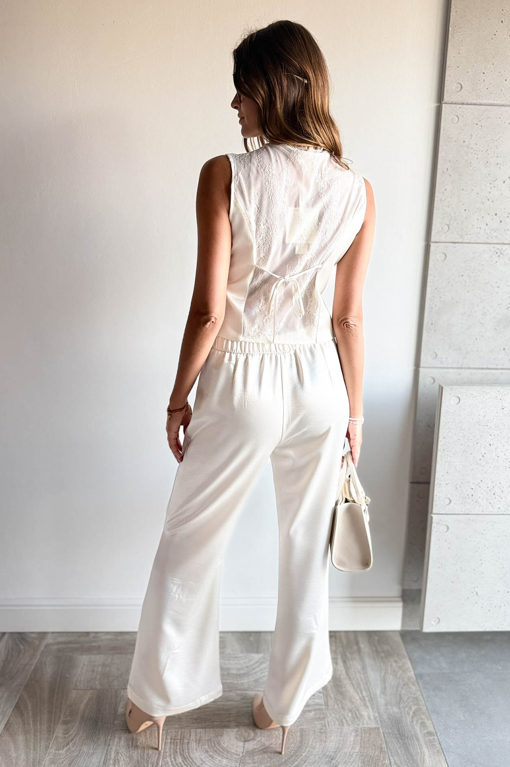 Komplet 2-częściowy SATYNOWY Z KORONKĄ249.00 zł Najniższa cena towaru, która obowiązywała w okresie 30 dni przed zastosowaniem obniżki: 249.00 zł Opis Piękny komplecik dwuczęściowy. Kamizelka w formie krótkiej marynarki na podszewce z koronkowym tyłem, zapinana na guziczki,spodnie z prostą długą nogawką z tyłu posiadają gumkę. WYMIARY:
