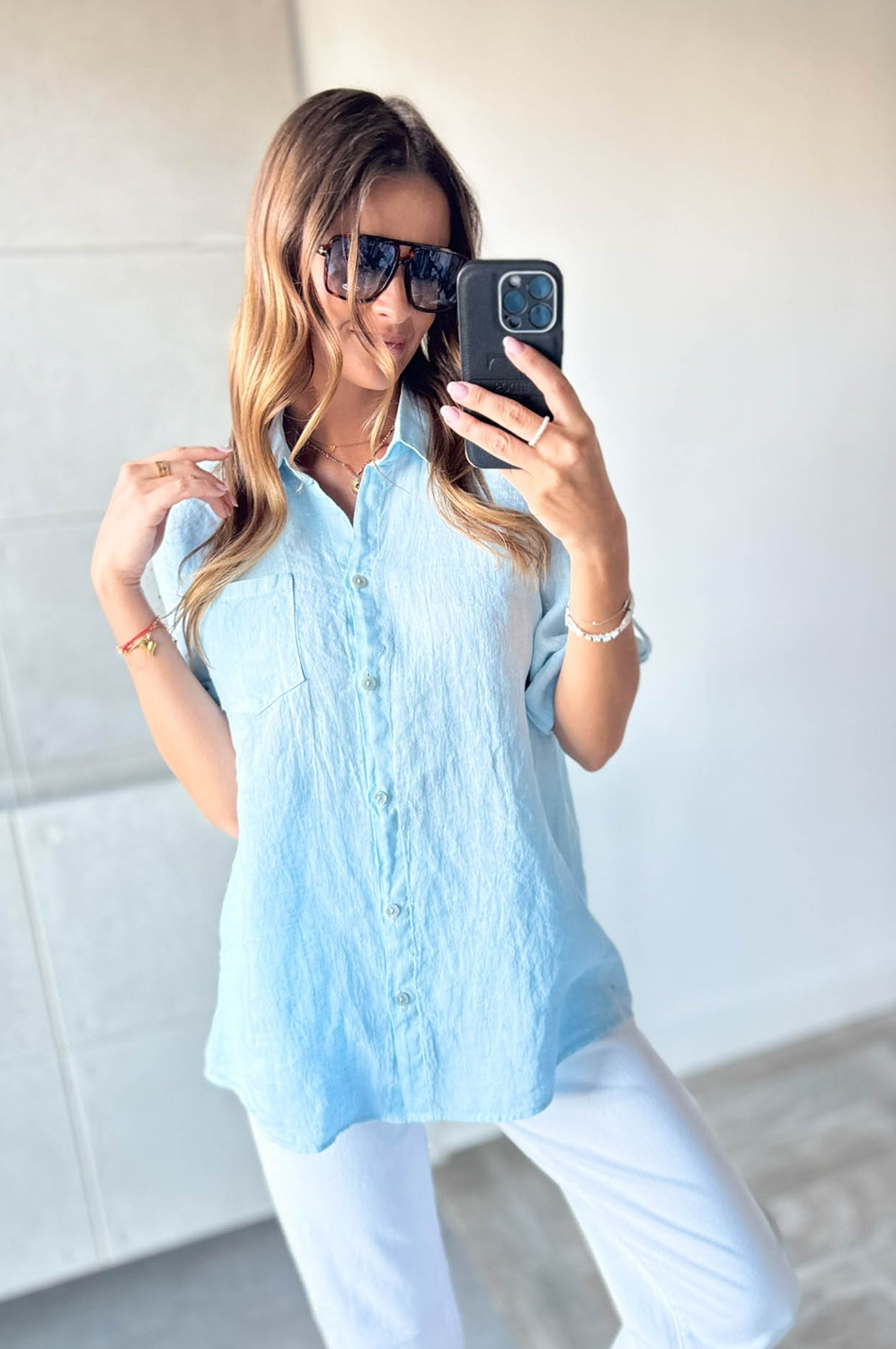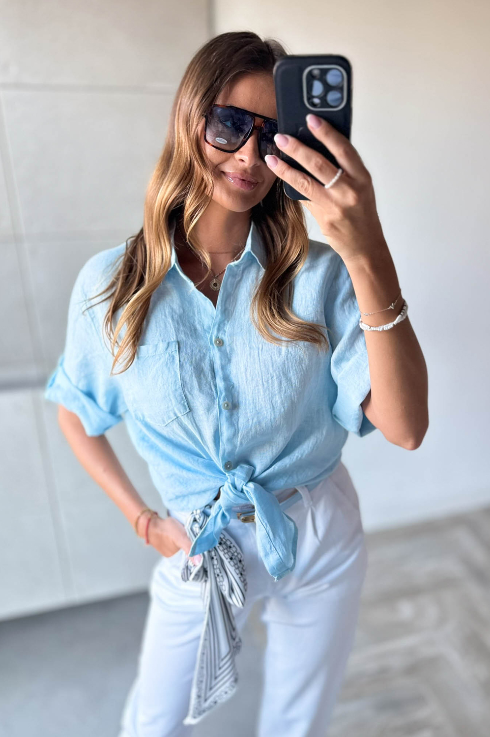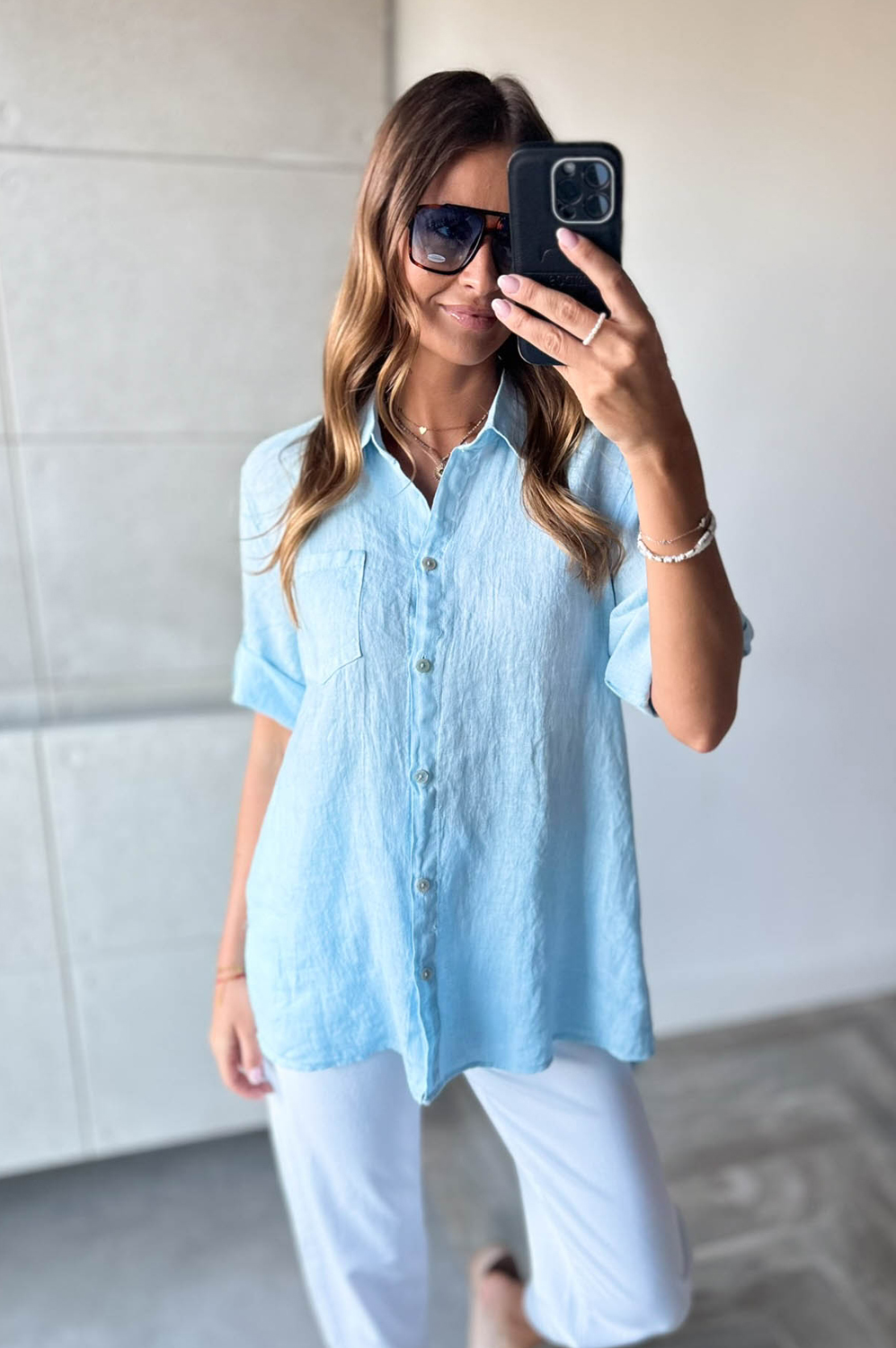 Bluzka koszulowa LEN DŁUGA błękit149.00 zł Najniższa cena towaru, która obowiązywała w okresie 30 dni przed zastosowaniem obniżki: 149.00 zł Opis Długa bluzka koszulowa wykonana z lnu. WYMIARY:
