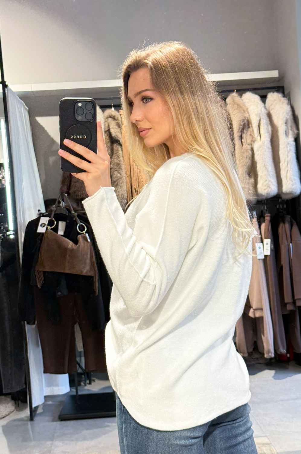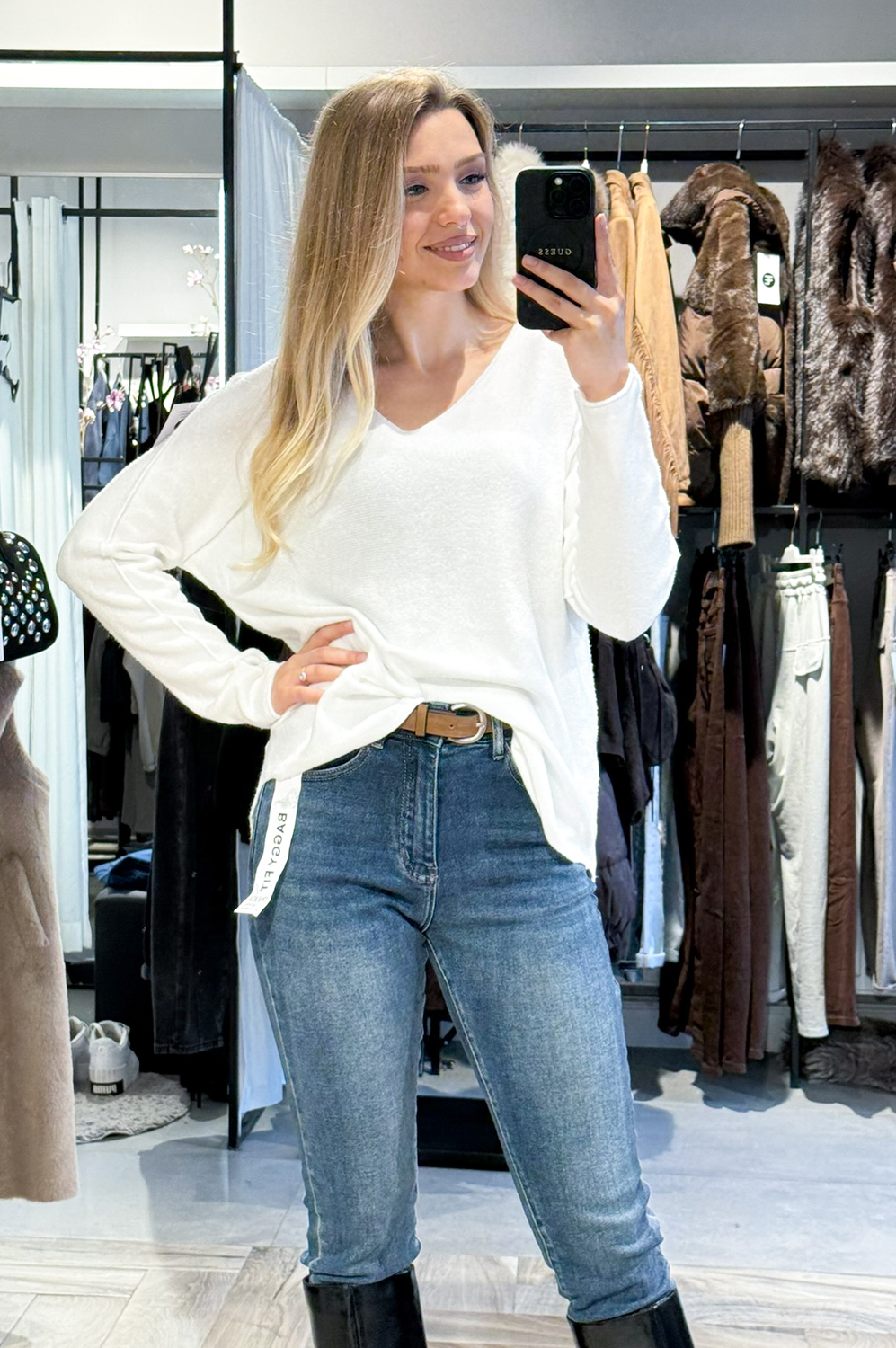 Sweterek SWETEREK SZPIC DŁUGI RĘKAW śmietanka139.00 zł Najniższa cena towaru, która obowiązywała w okresie 30 dni przed zastosowaniem obniżki: 139.00 zł Opis Sweterek o luźnym kroju w szpic. Sweterek jest długi i miękki. Sweterek wykonany jest z przemiłej w dotyku, elastycznej dzianiny. SKŁAD : 42% wiskoza 30% poliamid 28% poliester