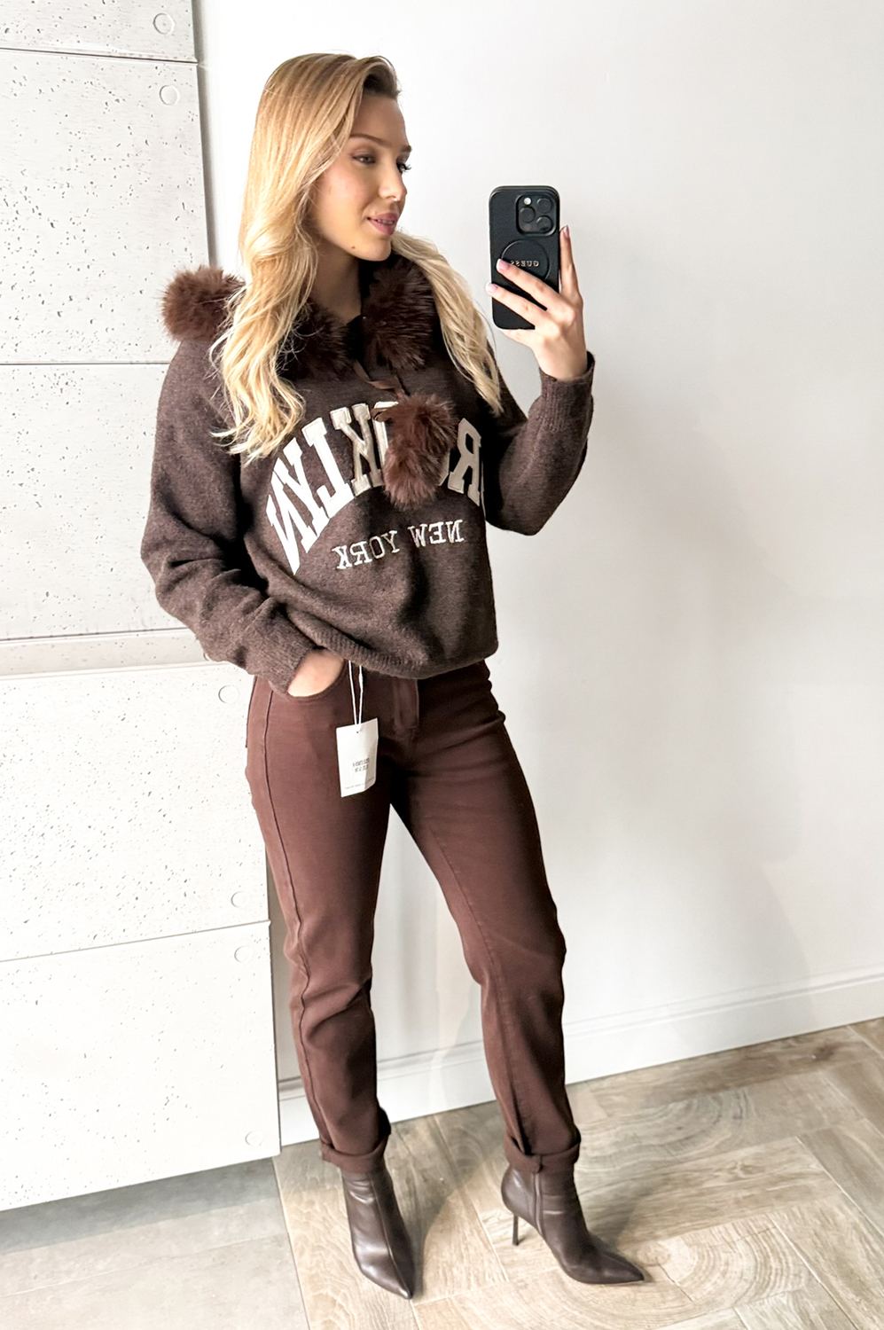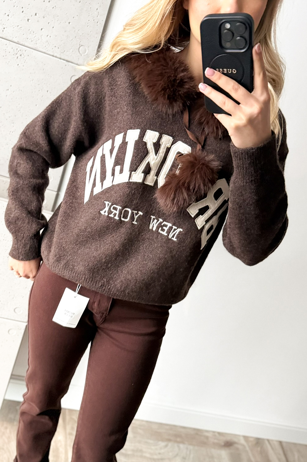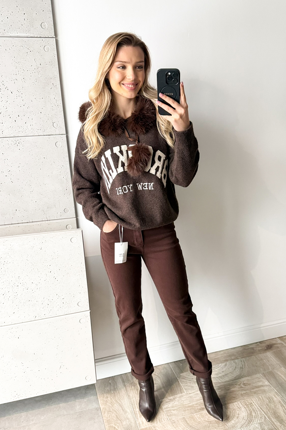 Sweterek BROOKLIN HOOD czekolada219.00 zł Najniższa cena towaru, która obowiązywała w okresie 30 dni przed zastosowaniem obniżki: 219.00 zł Opis Sweterek z kapturem. futerko w kapturze odpinane na guziczki WYMIARY: Pasuje na XS S M L