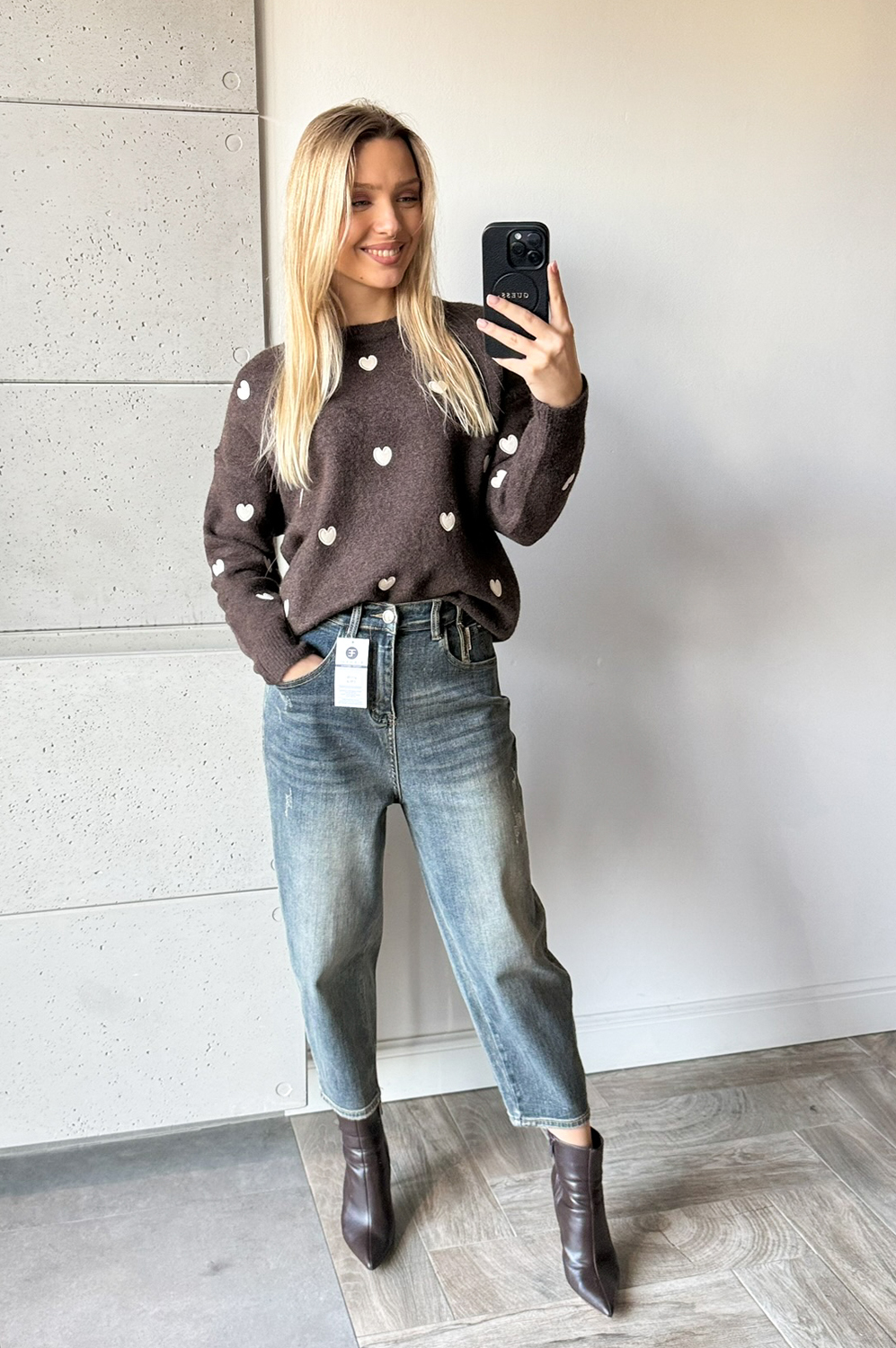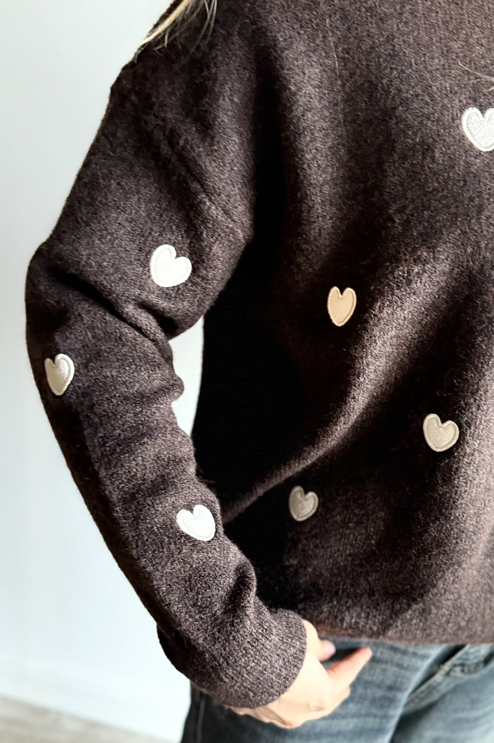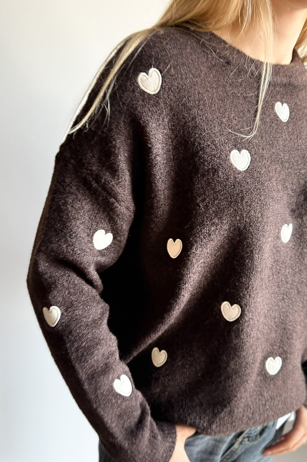 Sweterek SERCA CZEKOLADOWE189.00 zł Najniższa cena towaru, która obowiązywała w okresie 30 dni przed zastosowaniem obniżki: 189.00 zł Opis Sweterek z naszytymi serduzkami. WYMIARY: Pasuje na XS S M Ll