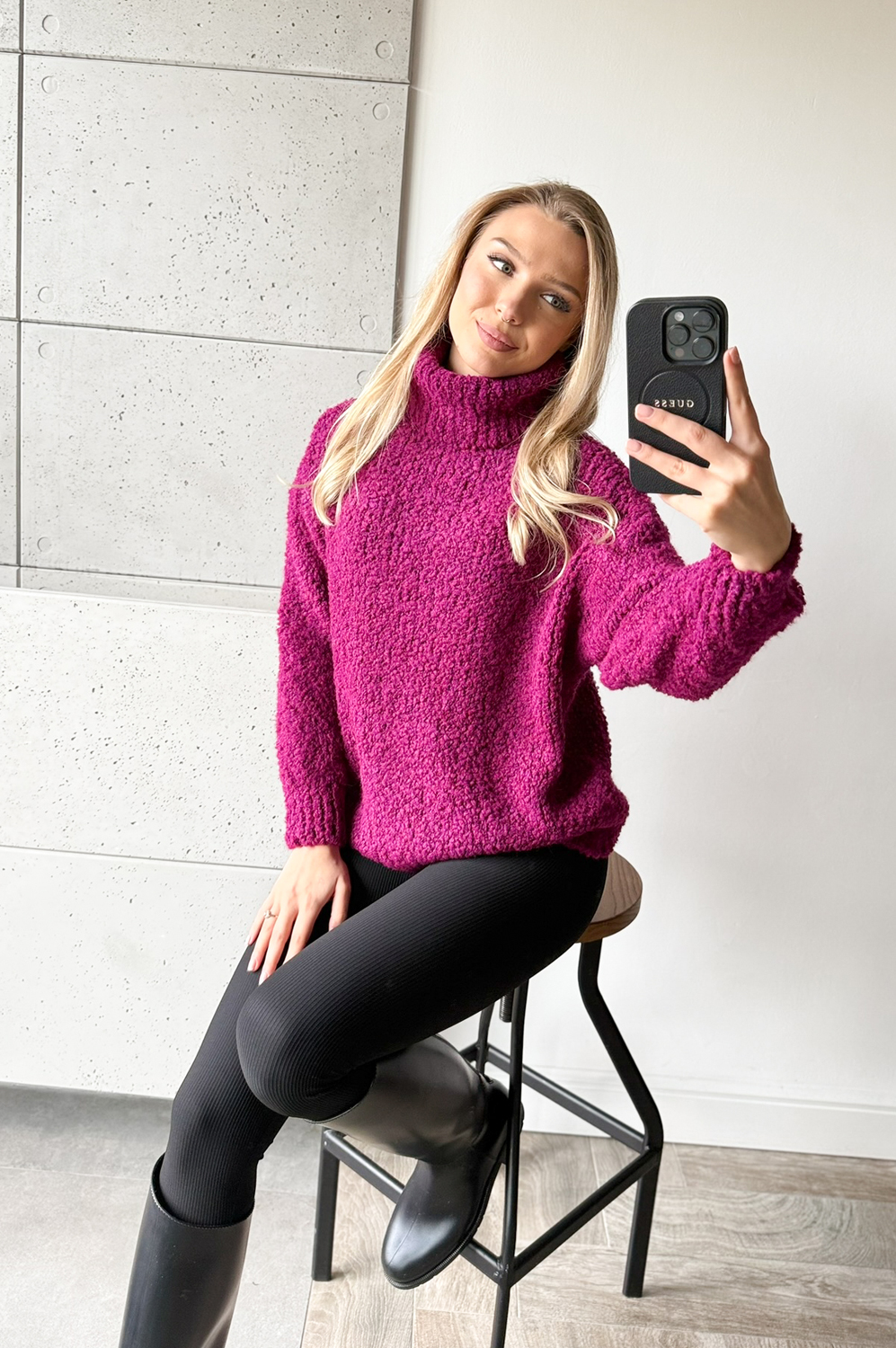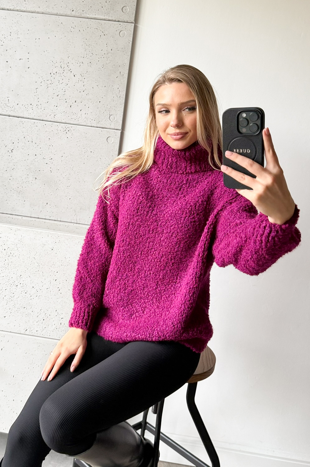 Sweterek GOLF BOUCLE amarena179.00 zł Najniższa cena towaru, która obowiązywała w okresie 30 dni przed zastosowaniem obniżki: 179.00 zł Opis SKŁAD : 62% akryl,8% wiskoza,8%wełna 18% polyester,4& alpaka MODELKA : Martyna-wzrost 170 cm, biodra 96 cm, pas 66 cm, biust 90 cm. Ma na sobie ONE SIZE Zwrot ZWROTY