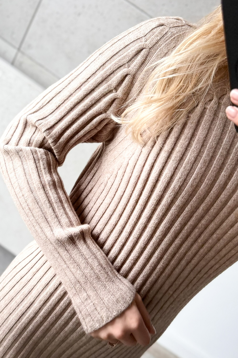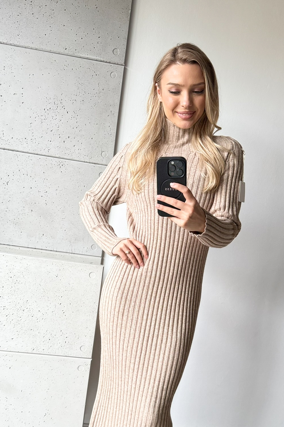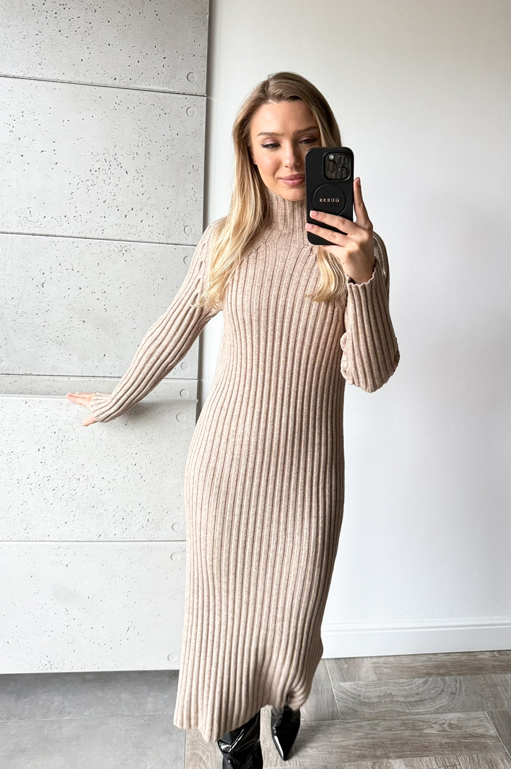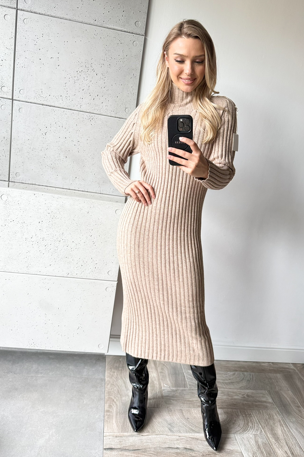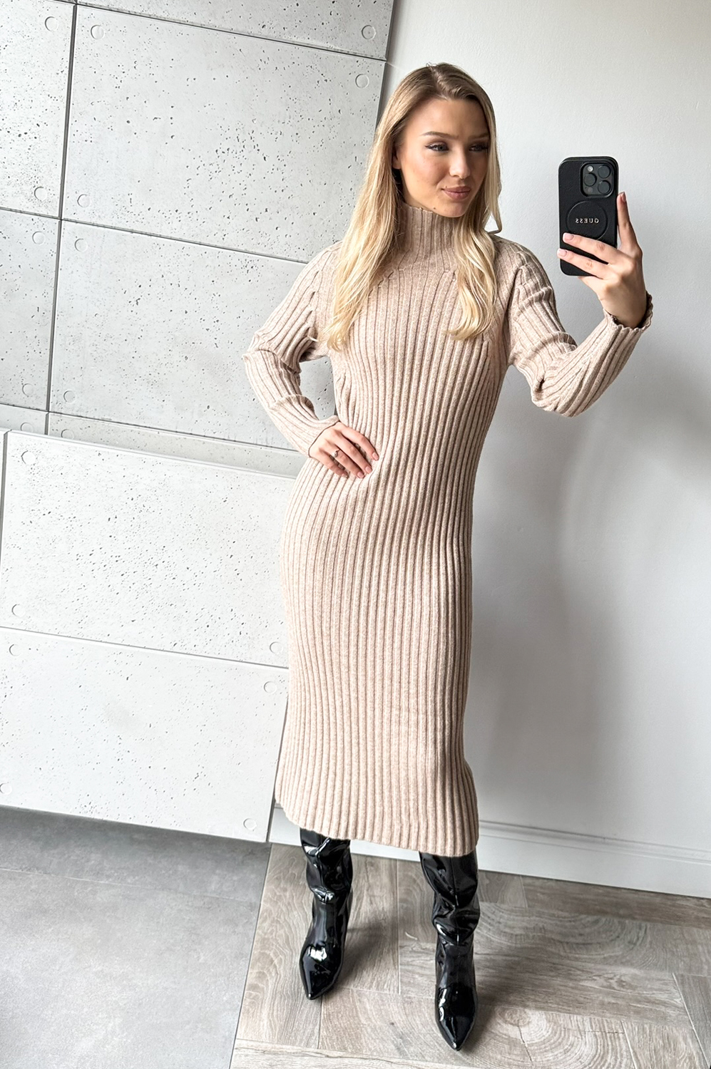 Sukienka CHIC PRĄŻEK beż199.00 zł Najniższa cena towaru, która obowiązywała w okresie 30 dni przed zastosowaniem obniżki: 199.00 zł Opis Sukienka w gruby prążek rewelacyjnie układa się na każdej sylwetce. Sukienka wykonana jest z przemiłej w dotyku, elastycznej dzianiny. WYMIARY: Pasuje do rozmiaru XS do L SKŁAD : wiskoza poliamid poliester