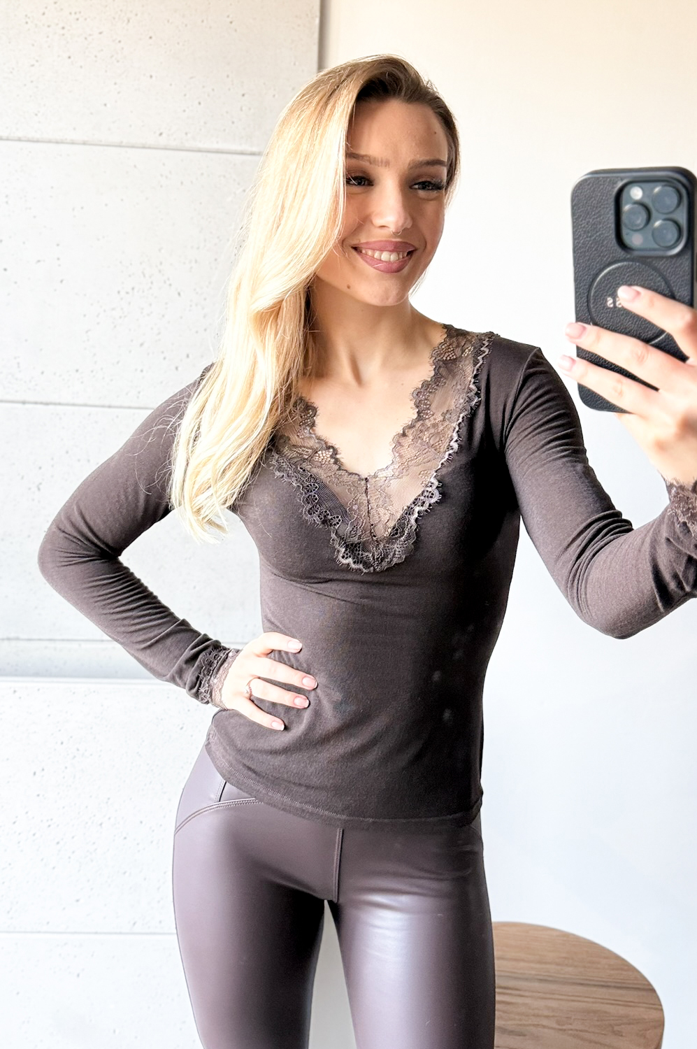 Bluzka KASZMIR SZPIC KORONKA czekolada129.00 zł Najniższa cena towaru, która obowiązywała w okresie 30 dni przed zastosowaniem obniżki: 129.00 zł Opis Bluzka dopaowana, elastyczna z dzianiny lekko prześwitującej. Dzianina bardzo elastyczna, cienka i miękka. Przy dekolcie miękka koronka. WYMIARY: Bluzka dopasowana
