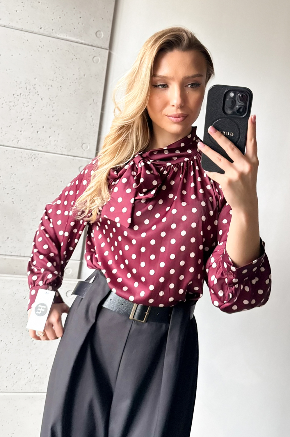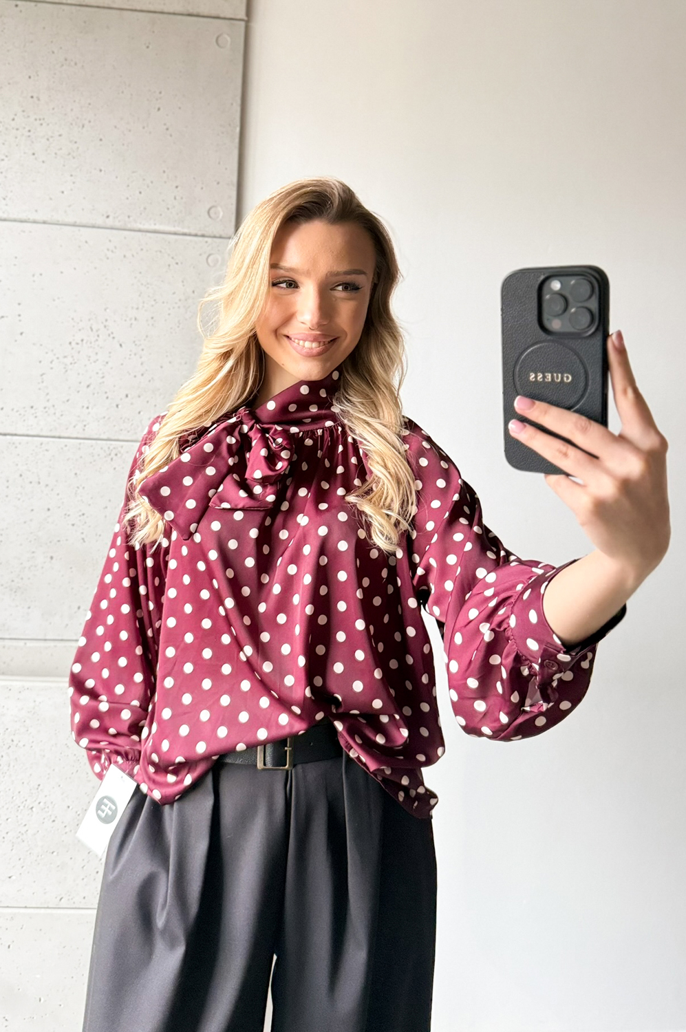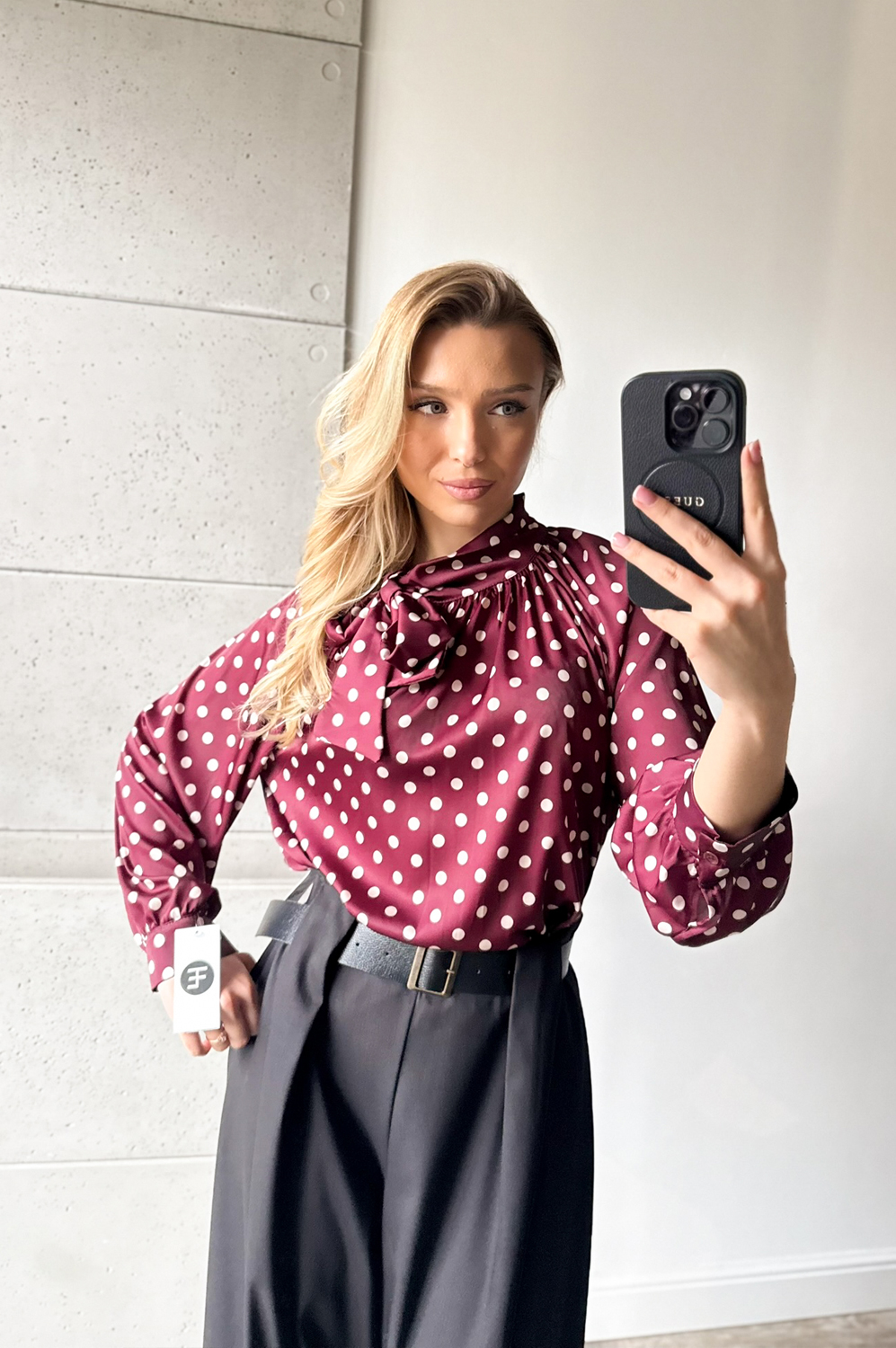 Bluzka SATYNA KROPKI czerwone wino149.00 zł Najniższa cena towaru, która obowiązywała w okresie 30 dni przed zastosowaniem obniżki: 149.00 zł Opis Tkanina satynowa, cienka i miękka. Wiązana przy szyji. Bardzo przyjemny w dotyku materiał. WYMIARY: Pasuje na XS/S/M/L
