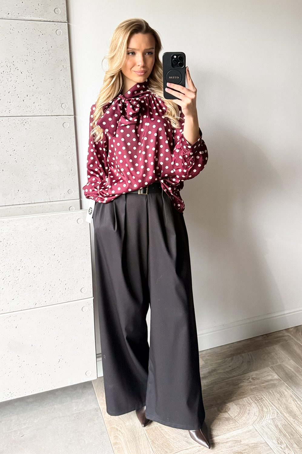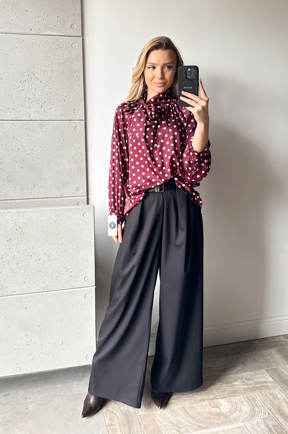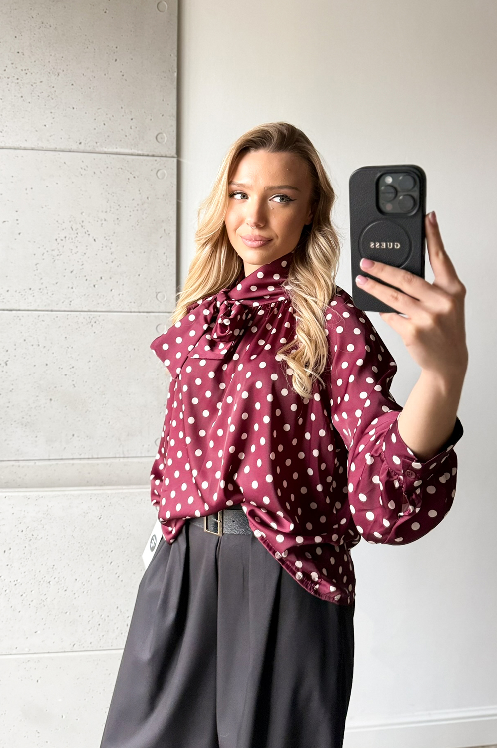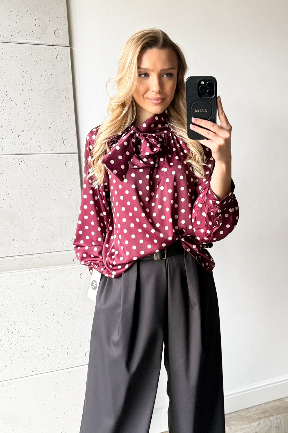 Bluzka SATYNA KROPKI czerwone wino149.00 zł Najniższa cena towaru, która obowiązywała w okresie 30 dni przed zastosowaniem obniżki: 149.00 zł Opis Tkanina satynowa, cienka i miękka. Wiązana przy szyji. Bardzo przyjemny w dotyku materiał. WYMIARY: Pasuje na XS/S/M/L