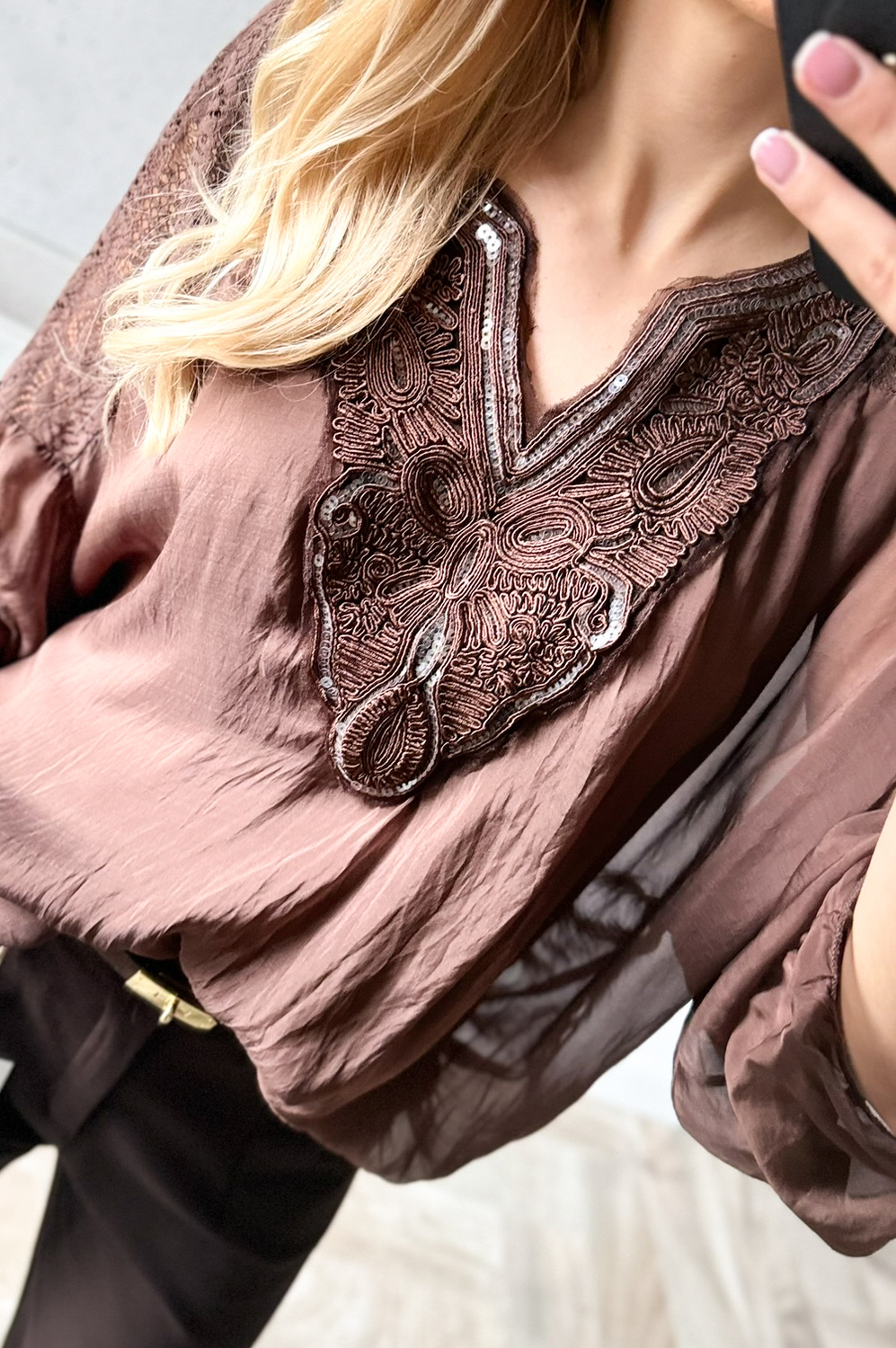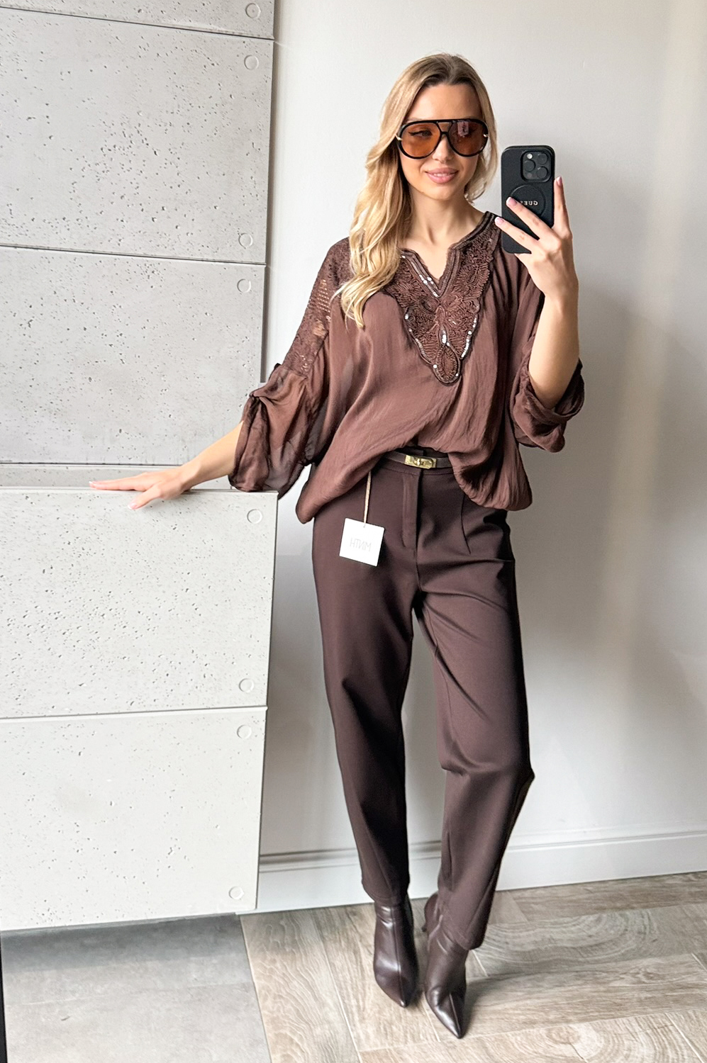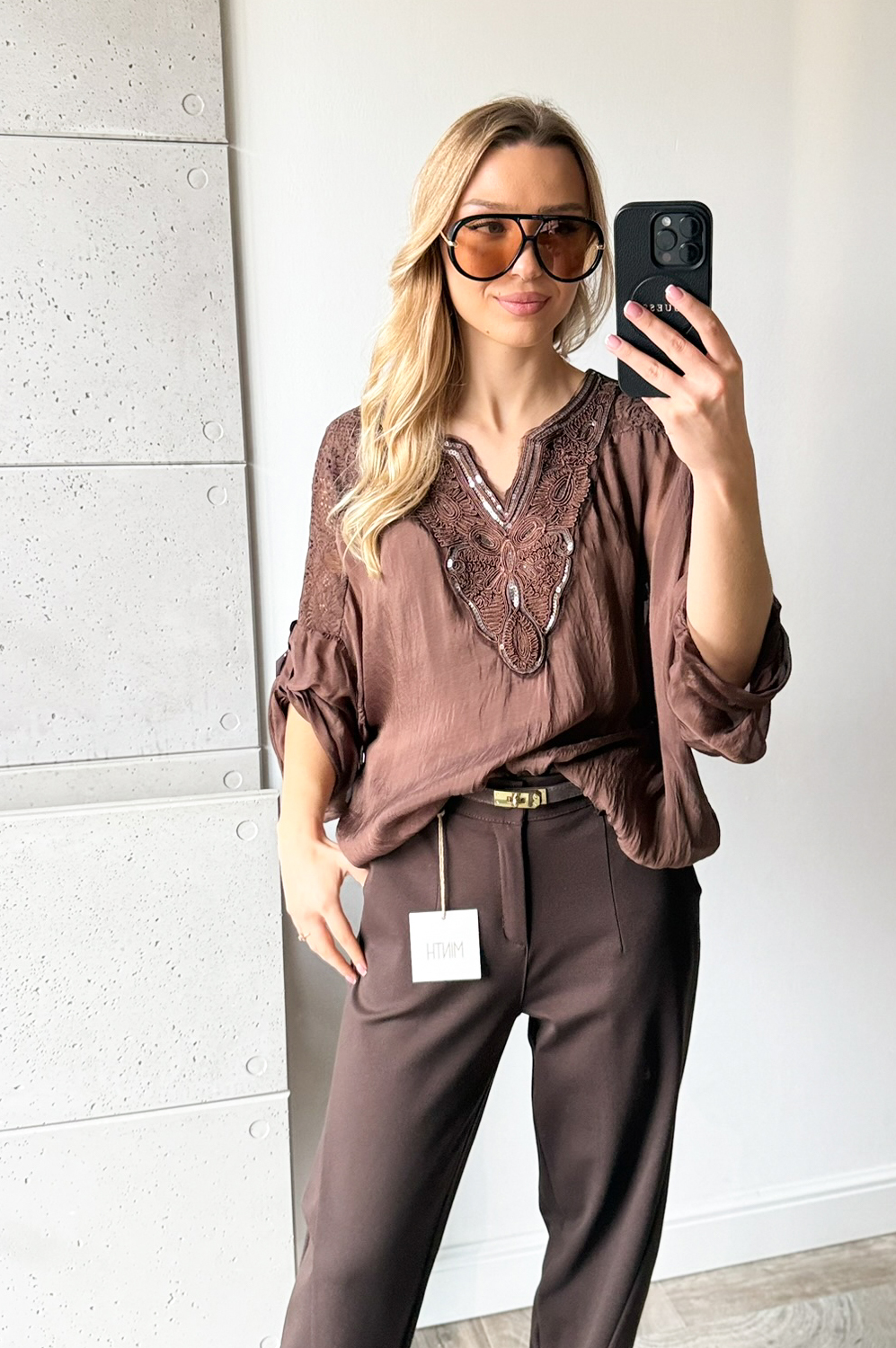 Bluzka koszulowa JEDWABNY CEKIN czekolada159.00 zł Najniższa cena towaru, która obowiązywała w okresie 30 dni przed zastosowaniem obniżki: 159.00 zł Opis Zwrot ZWROTY