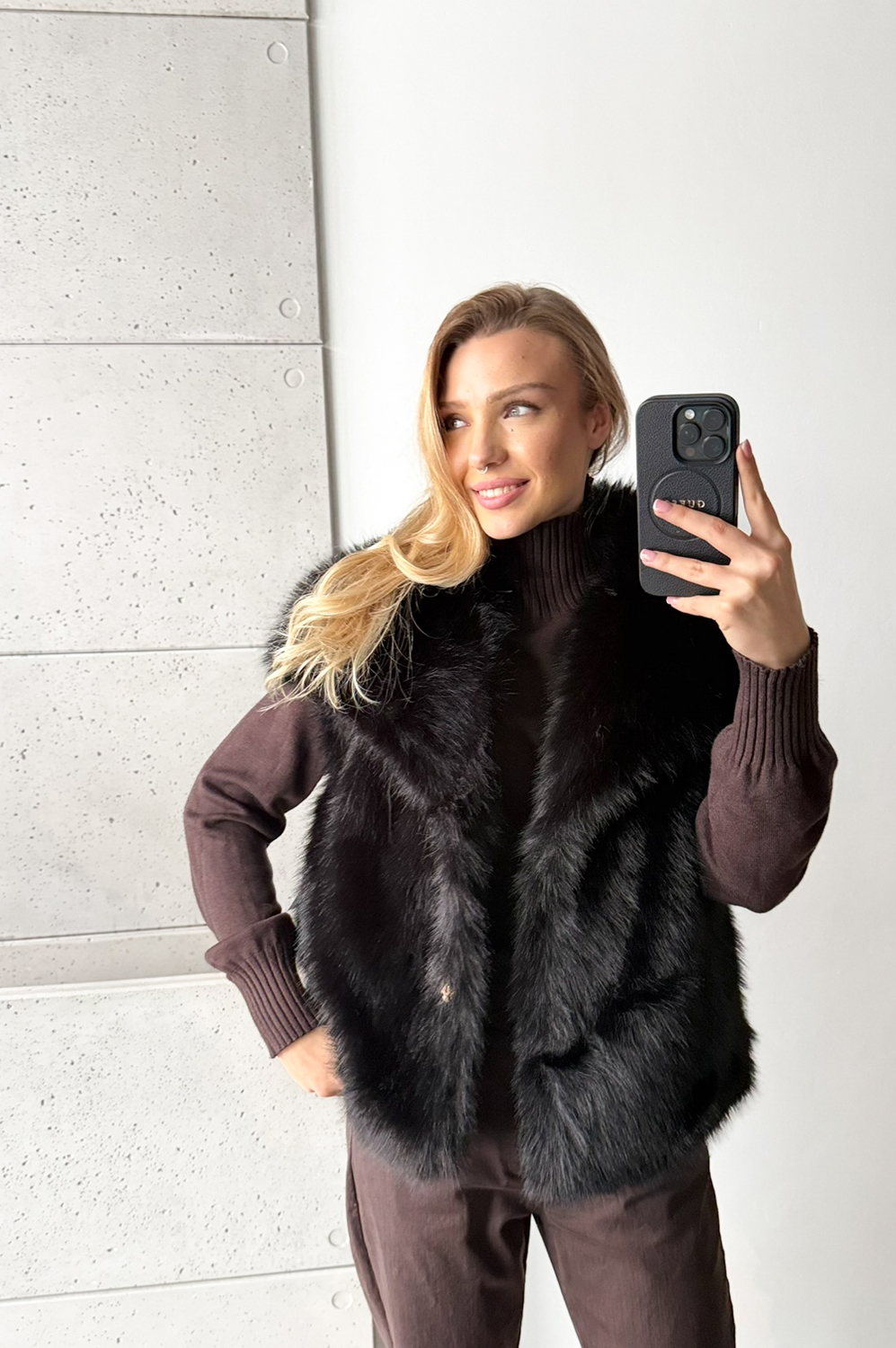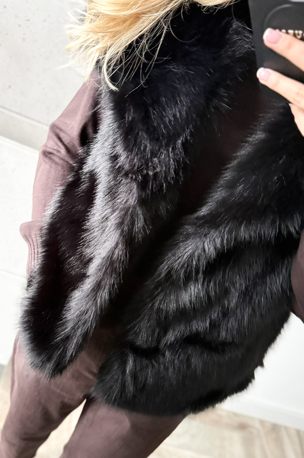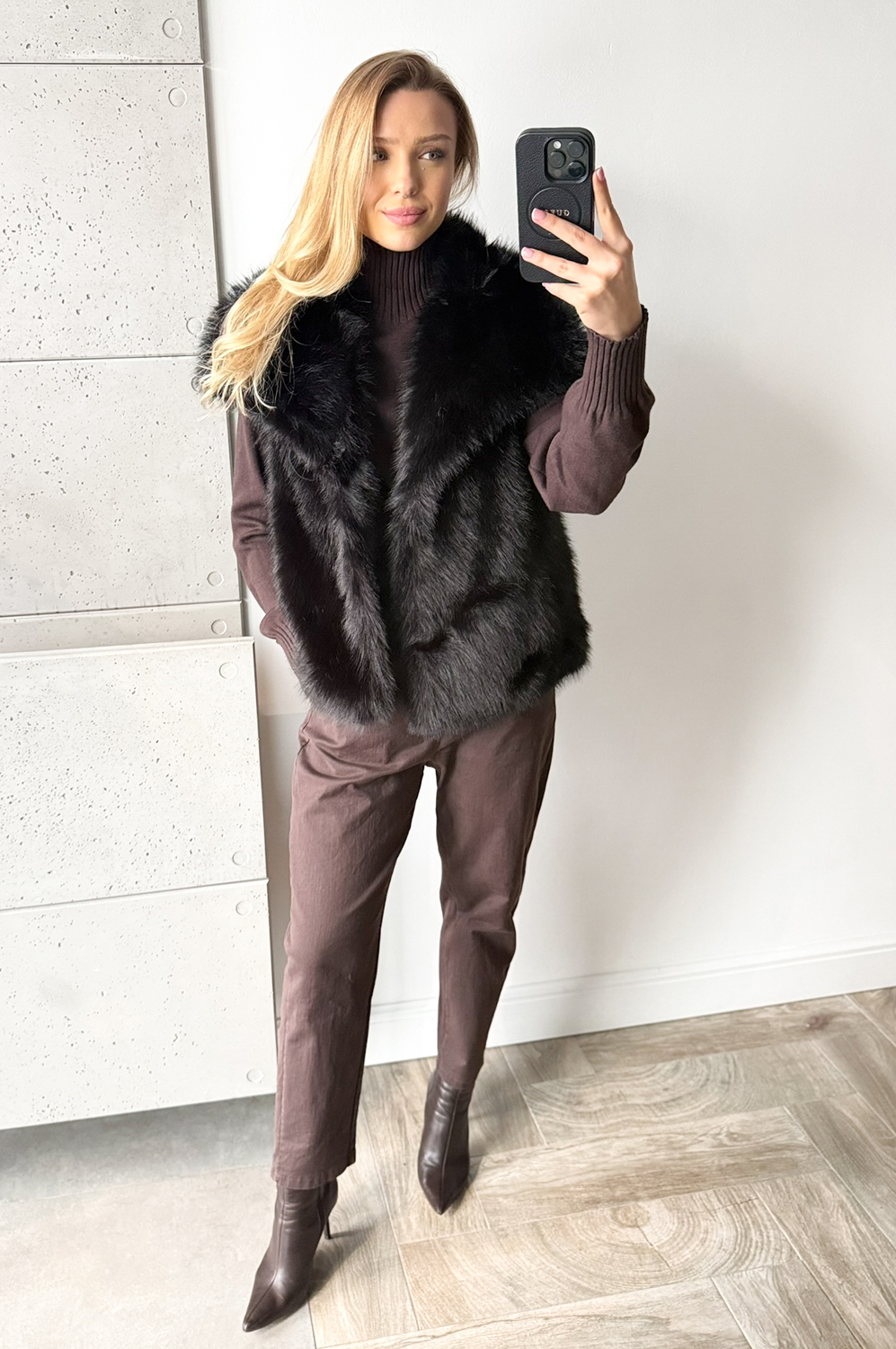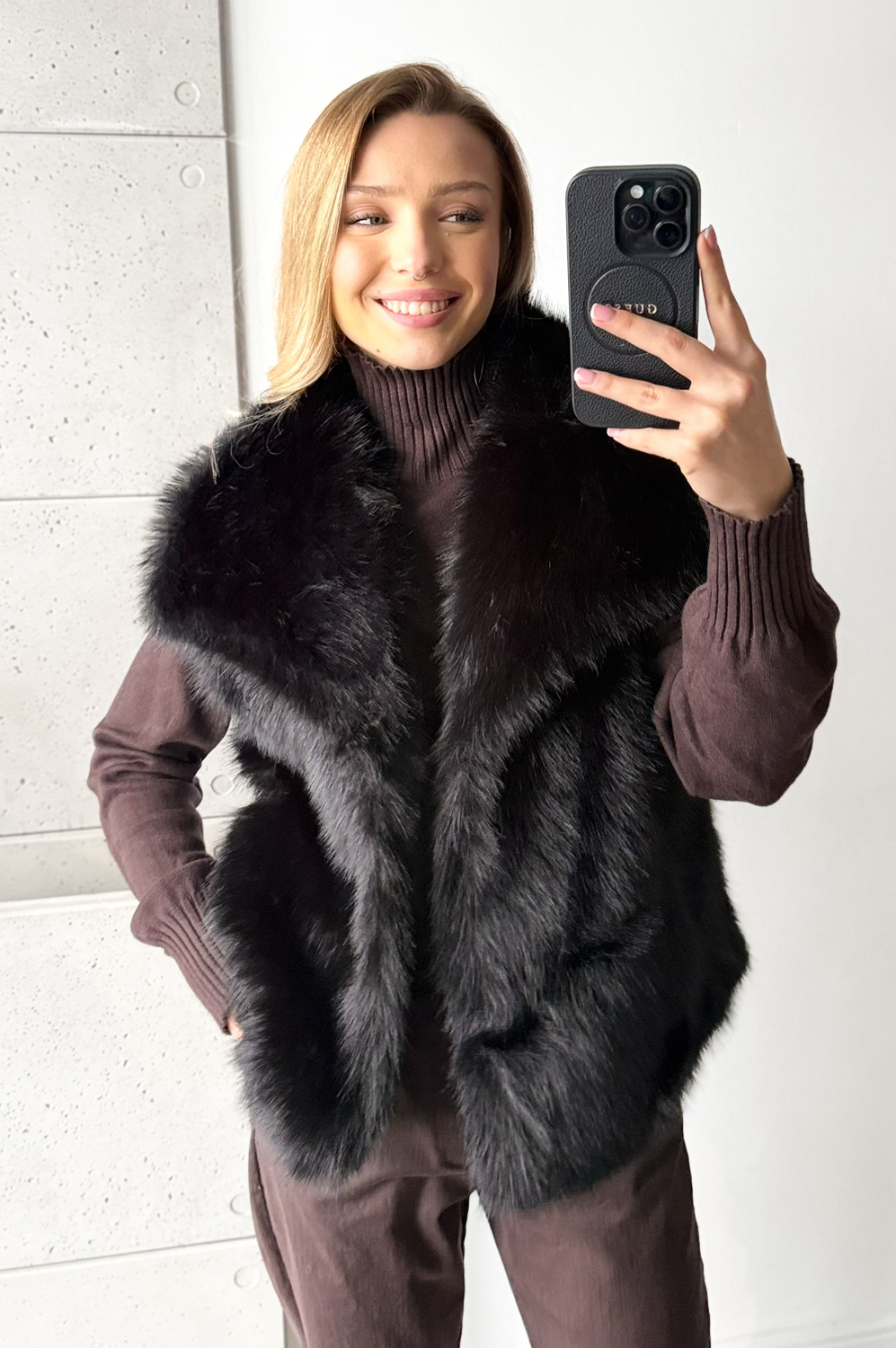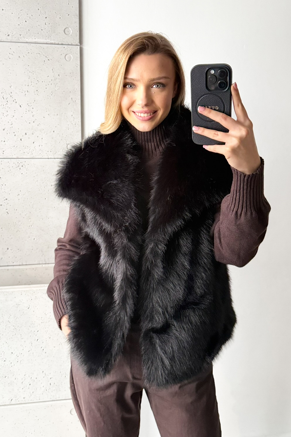 Kamizelka FUTRO Z KOŁNIERZEM czarne199.00 zł Najniższa cena towaru, która obowiązywała w okresie 30 dni przed zastosowaniem obniżki: 199.00 zł Opis Kamizelka delikatnie oversizowa z kieszeniami, zapinana na napy. Wykonana z futerka na podszewce.