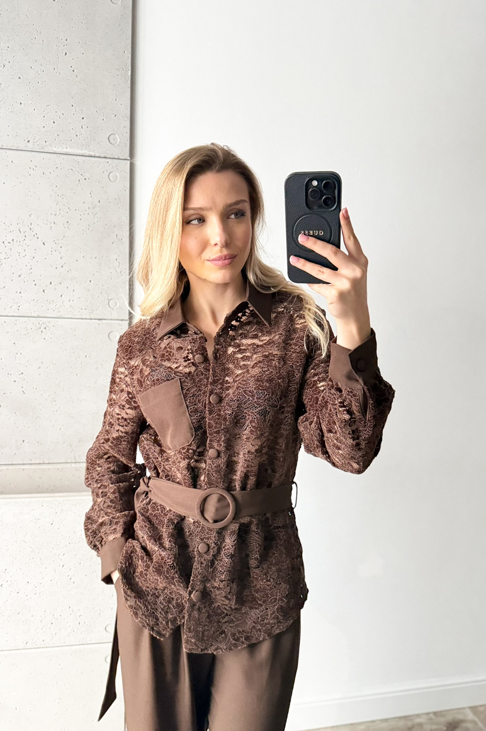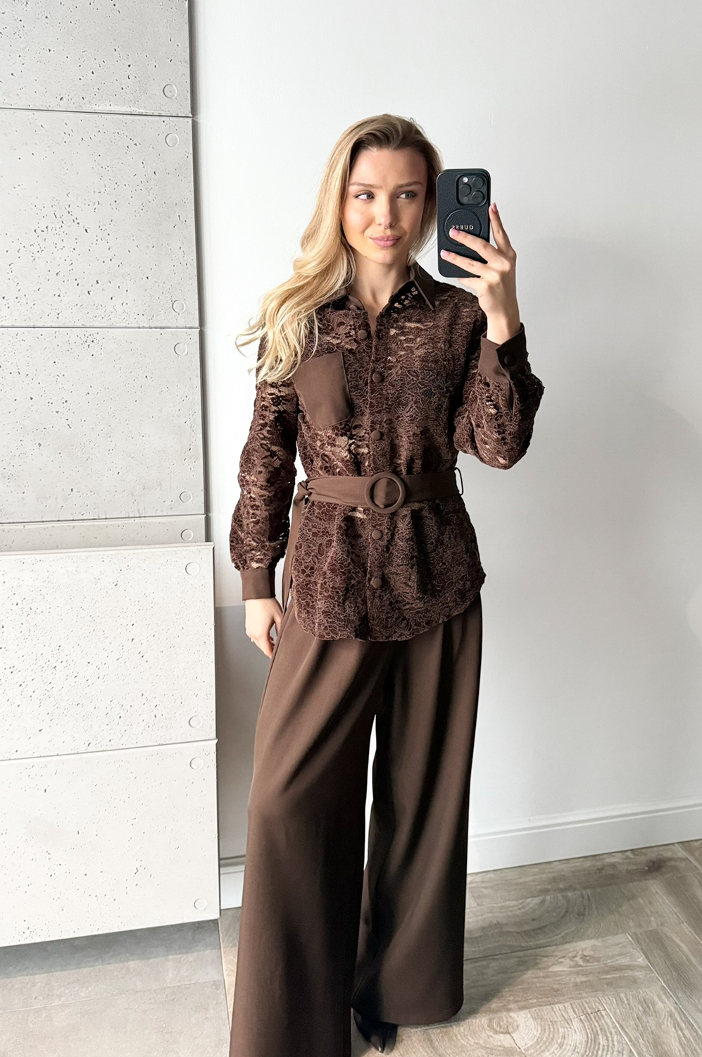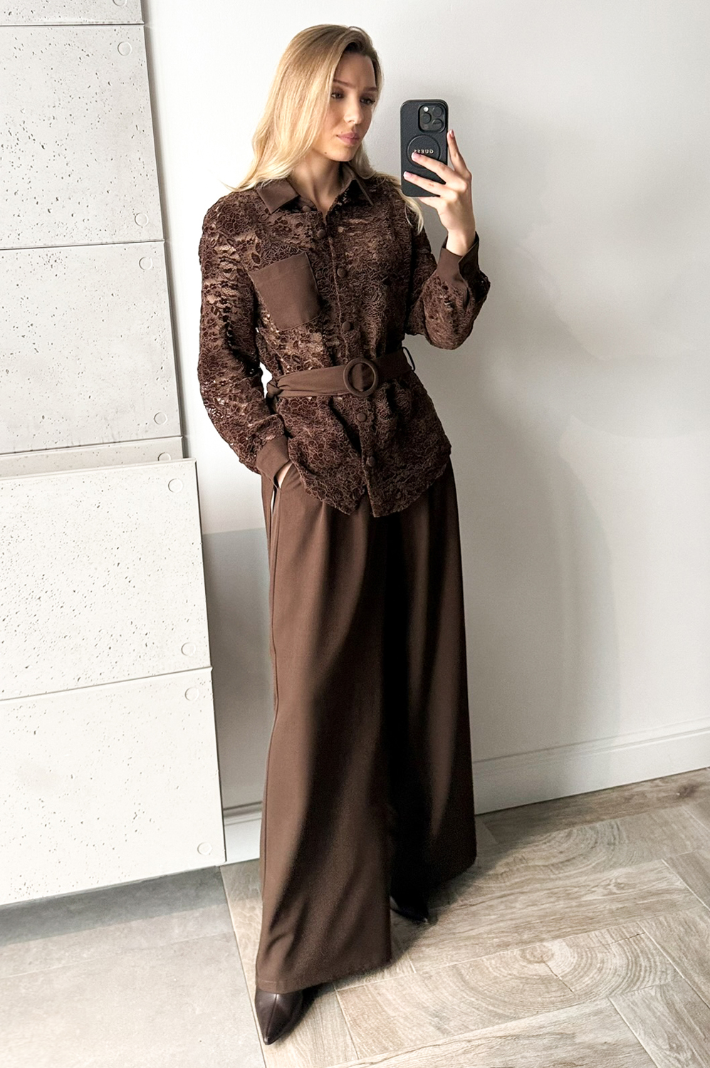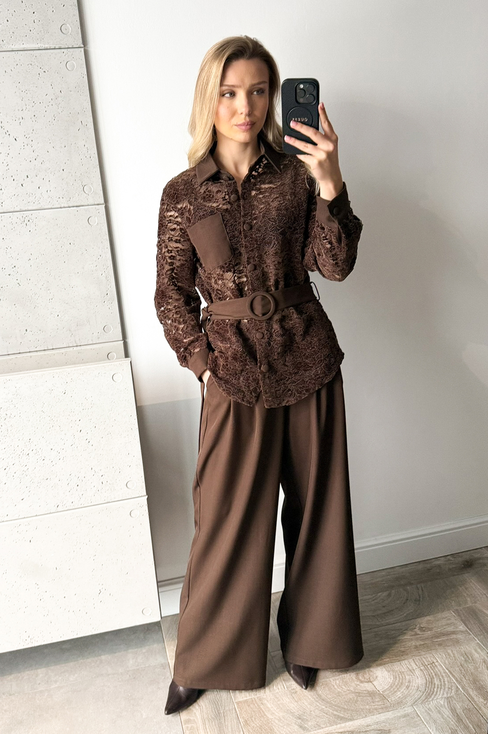 Kombinezon GIPIURA KORONKA olivkova czekolada319.00 zł Najniższa cena towaru, która obowiązywała w okresie 30 dni przed zastosowaniem obniżki: 319.00 zł Opis Piękny komplet dwuczęściowy, składający się z bluzki koszulowej z koronki gipiurowej, z długim rękawkiem z mankietem, zapinanej na guziczki oraz naszytą kieszonką. Spodnie szerokie, proste, z kieszeniami, w pasie tyłu gumka. Dodatkowo komplet posiada niezależny paseczek z tej samej tkaniny. Koronka jest grubsza i mięsista z delikatnym meszkiem. WYMIARY: