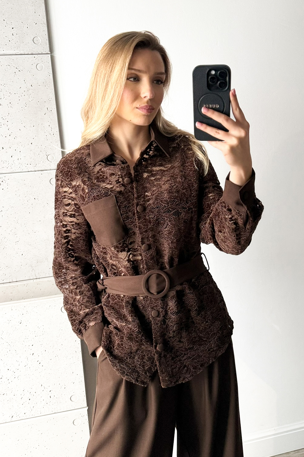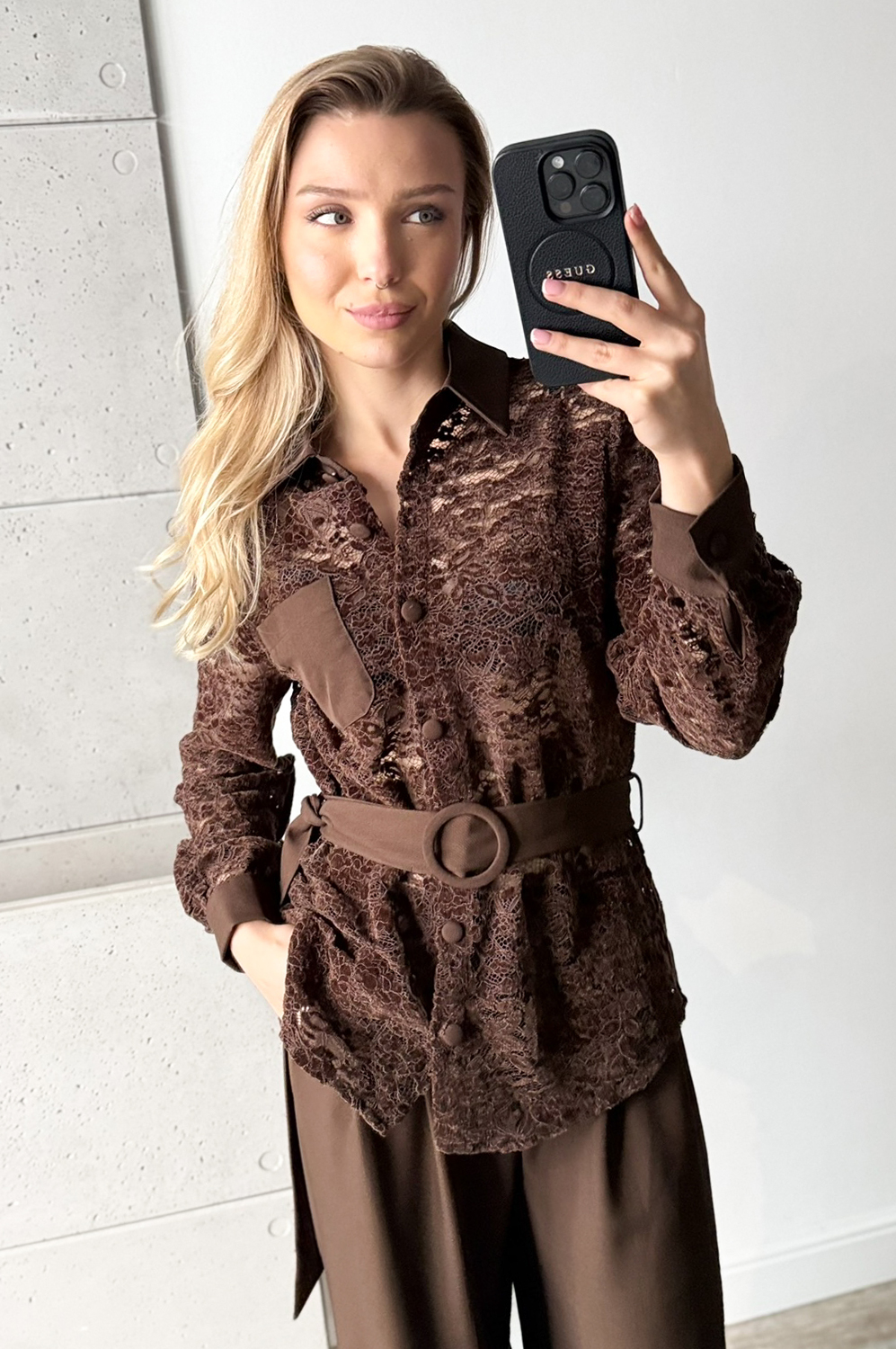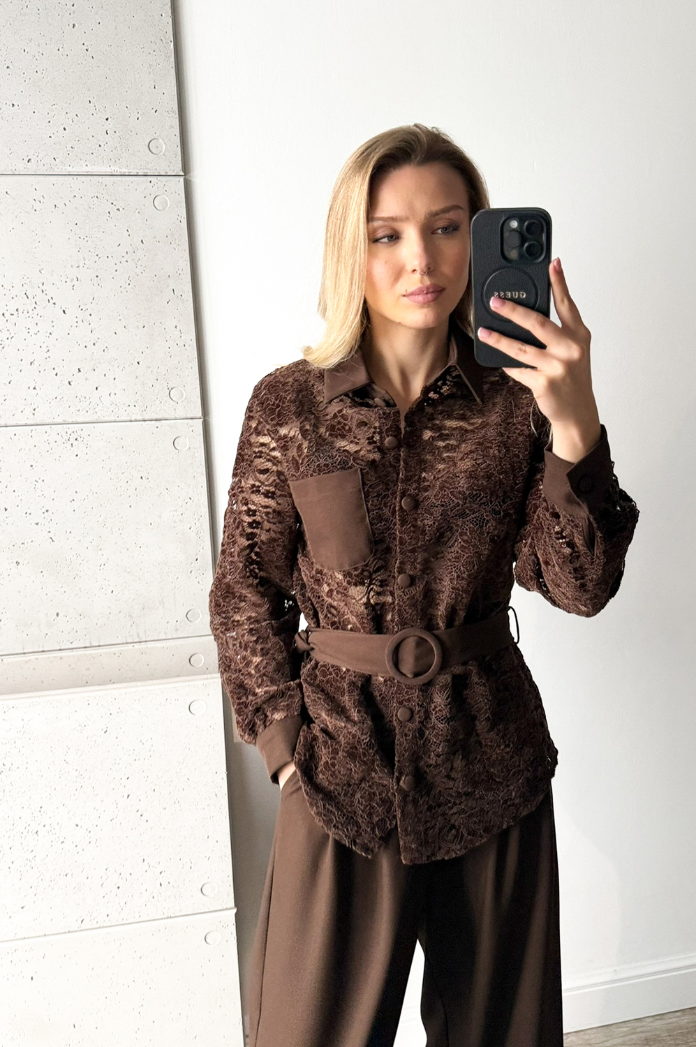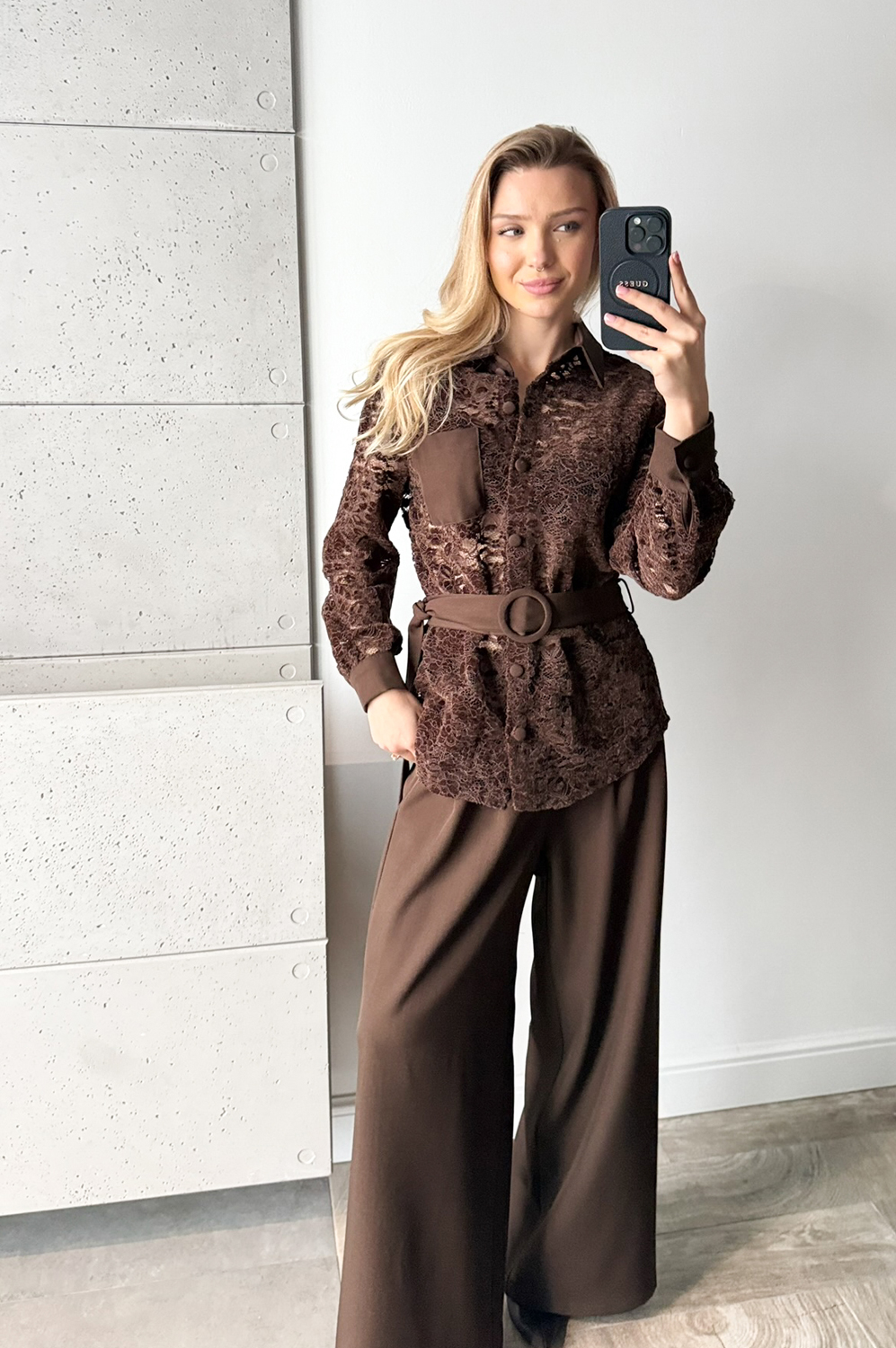 Kombinezon GIPIURA KORONKA olivkova czekolada319.00 zł Najniższa cena towaru, która obowiązywała w okresie 30 dni przed zastosowaniem obniżki: 319.00 zł Opis Piękny komplet dwuczęściowy, składający się z bluzki koszulowej z koronki gipiurowej, z długim rękawkiem z mankietem, zapinanej na guziczki oraz naszytą kieszonką. Spodnie szerokie, proste, z kieszeniami, w pasie tyłu gumka. Dodatkowo komplet posiada niezależny paseczek z tej samej tkaniny. Koronka jest grubsza i mięsista z delikatnym meszkiem. WYMIARY: