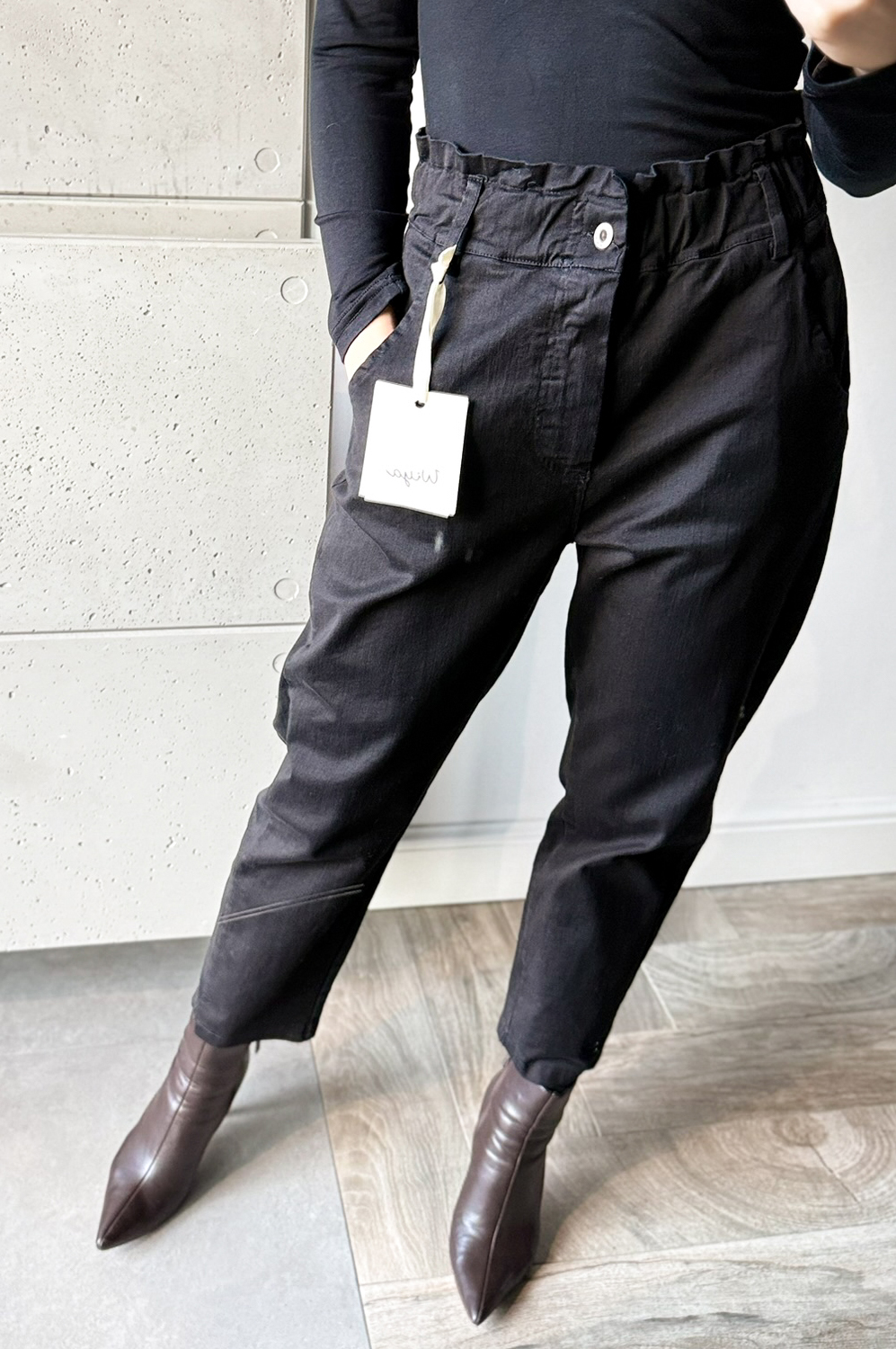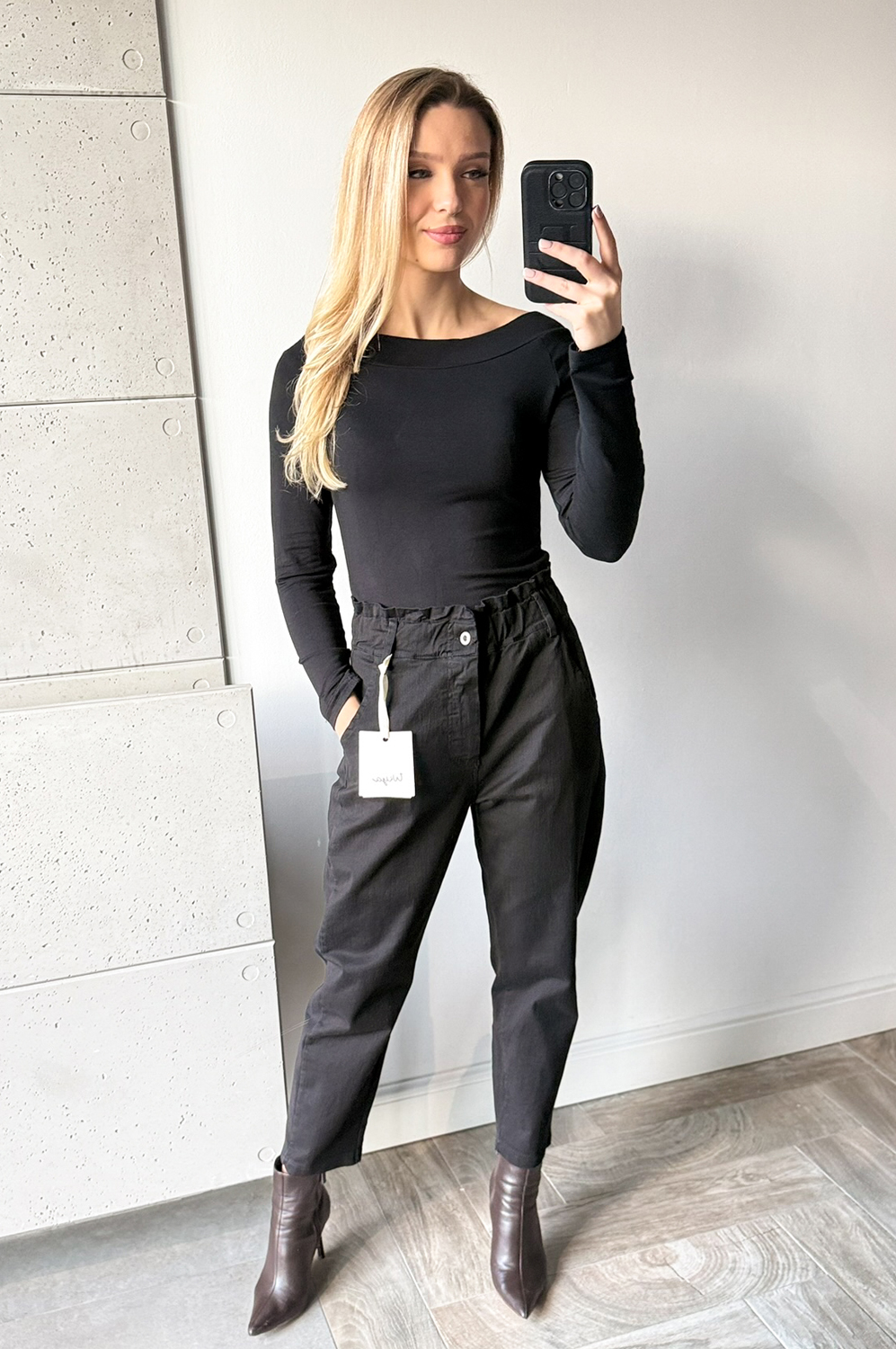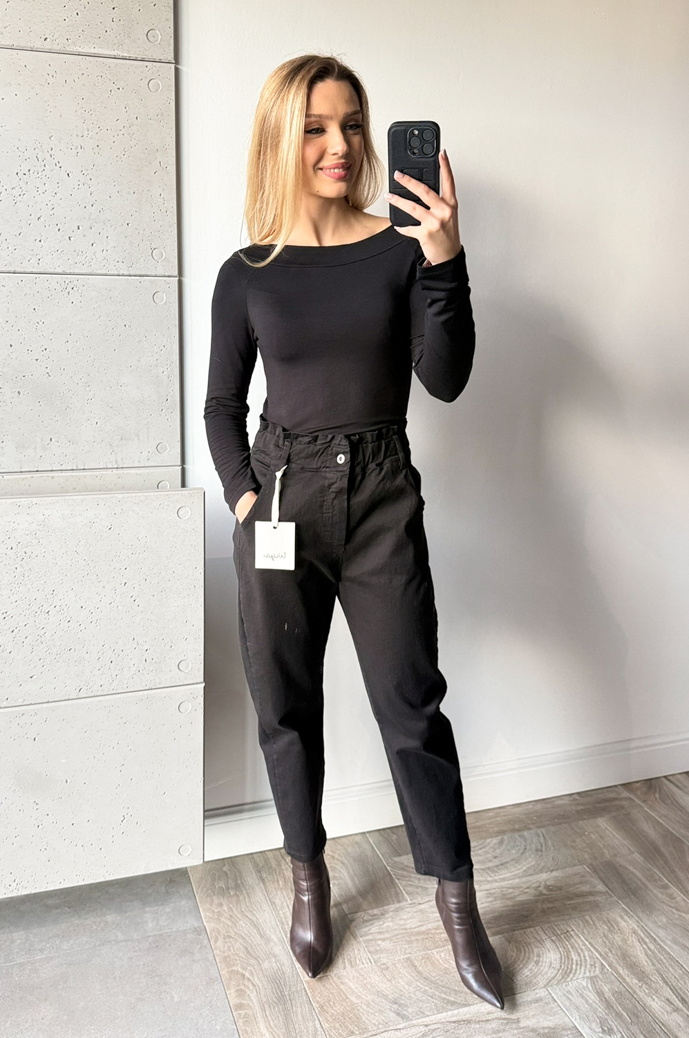 Spodnie WIYA BAWEŁNIANE czarne179.00 zł Najniższa cena towaru, która obowiązywała w okresie 30 dni przed zastosowaniem obniżki: 179.00 zł Opis Spodnie włoskiej marki Wiya, wykonane z bawełny. W pasie posiadają gumę. długość S-M 95 cm,pas 68 do 86
