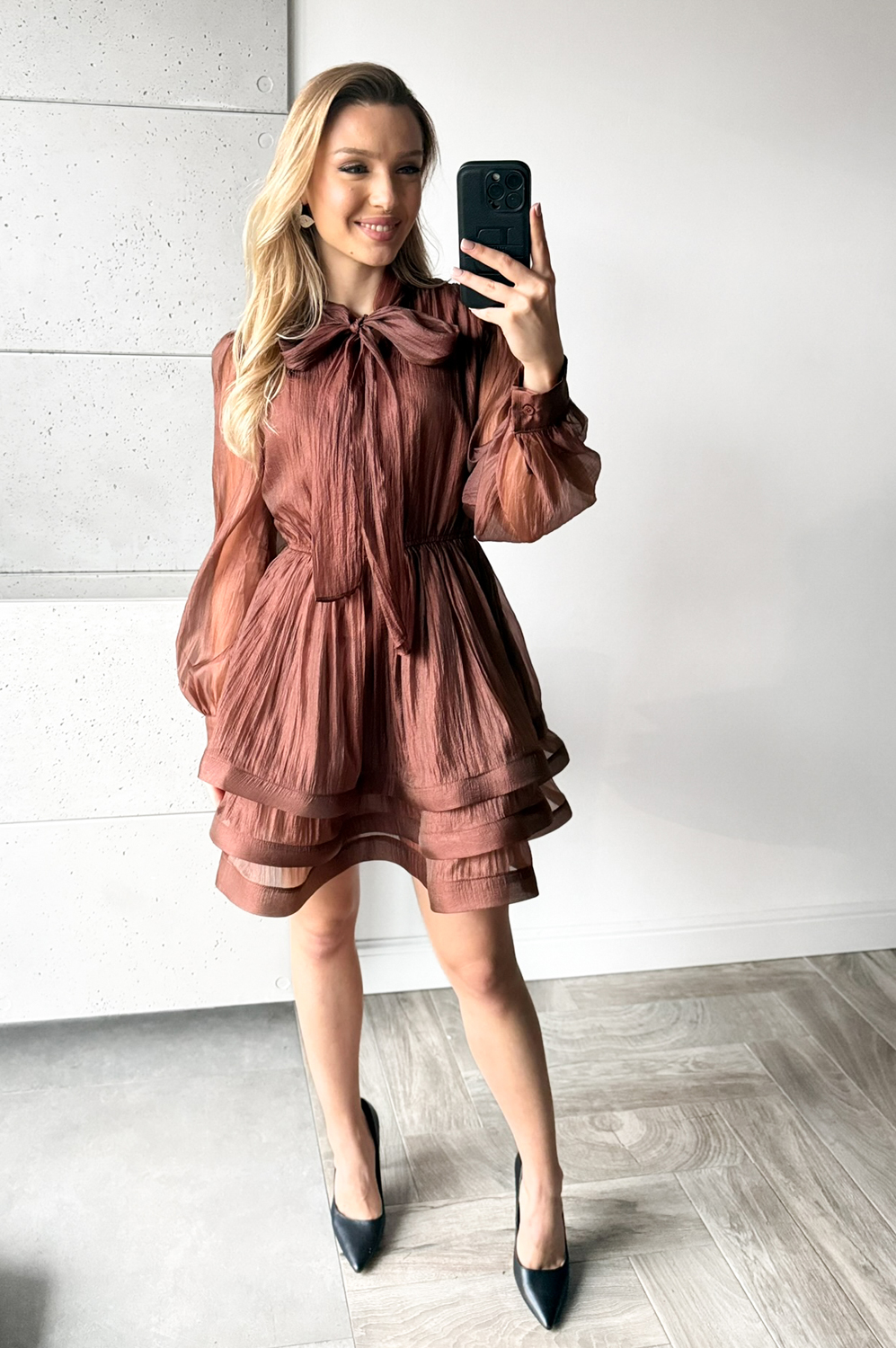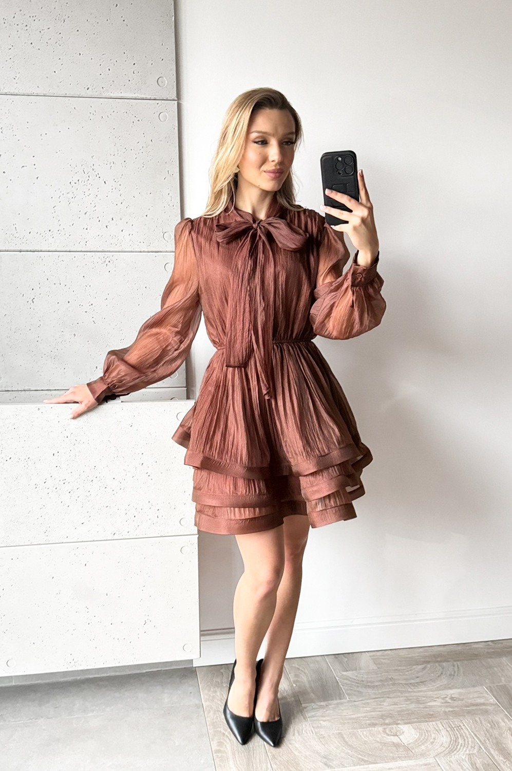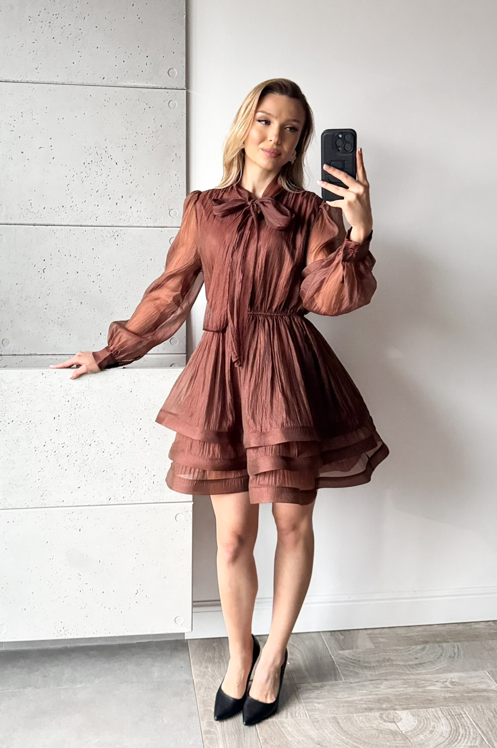Sukienka GIFT karmel z cynamonem319.00 zł Najniższa cena towaru, która obowiązywała w okresie 30 dni przed zastosowaniem obniżki: 319.00 zł Opis Sukienka wykonana z tkaniny szyfonowej. Tkanina jest efektowna. Dół sukienki z usztywnieniem. W pasie gumka. WYMIARY: Pasuje na XS/S/M