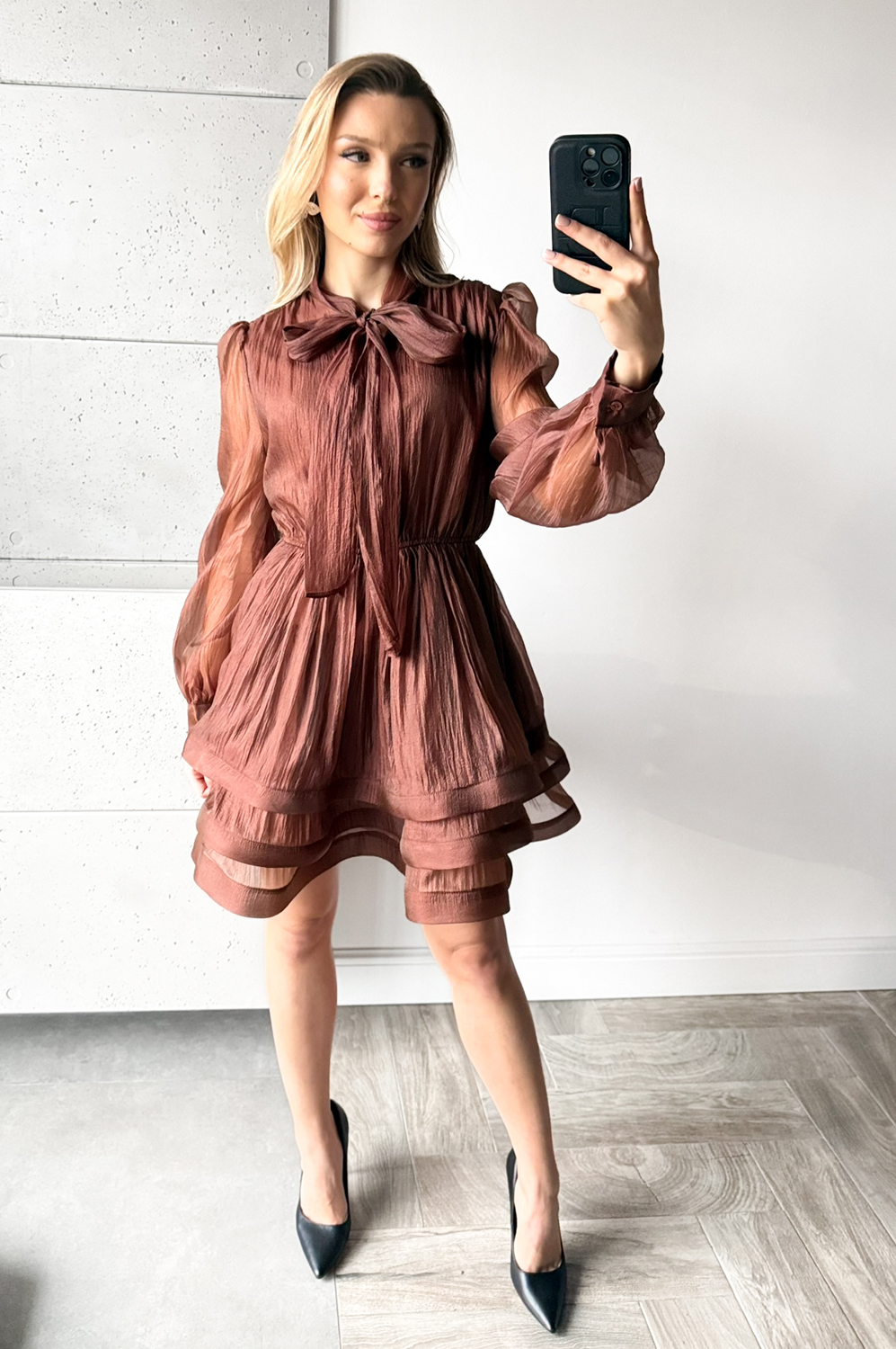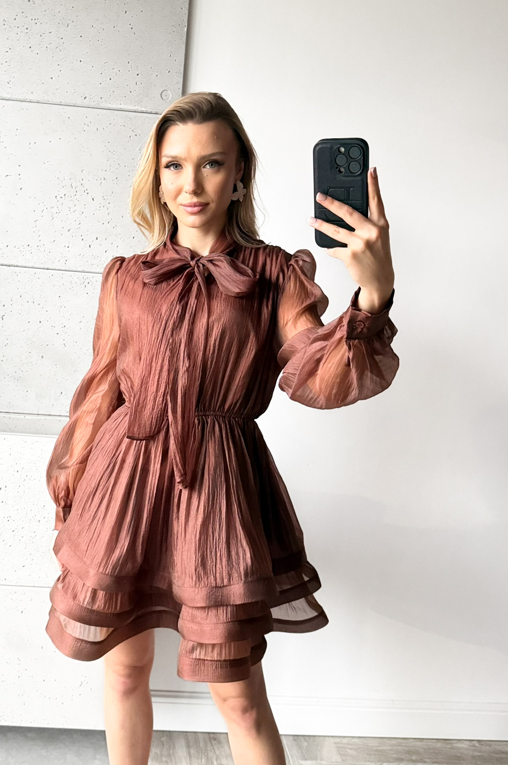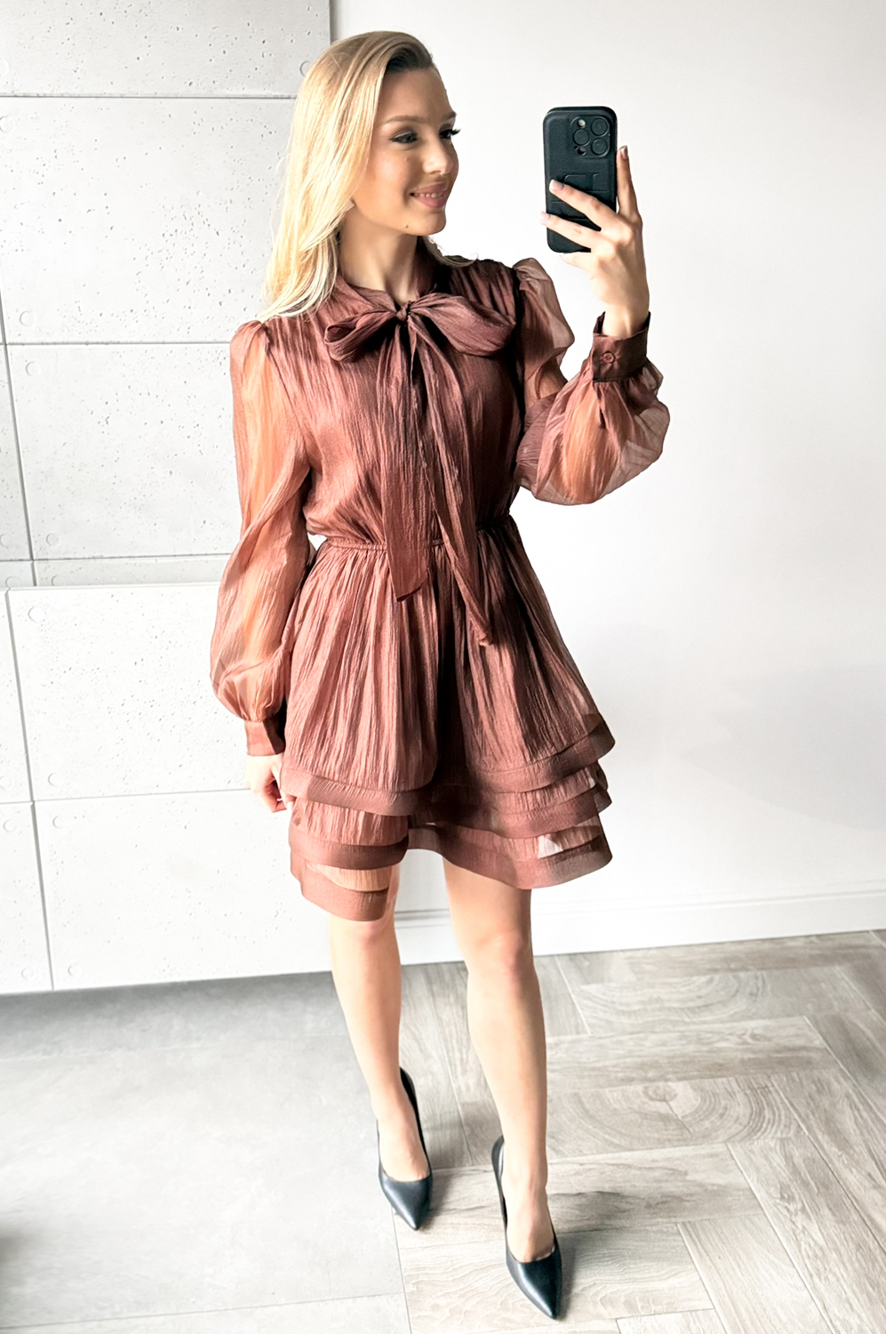 Sukienka GIFT karmel z cynamonem319.00 zł Najniższa cena towaru, która obowiązywała w okresie 30 dni przed zastosowaniem obniżki: 319.00 zł Opis Sukienka wykonana z tkaniny szyfonowej. Tkanina jest efektowna. Dół sukienki z usztywnieniem. W pasie gumka. WYMIARY: Pasuje na XS/S/M