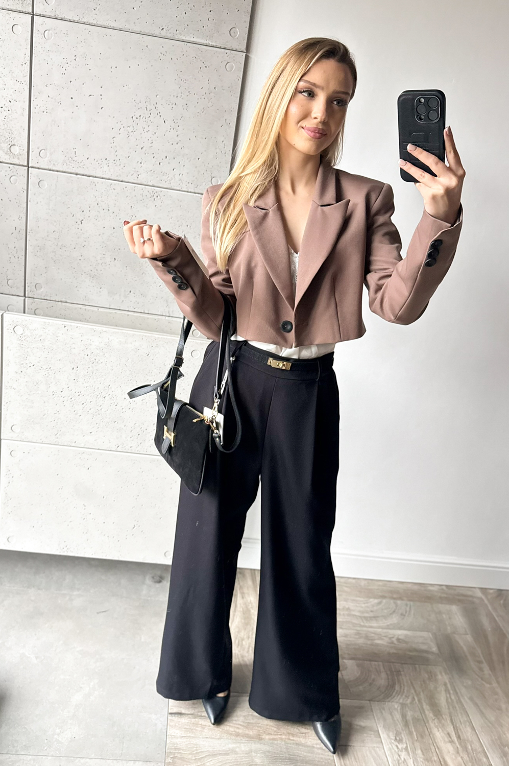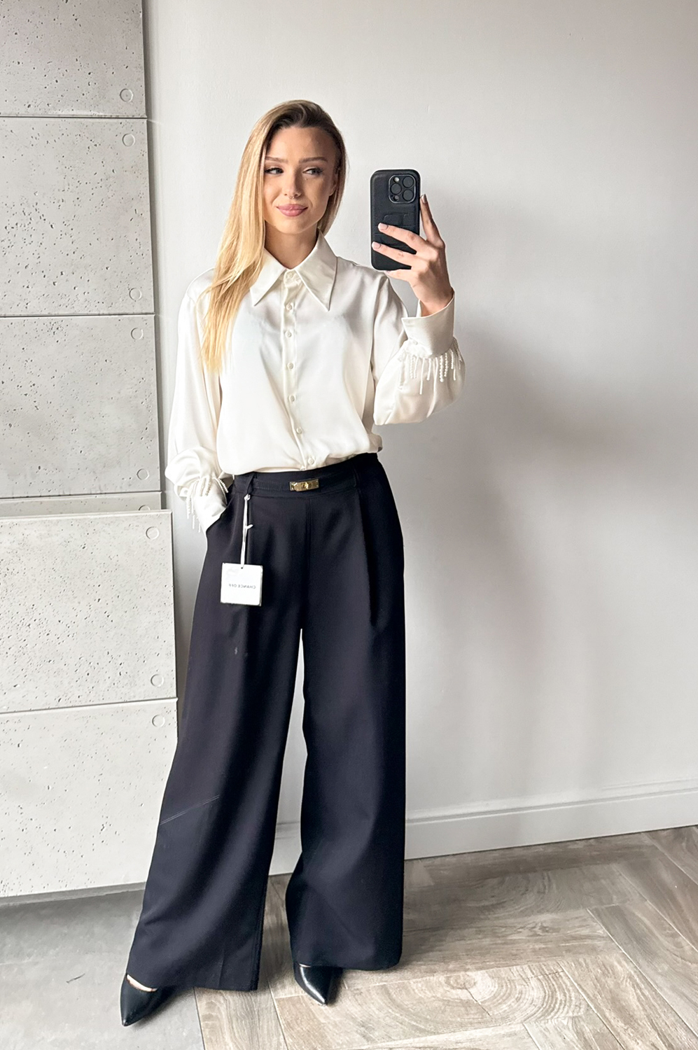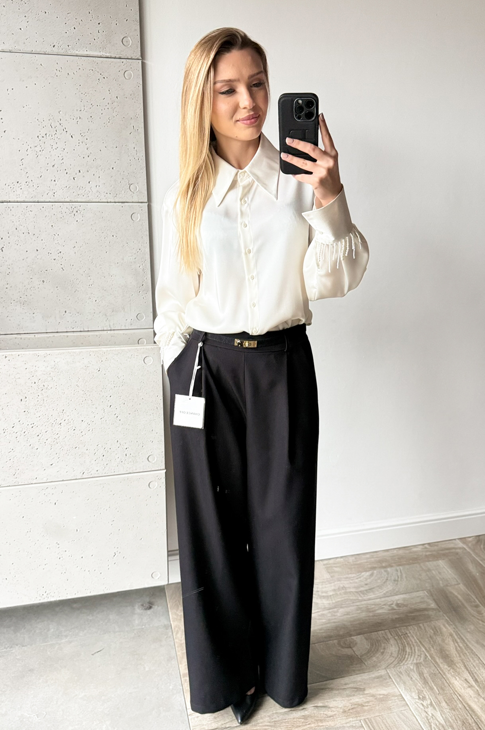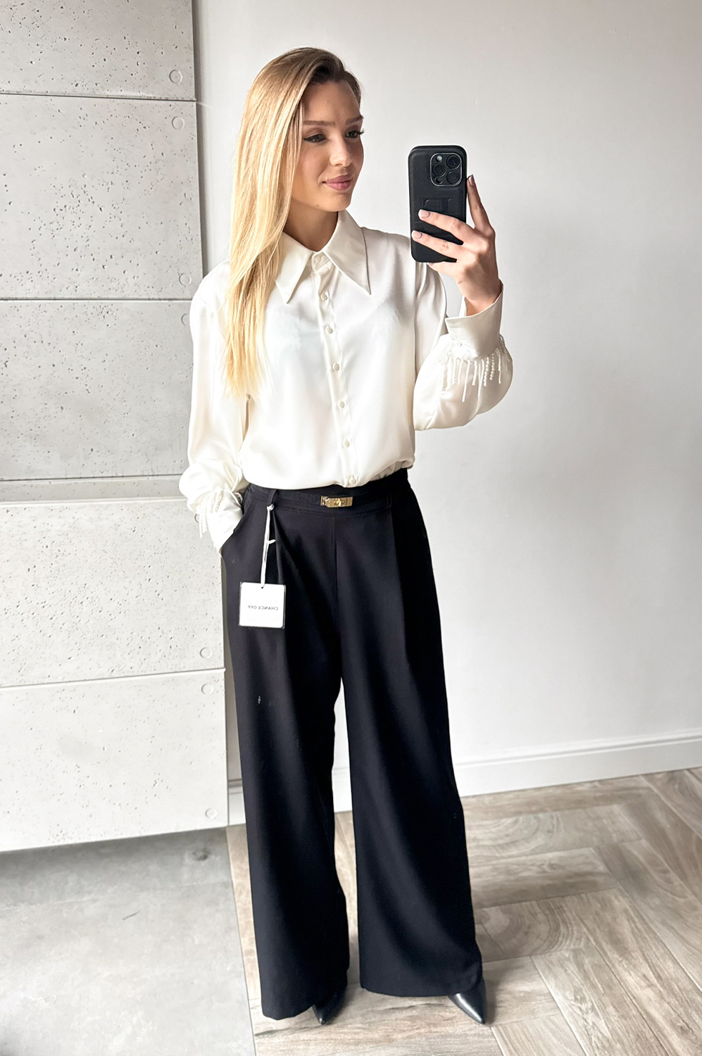 Spodnie z prostą nogawką, wykonane z dodatkiem wiskozy. W pasie w tyle  posiadają gumę. Pasek nie należy do kompletu.