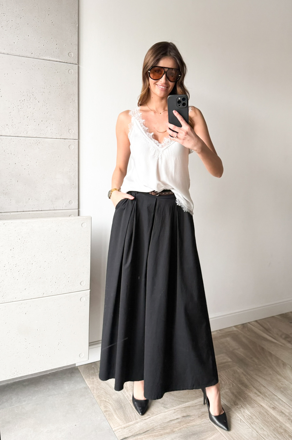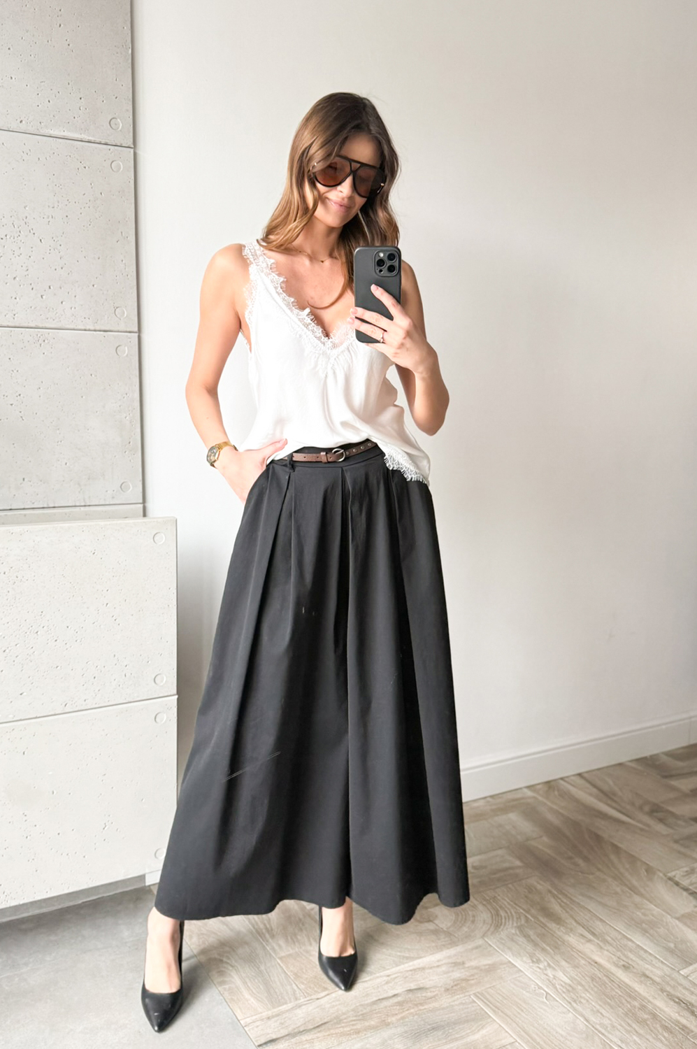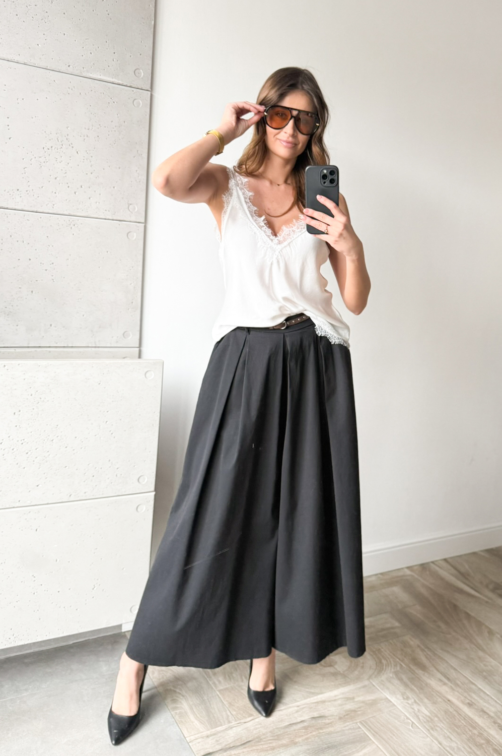 Spodnie SPÓDNICO-SPODNIE CZARNE179.00 zł Najniższa cena towaru, która obowiązywała w okresie 30 dni przed zastosowaniem obniżki: 179.00 zł Opis Spódnico spodnie w gumę. Swietna jakość. WYMIARY: długość 101 cm, szerokośc w pasie 68-102 cm