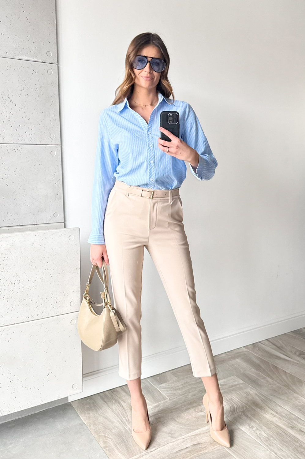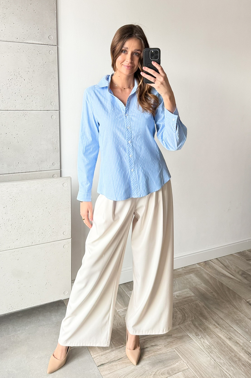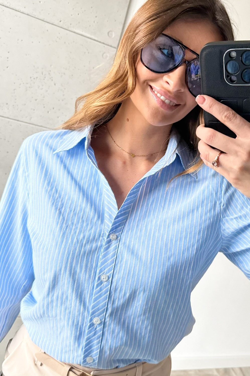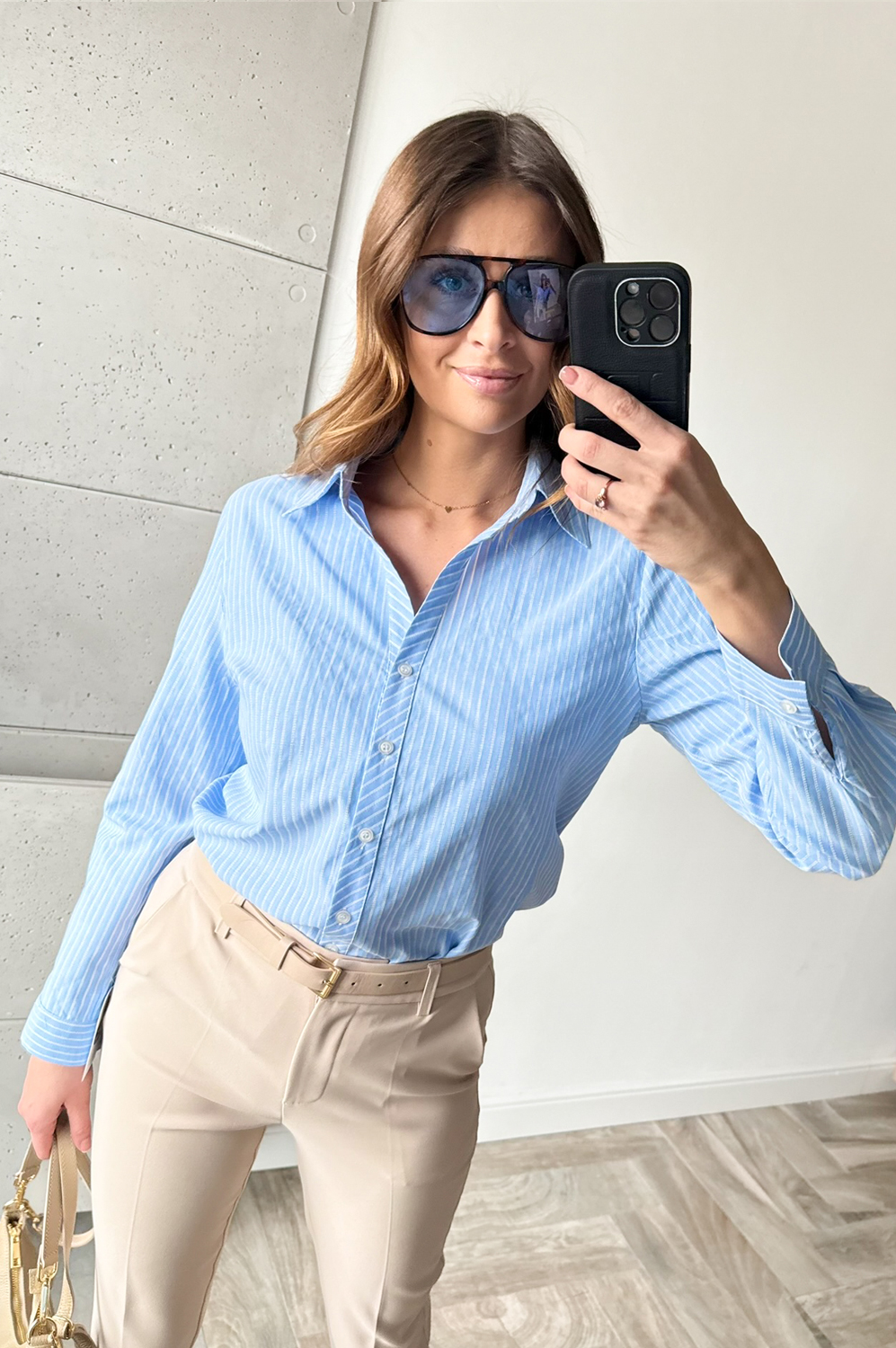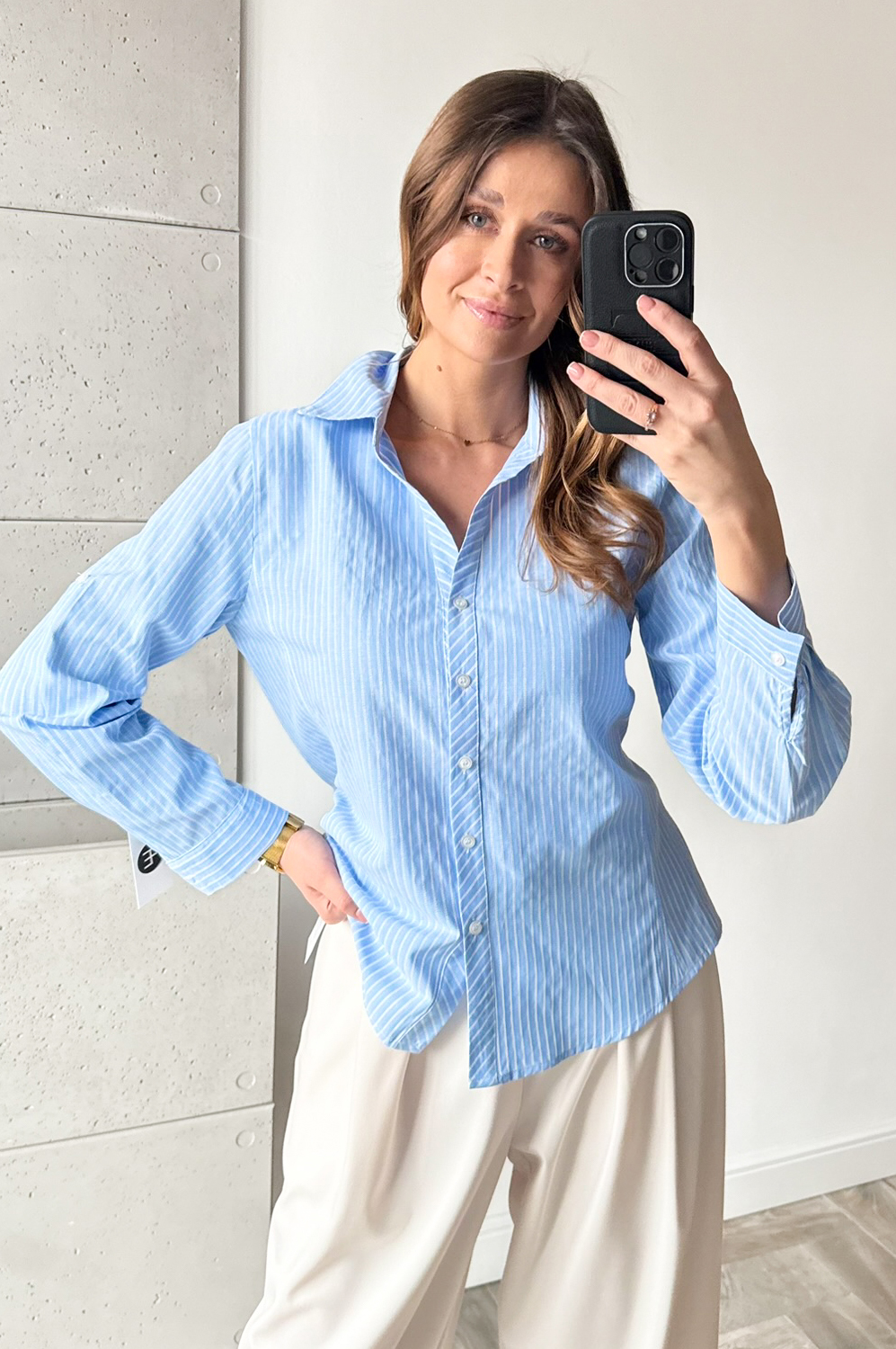 Bluzka koszulowa KLASYKA W PRĄŻEK139.00 zł Najniższa cena towaru, która obowiązywała w okresie 30 dni przed zastosowaniem obniżki: 139.00 zł Opis Klasyczna koszula w kolorze błękitu z delikatnym prążkiem,lekko taliowana,przy rękawach troszki do podwinięcia,idealnie nadaje się na stylizacje pod marynarkę oraz na sportowo SM długość 63cm,szerokość biust 100cm,pas 90cm,biodra 104cm.