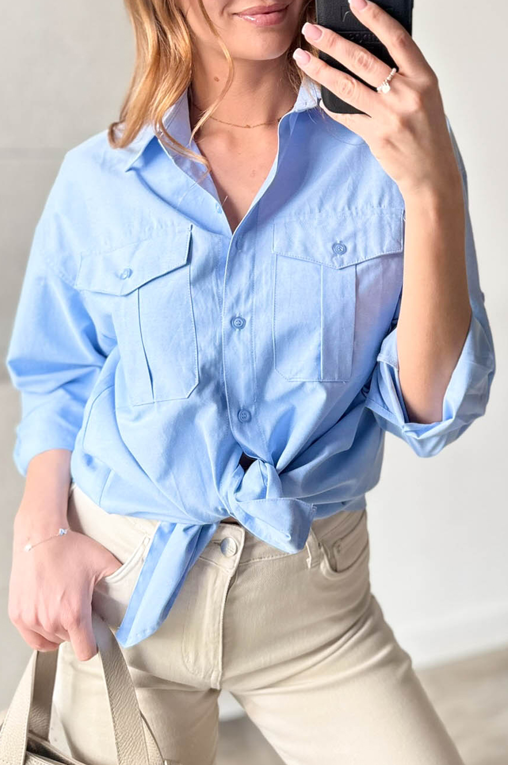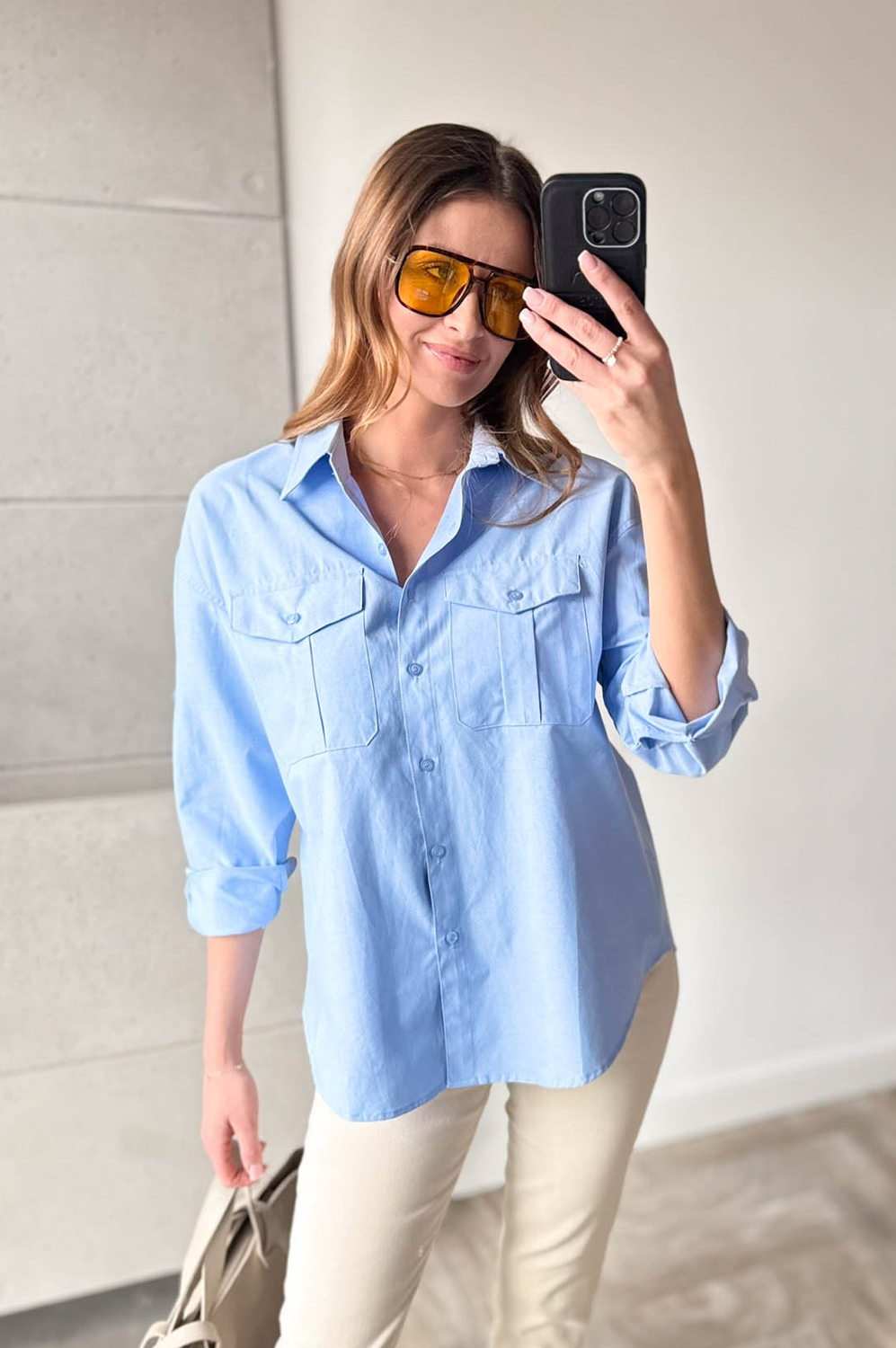 Bluzka koszulowa BIZNESOWA niebieska139.00 zł Najniższa cena towaru, która obowiązywała w okresie 30 dni przed zastosowaniem obniżki: 139.00 zł Opis Klasyczna koszula w kolorze błękitu, kieszenie na piersiach.