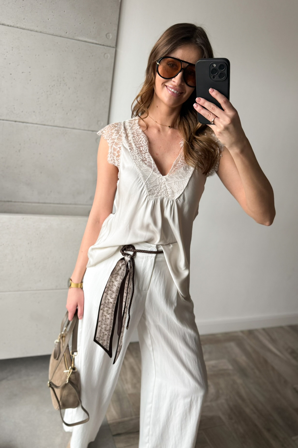 Bluzka SATYNA WISKOZOWA Z KORONKĄ beż129.00 zł Najniższa cena towaru, która obowiązywała w okresie 30 dni przed zastosowaniem obniżki: 129.00 zł Opis Koszulka na szerszych ramiączkach . Delikatne rękawki z koronki oraz szpic. WYMIARY: