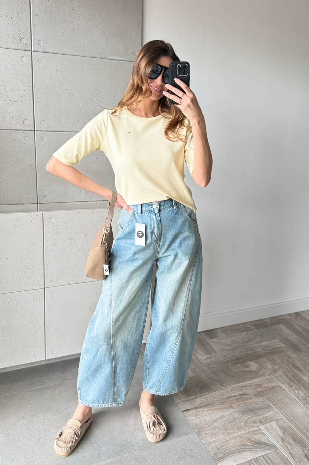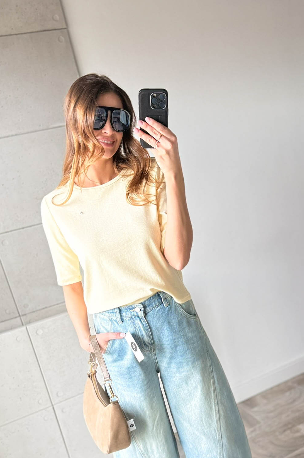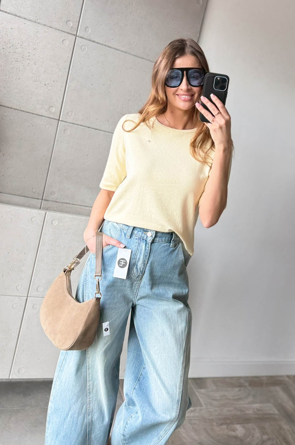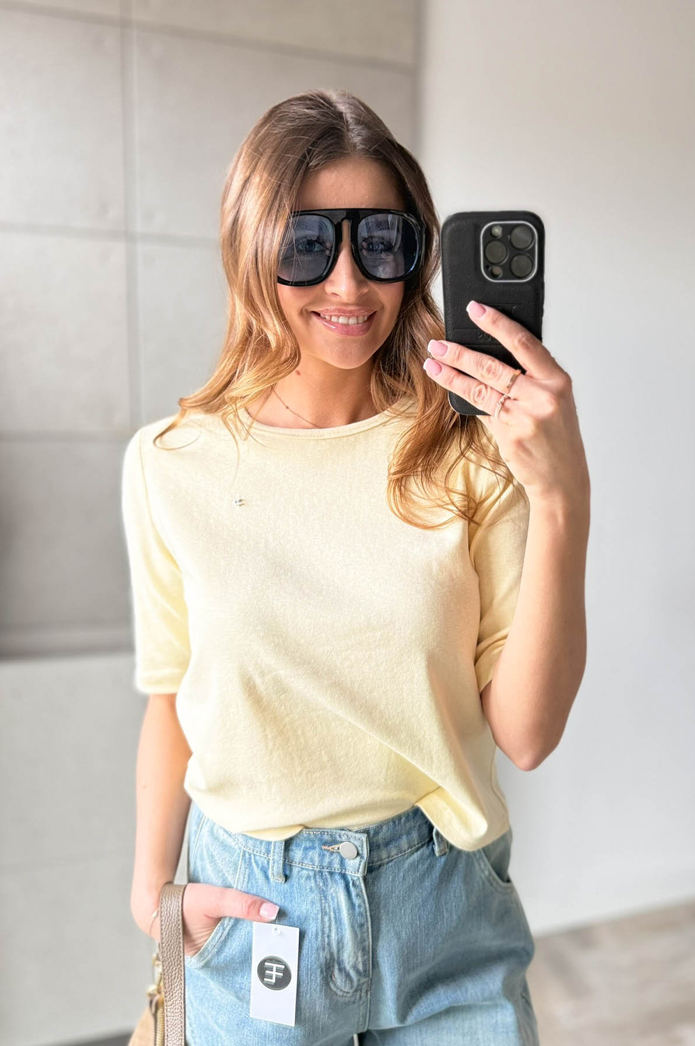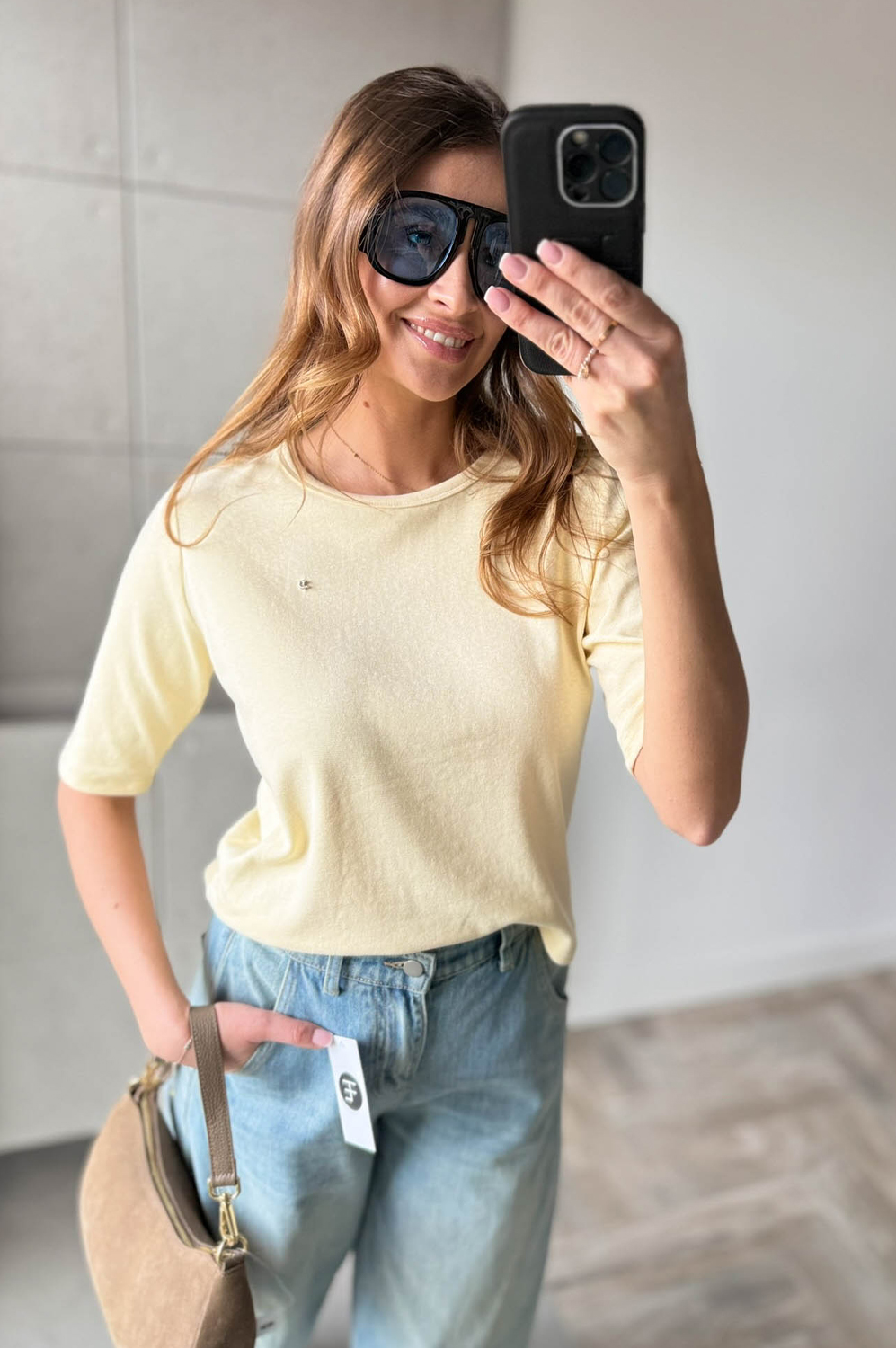 Bluzka YOY BASIC DO ŁOKCIA pastelowy banan99.00 zł Najniższa cena towaru, która obowiązywała w okresie 30 dni przed zastosowaniem obniżki: 99.00 zł Opis Bluzka z krótkim rękawem z delikatnej, bardzo elastycznej i miękkiej bawełny, typowy basic pod marynarkę oraz innych ciekawych stylizacji. ZASADY KONSERWACJI : PRAĆ W TEMPERATURZE 30 stopni.