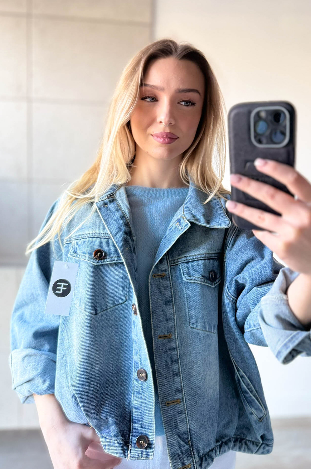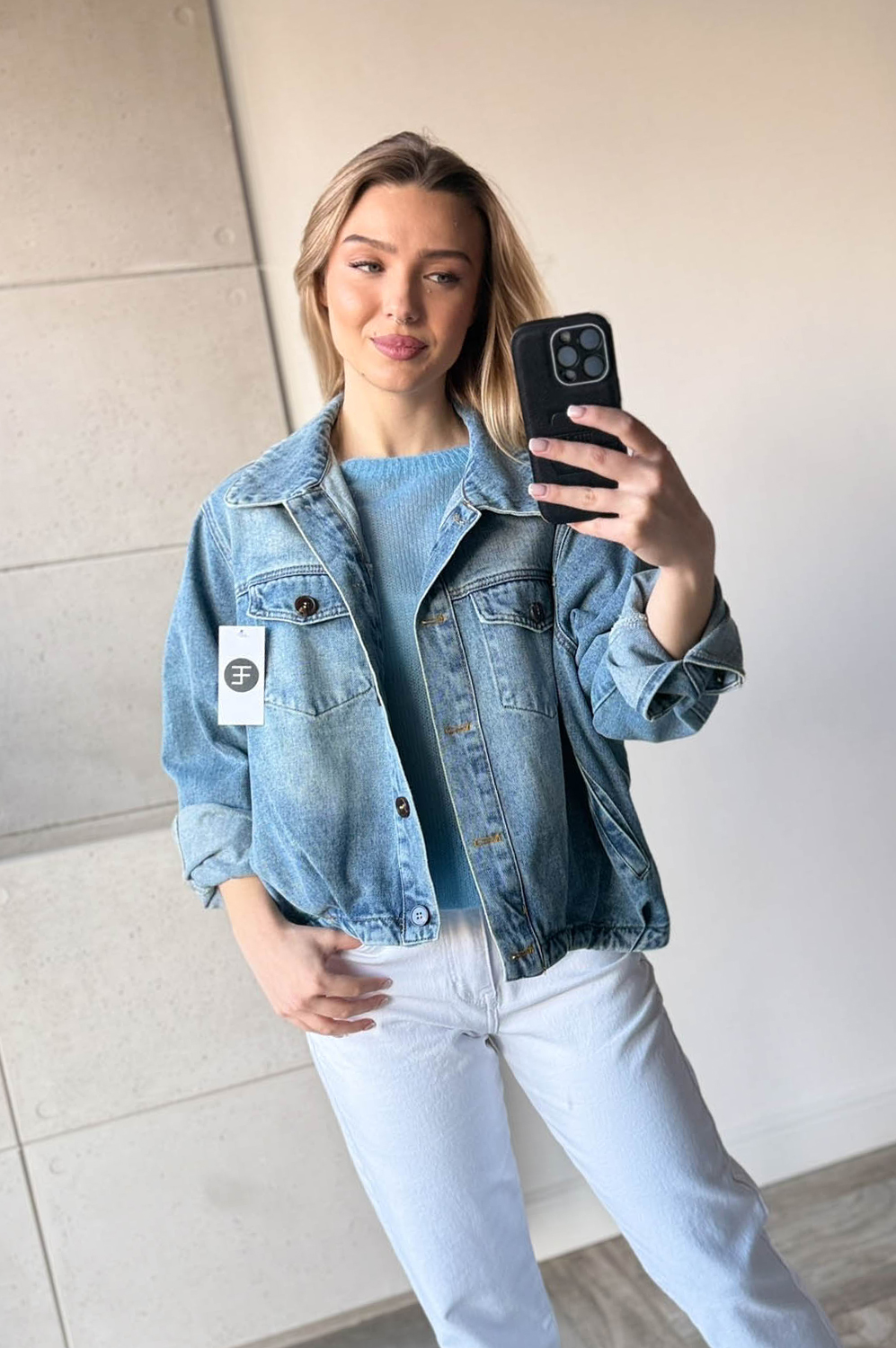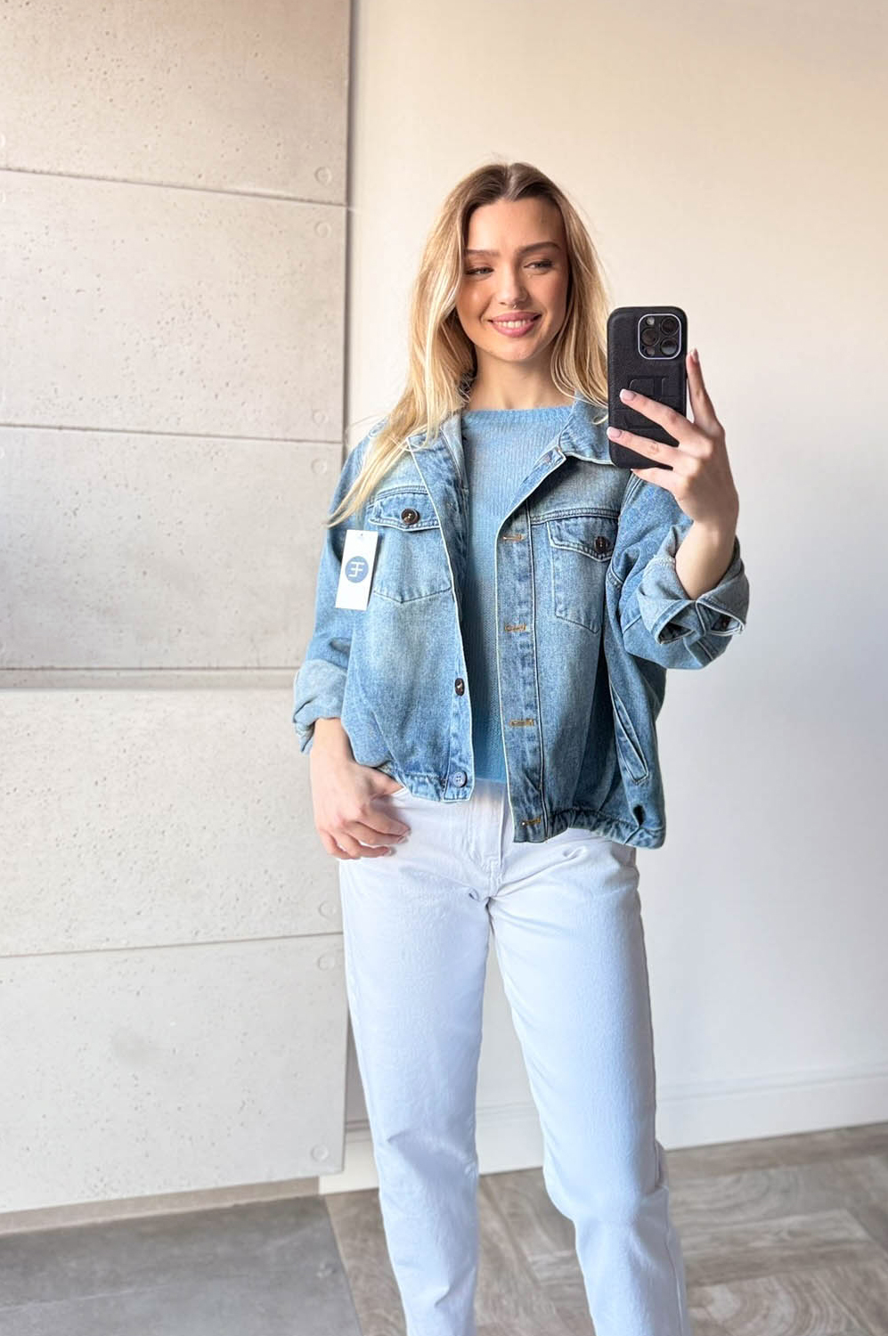 Kurtka jeansowa oversizowa ,zapinana na napy,na dole posiada gumkę .