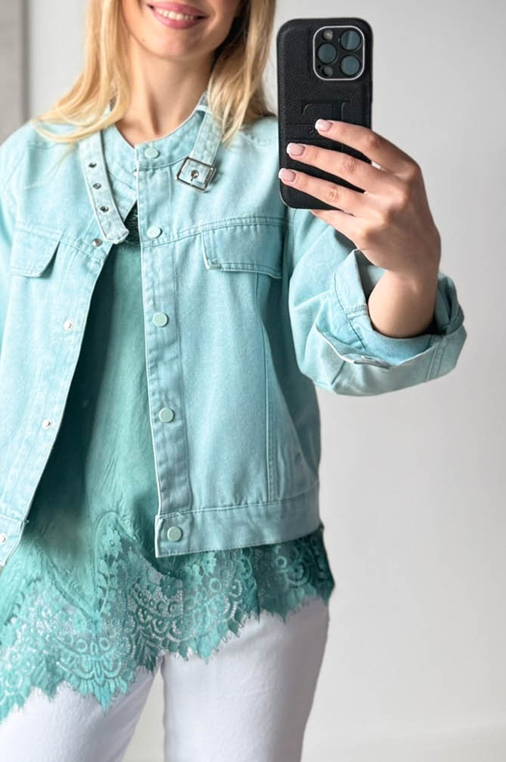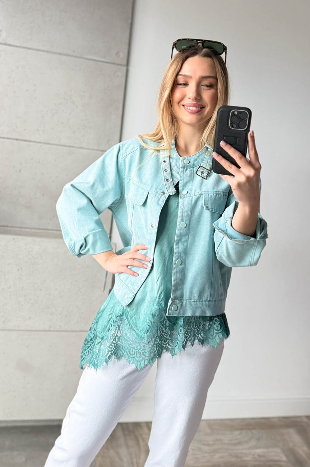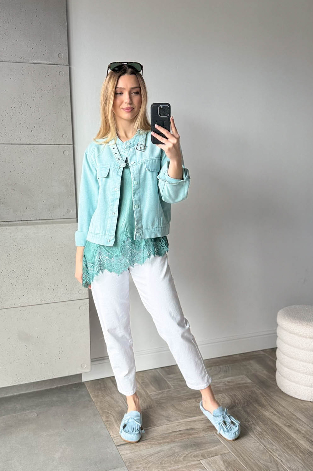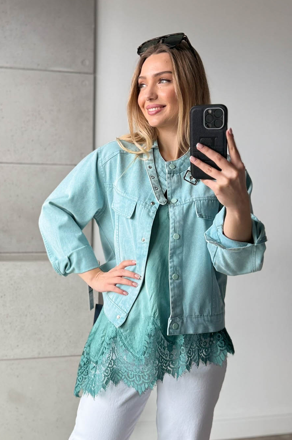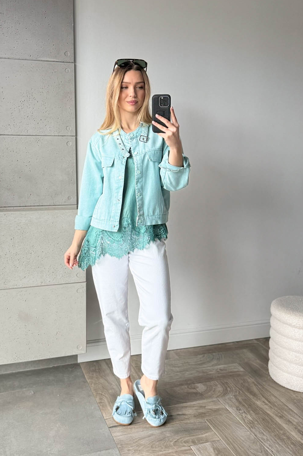 Kurtka JEANS KLAMRA turkus199.00 zł Najniższa cena towaru, która obowiązywała w okresie 30 dni przed zastosowaniem obniżki: 199.00 zł Opis Kurtka jeansowa, zapinana na napy. WYMIARY: DŁ.58cm SZER.104cm