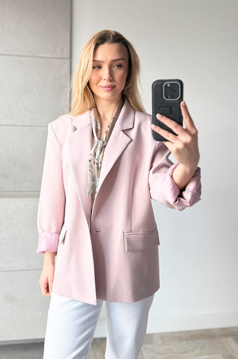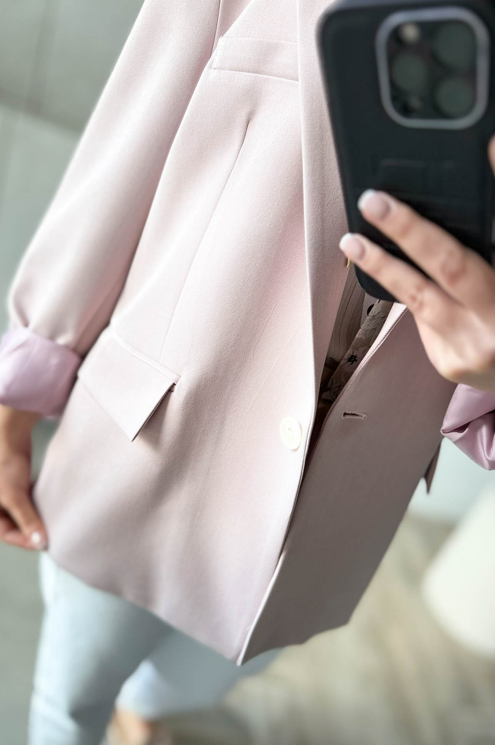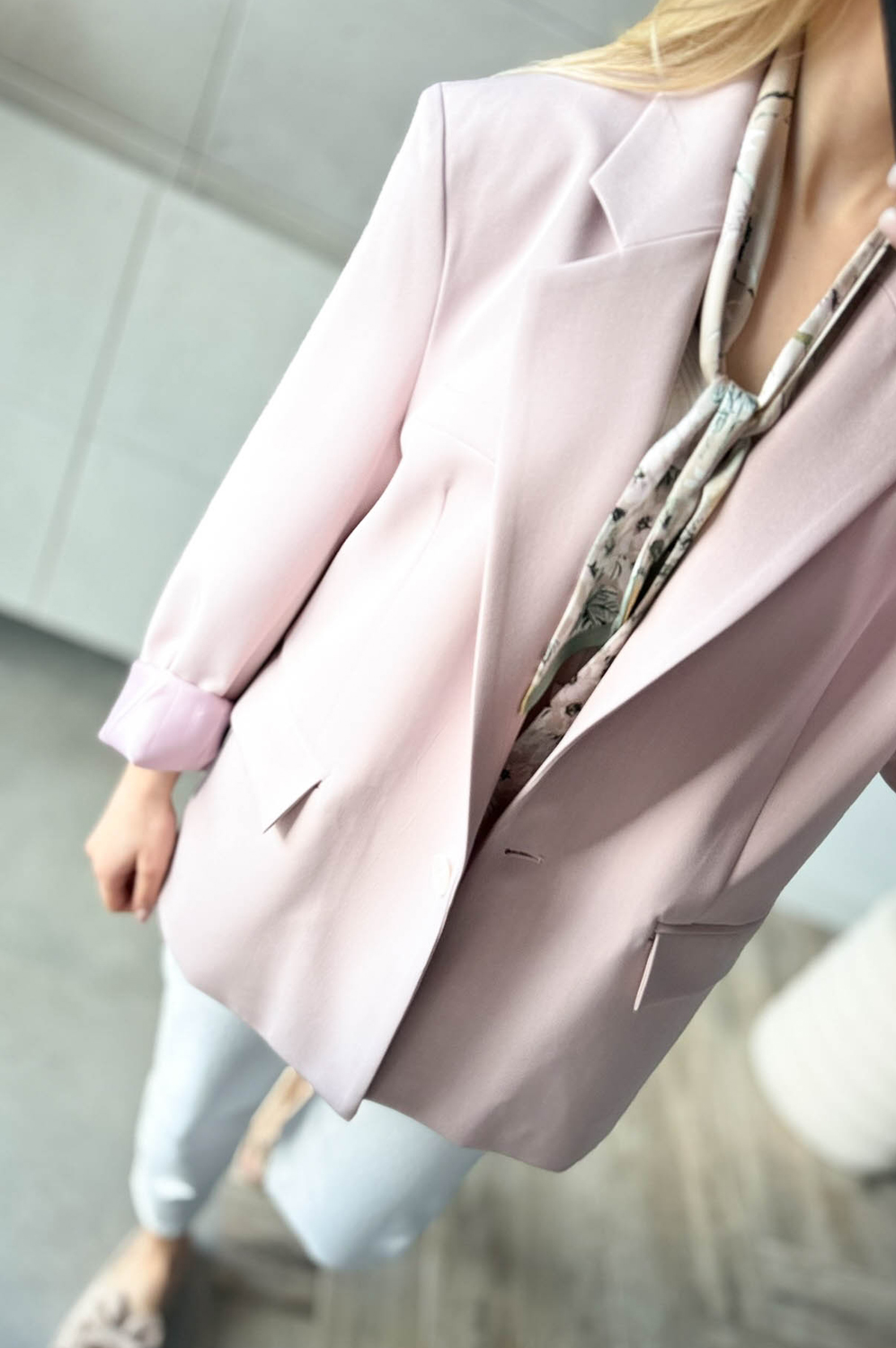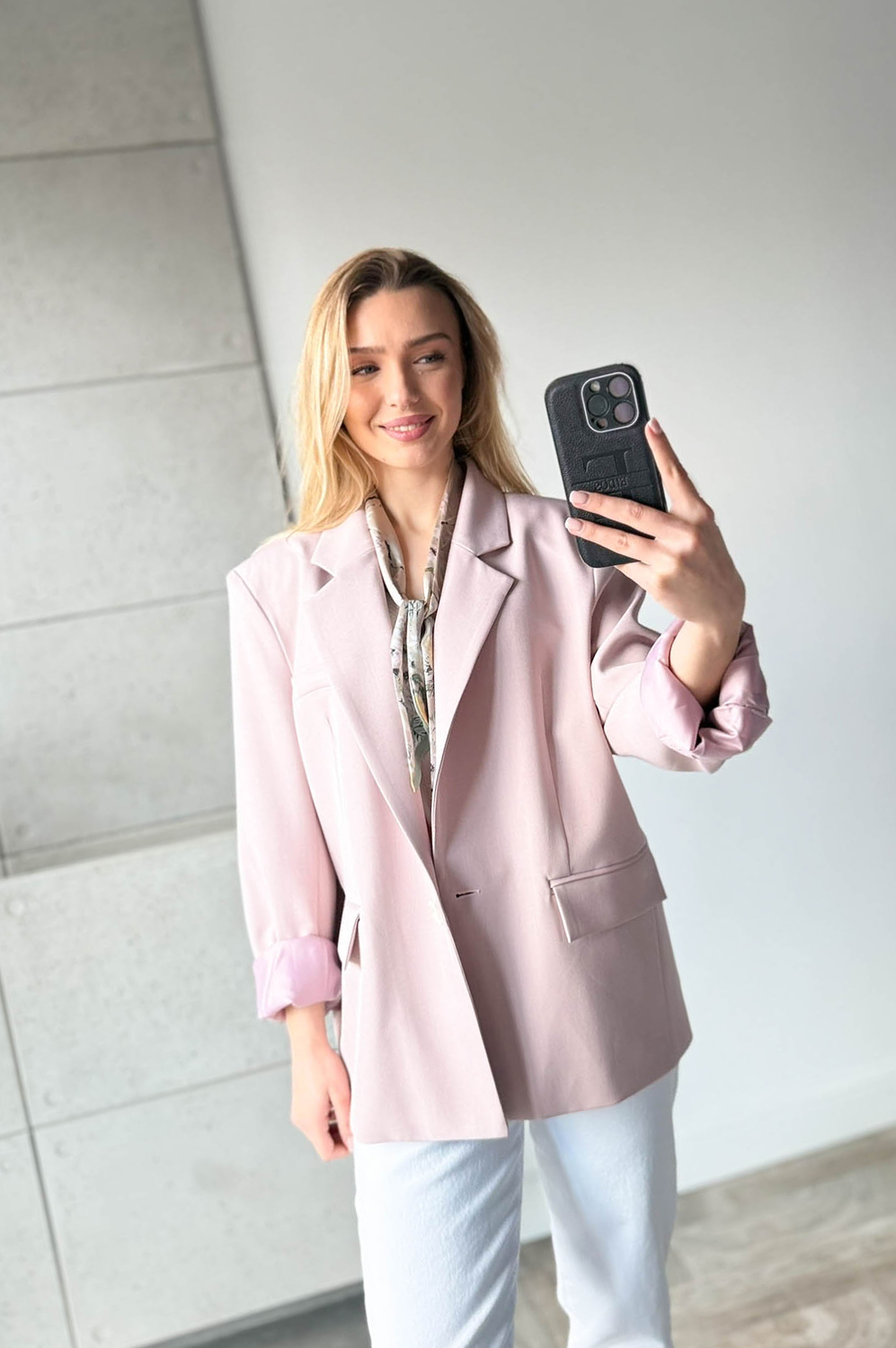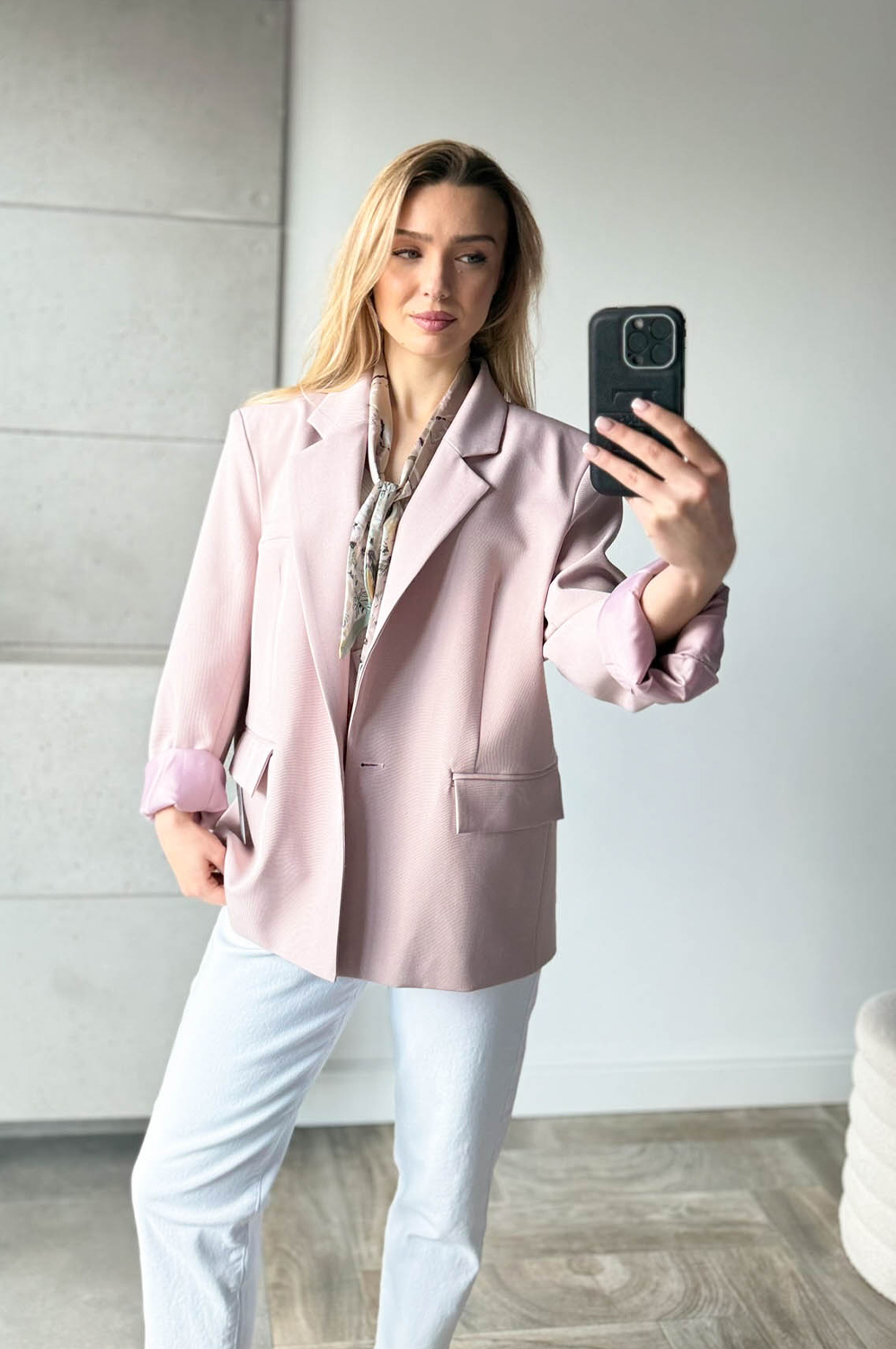 Marynarka OVERSIZE jagoda z mlekiem249.00 zł Najniższa cena towaru, która obowiązywała w okresie 30 dni przed zastosowaniem obniżki: 249.00 zł Opis Modowa marynarka na podszewce, zapinana na guziczki, posiada kieszenie i ozdobne podwójne obłożenie. szerokoe ramiona. WYMIARY: