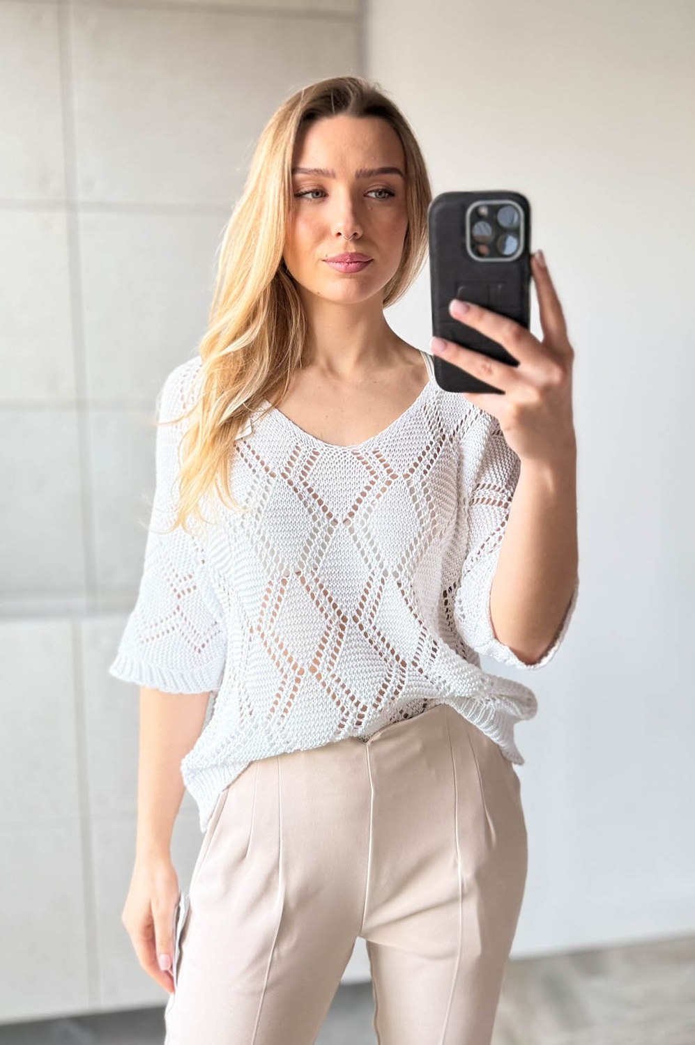 Sweterek ROMBY śmietanka119.00 zł Najniższa cena towaru, która obowiązywała w okresie 30 dni przed zastosowaniem obniżki: 119.00 zł Opis Sweterek z krótkim rękawkiem i dekoltem w szpic. Sweterek jest miękki i przyjemny w dotyku. Przewiewny i wykonany z bawełny. WYMIARY: długość: 62 cm, szerokość: 100-106 cm